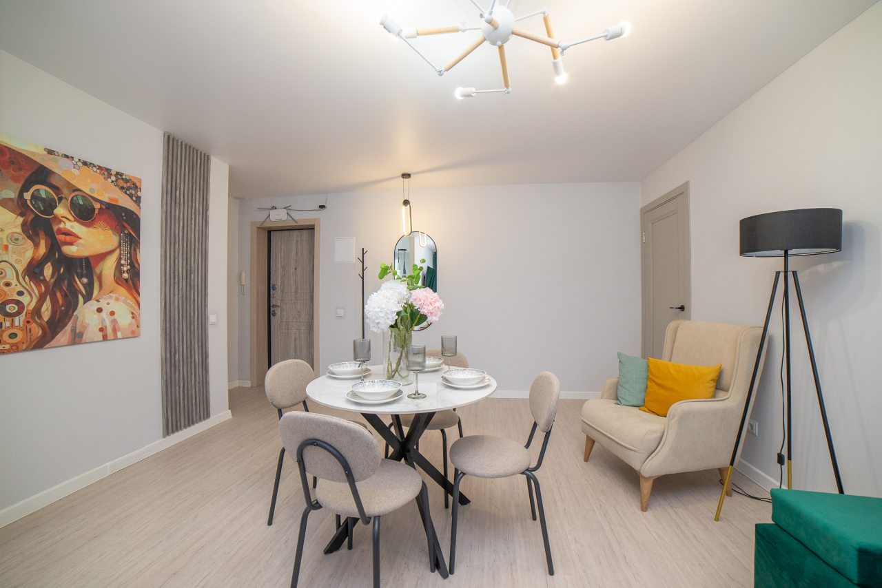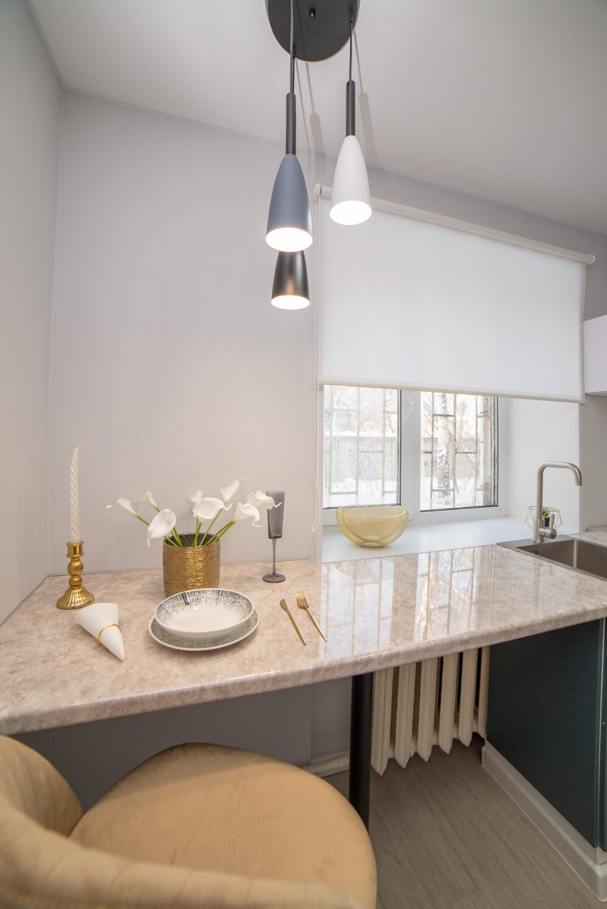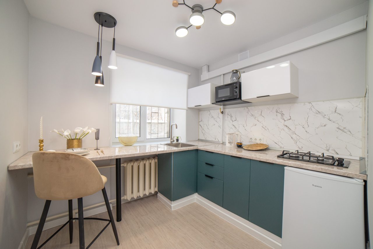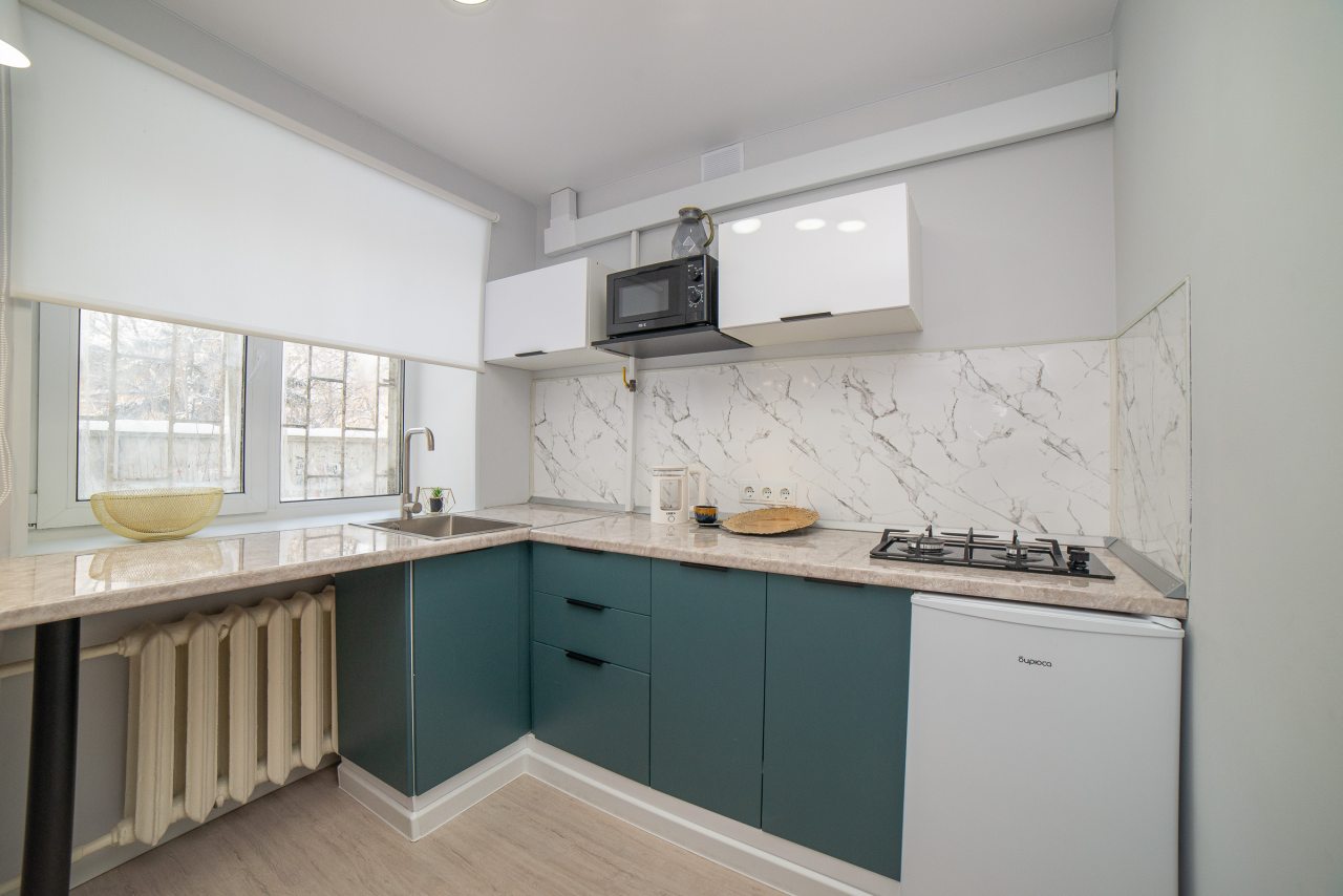 Просторная кухня оборудована стильным гарнитуром, газовой плитой, холодильником, микроволновой печью, электрочайником. Пообедать можно в ближайшем кафе. В доступности большой выбор продовольственных магазинов.