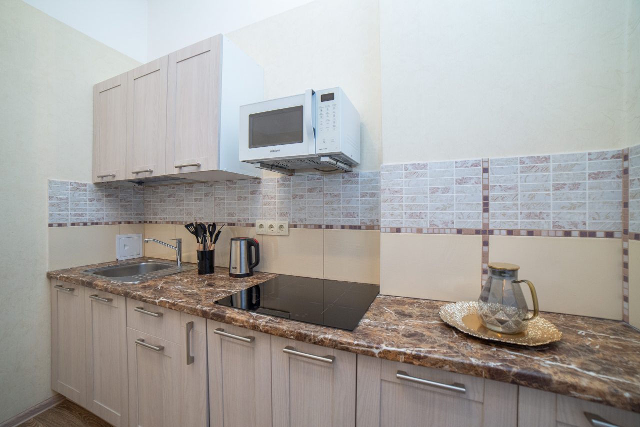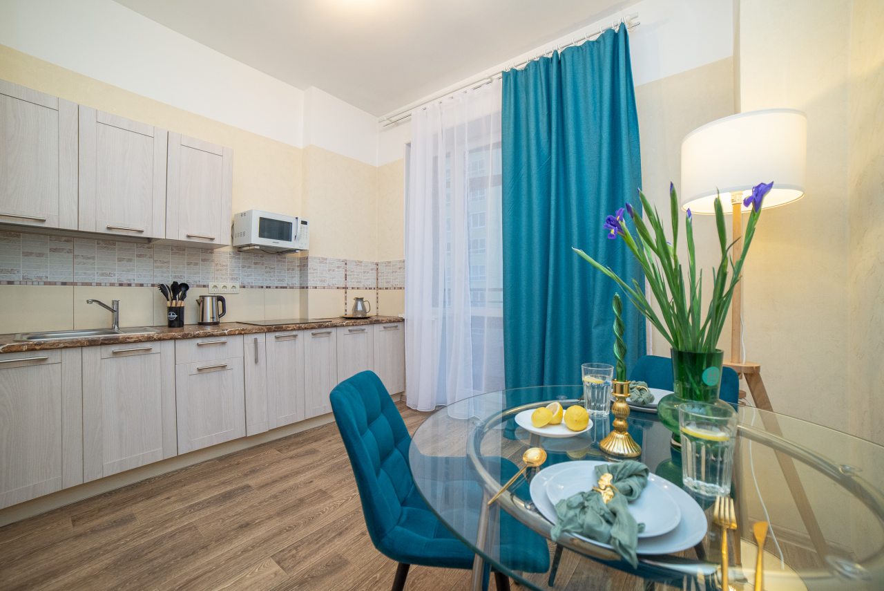 На просторной кухне будет удобно готовить любимые блюда и напитки, так как в наличии варочная панель, СВЧ, чайник, холодильник, красивая обеденная зона.
