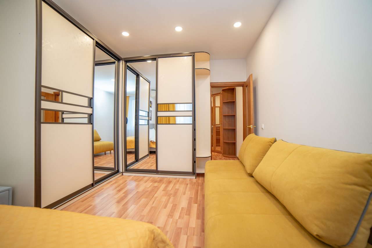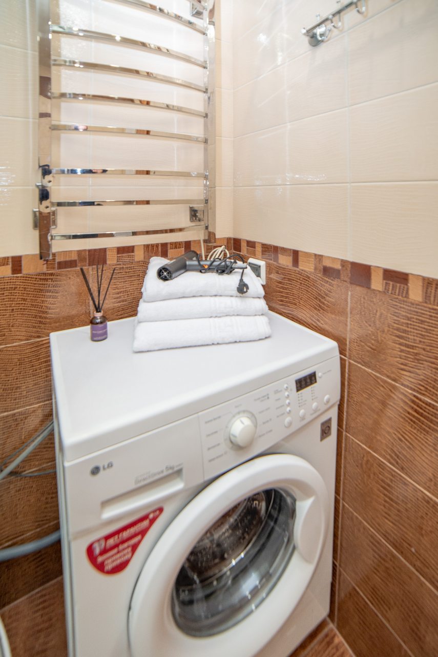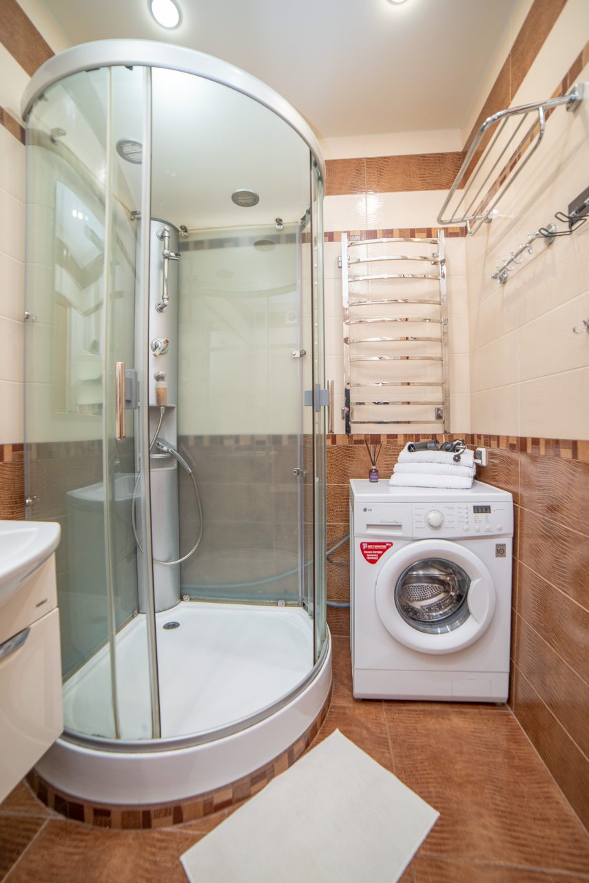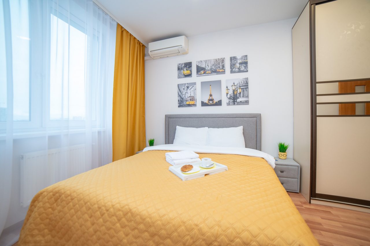 Внутри всё продумано для комфорта гостей, включая удобную двуспальную кровать, мягкий диван с телевизором, вместительные шкафы, санузел со стиральной машиной, полотенцами и феном.