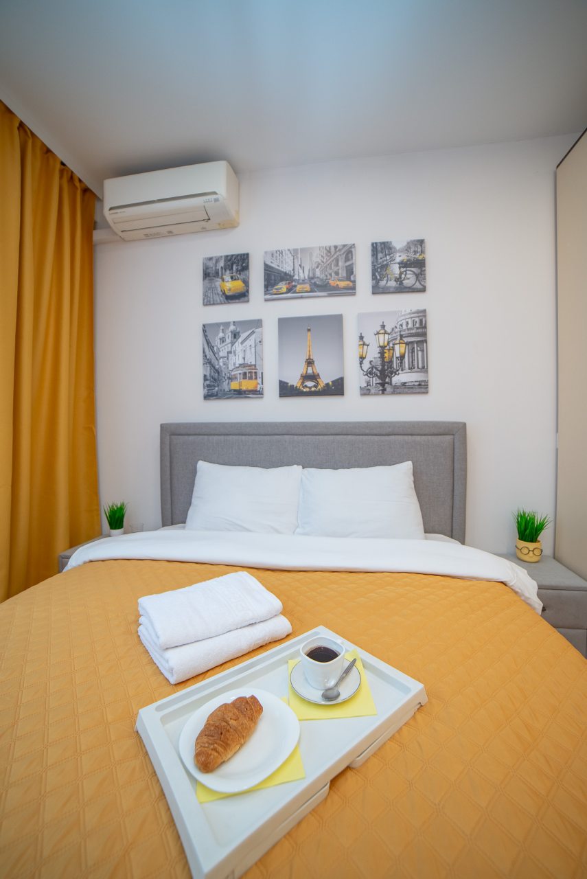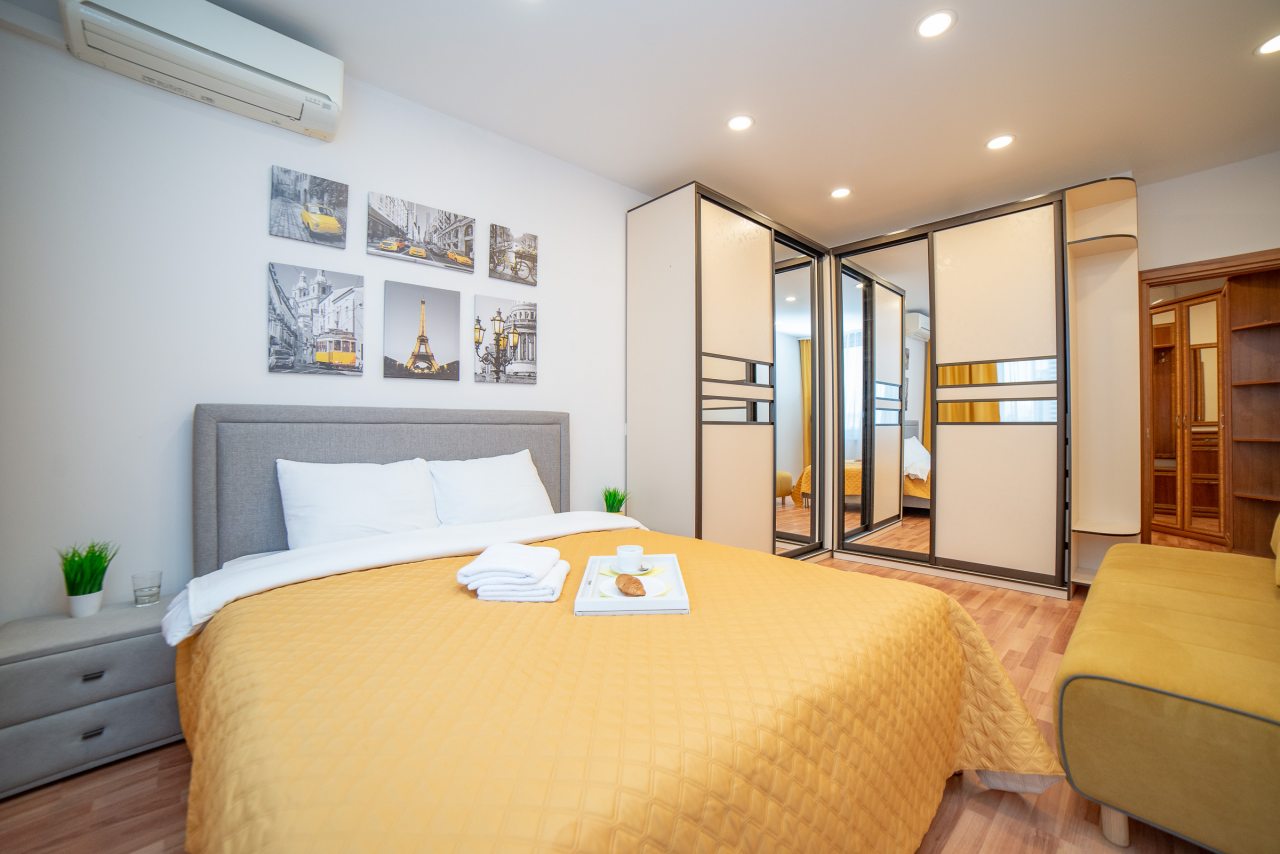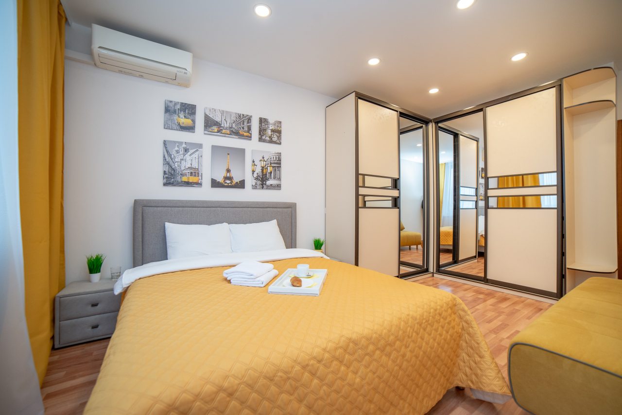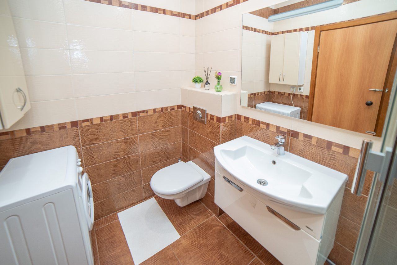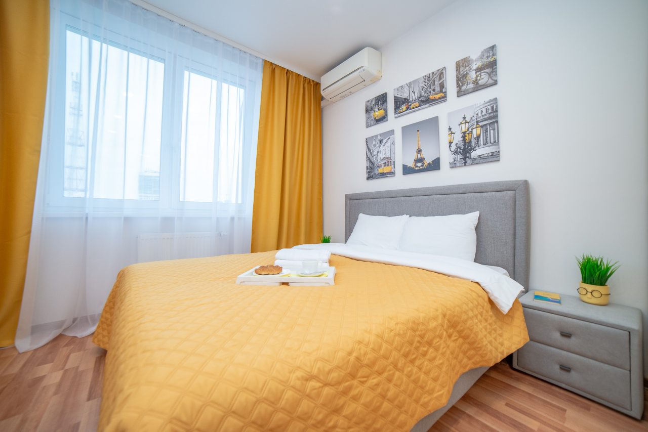 Внутри всё продумано для комфорта гостей, включая удобную двуспальную кровать, мягкий диван с телевизором, вместительные шкафы, санузел со стиральной машиной, полотенцами и феном.