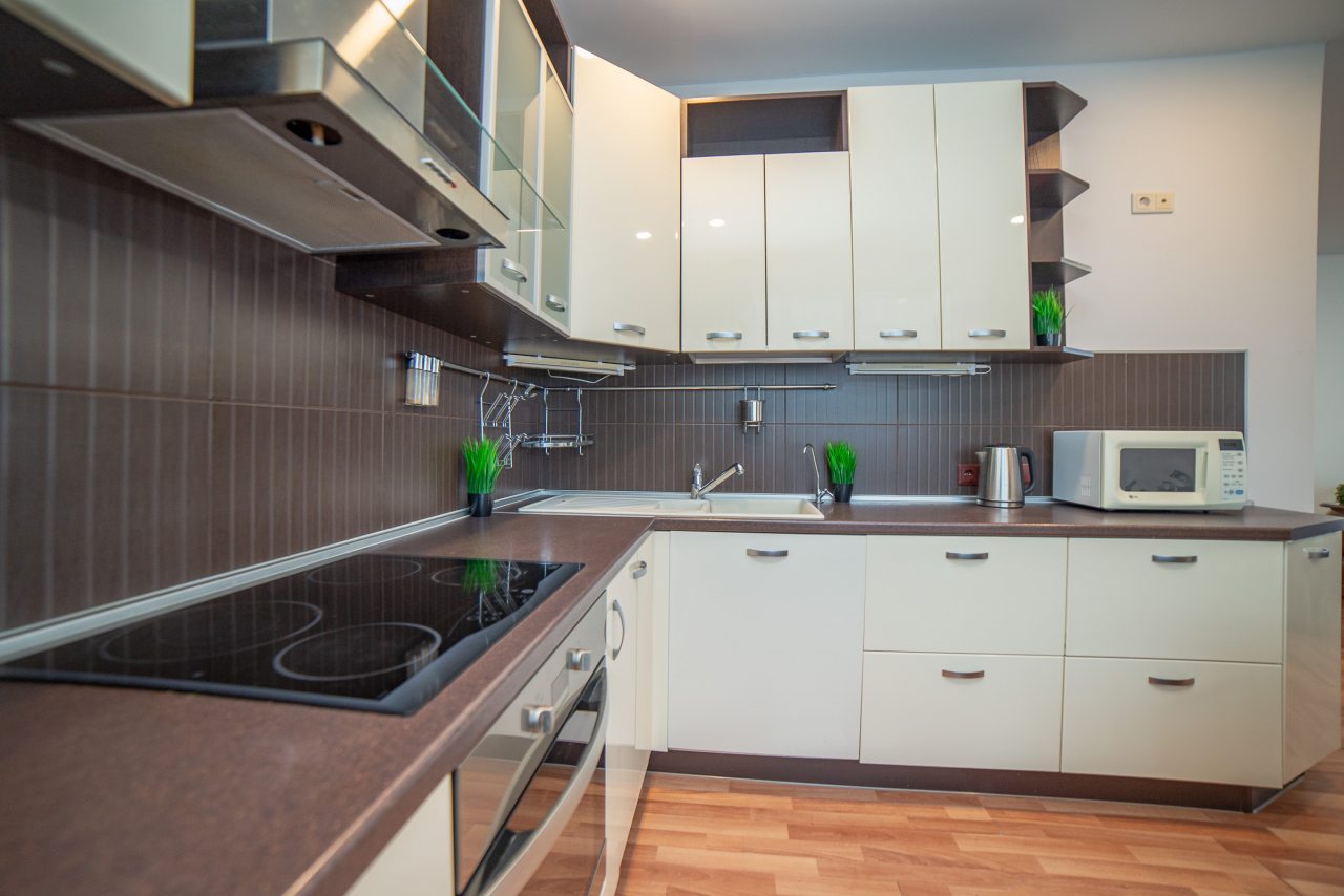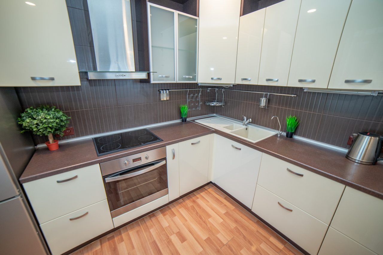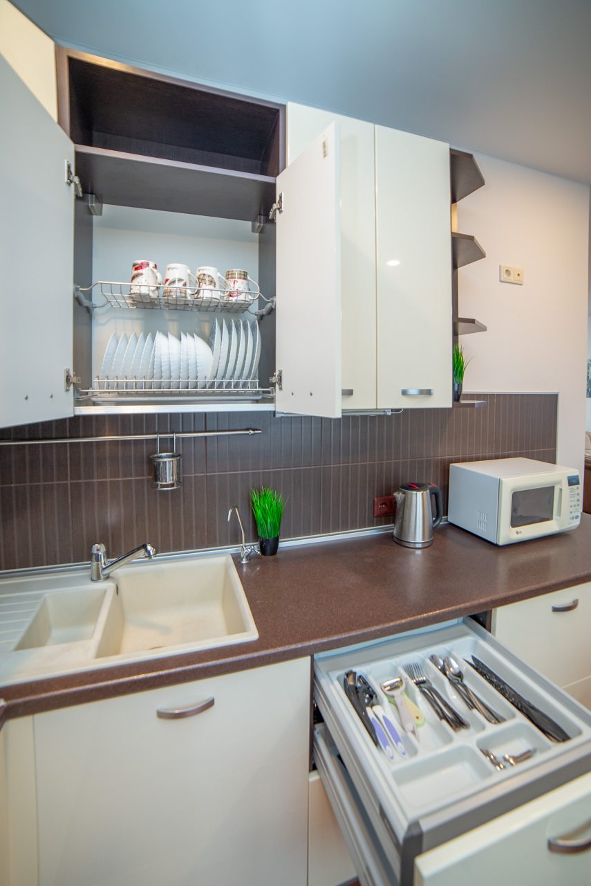 На кухне будет приятно готовить любимые домашние блюда, так как в наличии духовой шкаф, плита, СВЧ-печь, разнообразная посуда, чайник, красивая обеденная зона.