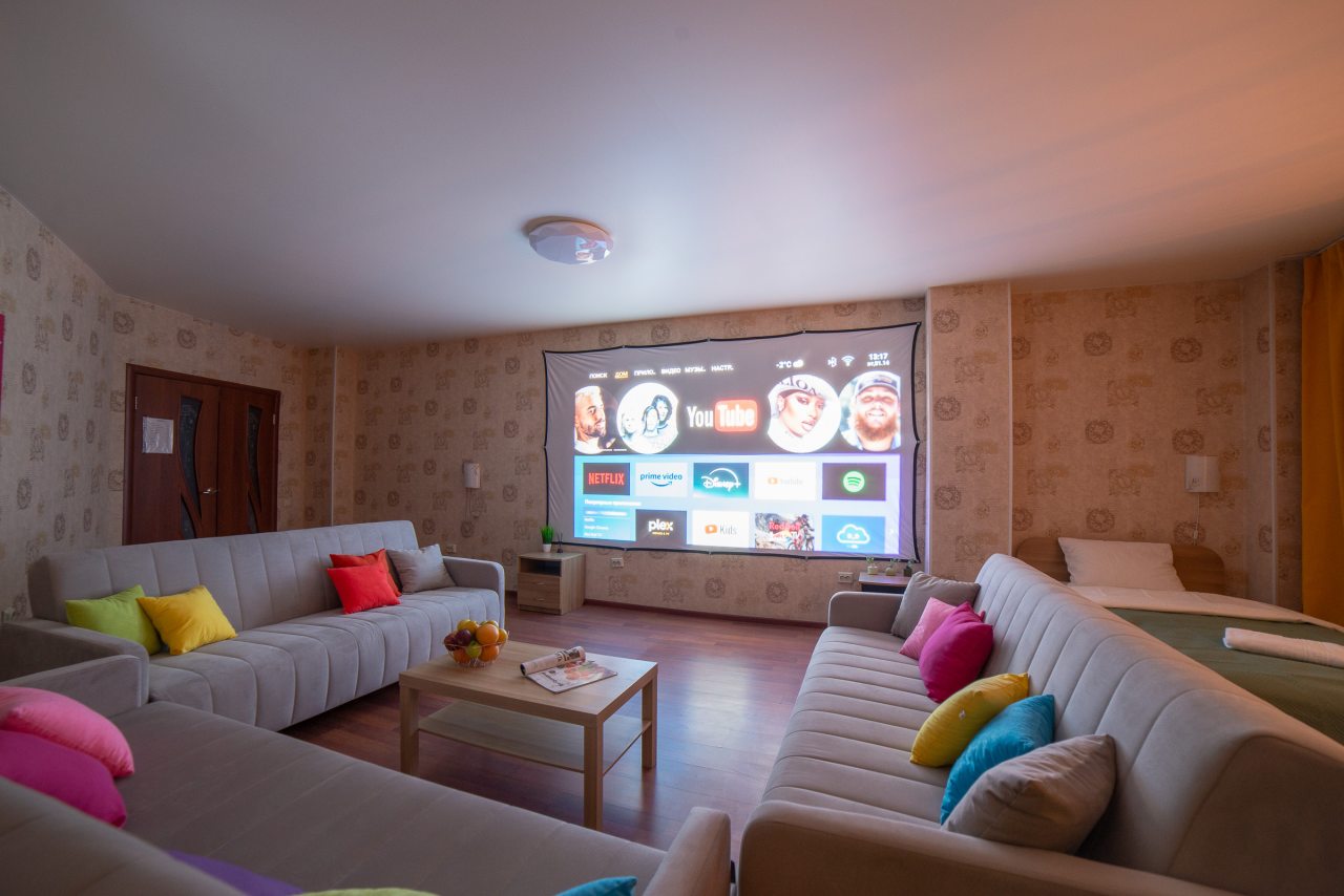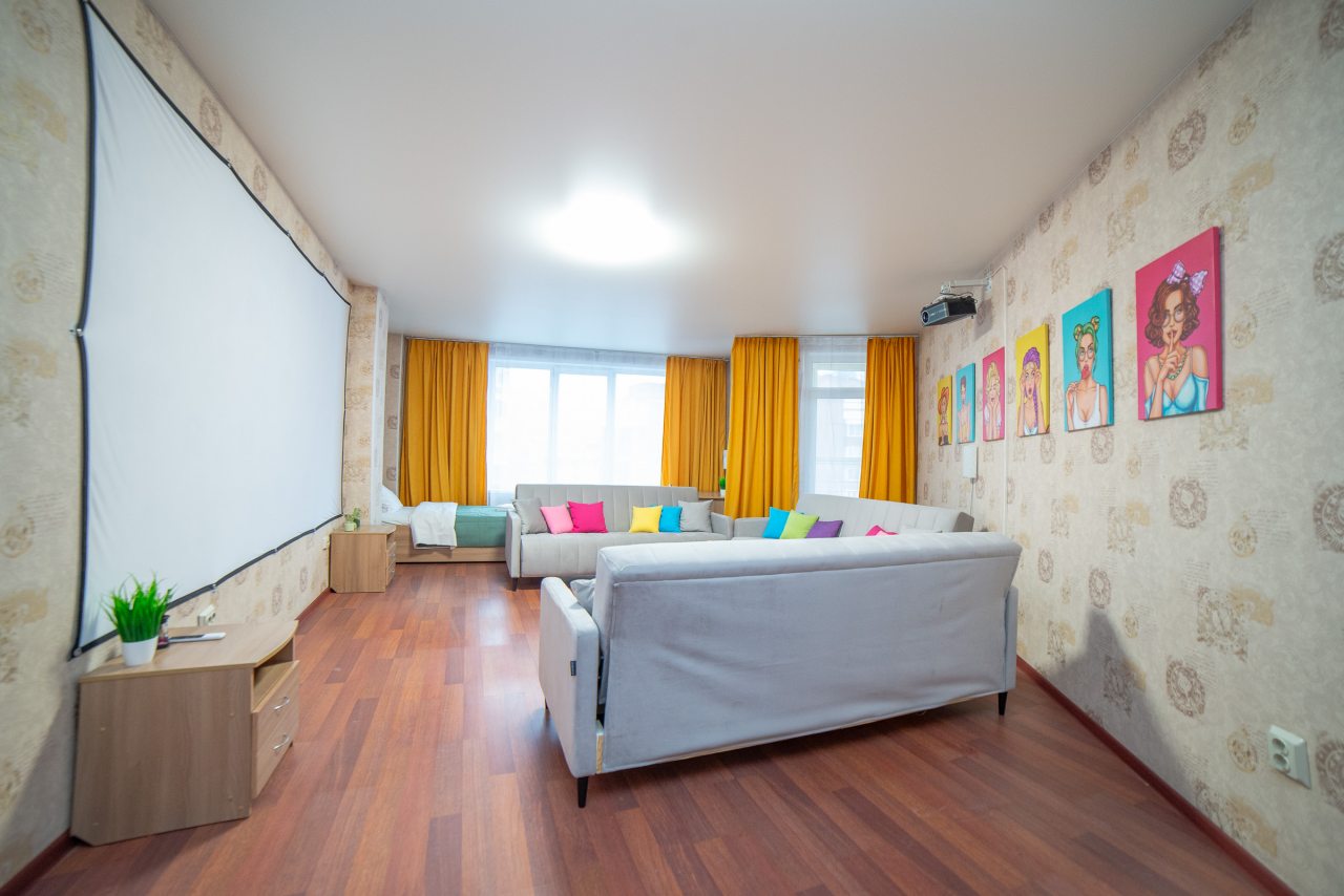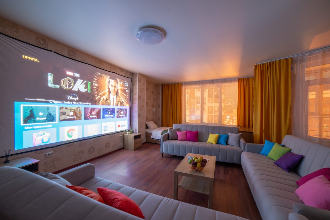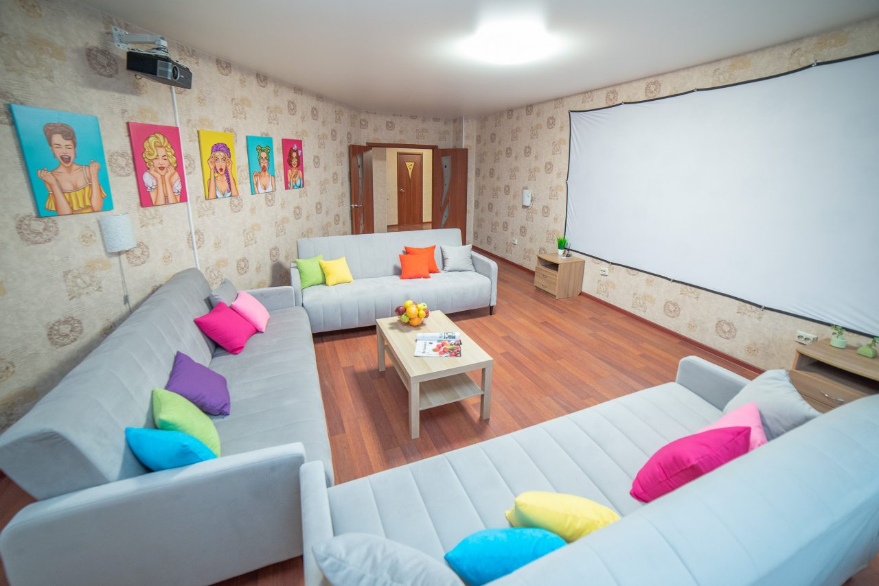 Для отдыха и проживания предоставляется трехкомнатная квартира с современным ремонтом и стильным дизайном, в которой могут разместиться как большая семья, так и компания друзей. В качестве удобств установлены кровати и прикроватная мебель. Отдыхающие могут смотреть свои любимые фильмы на проекторе, расположившись на просторном диване. Из техники также установлены кондиционер, стиральная машина.
