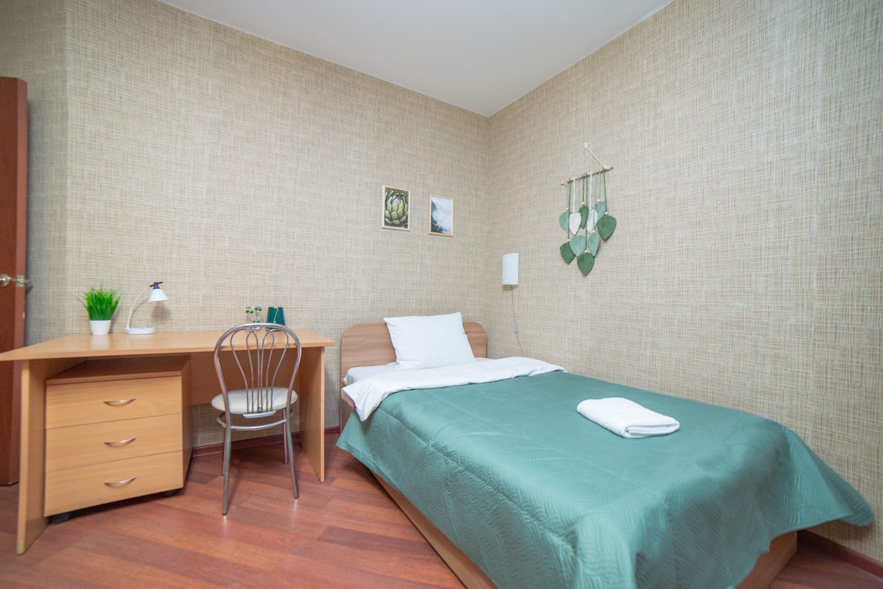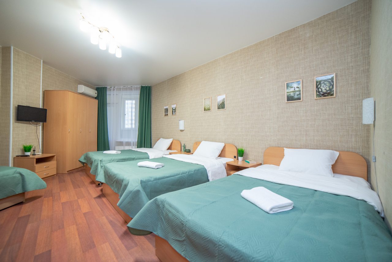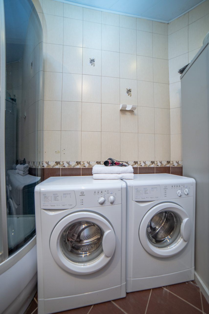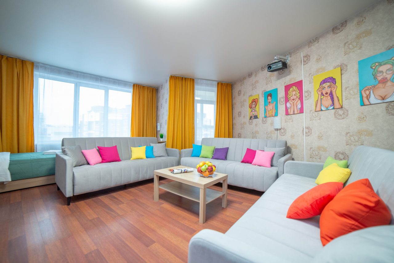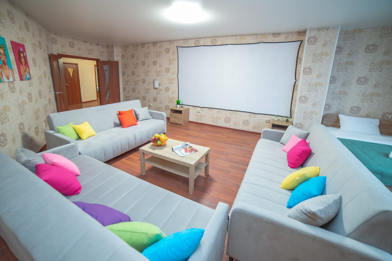 Для отдыха и проживания предоставляется трехкомнатная квартира с современным ремонтом и стильным дизайном, в которой могут разместиться как большая семья, так и компания друзей. В качестве удобств установлены кровати и прикроватная мебель. Отдыхающие могут смотреть свои любимые фильмы на проекторе, расположившись на просторном диване. Из техники также установлены кондиционер, стиральная машина.