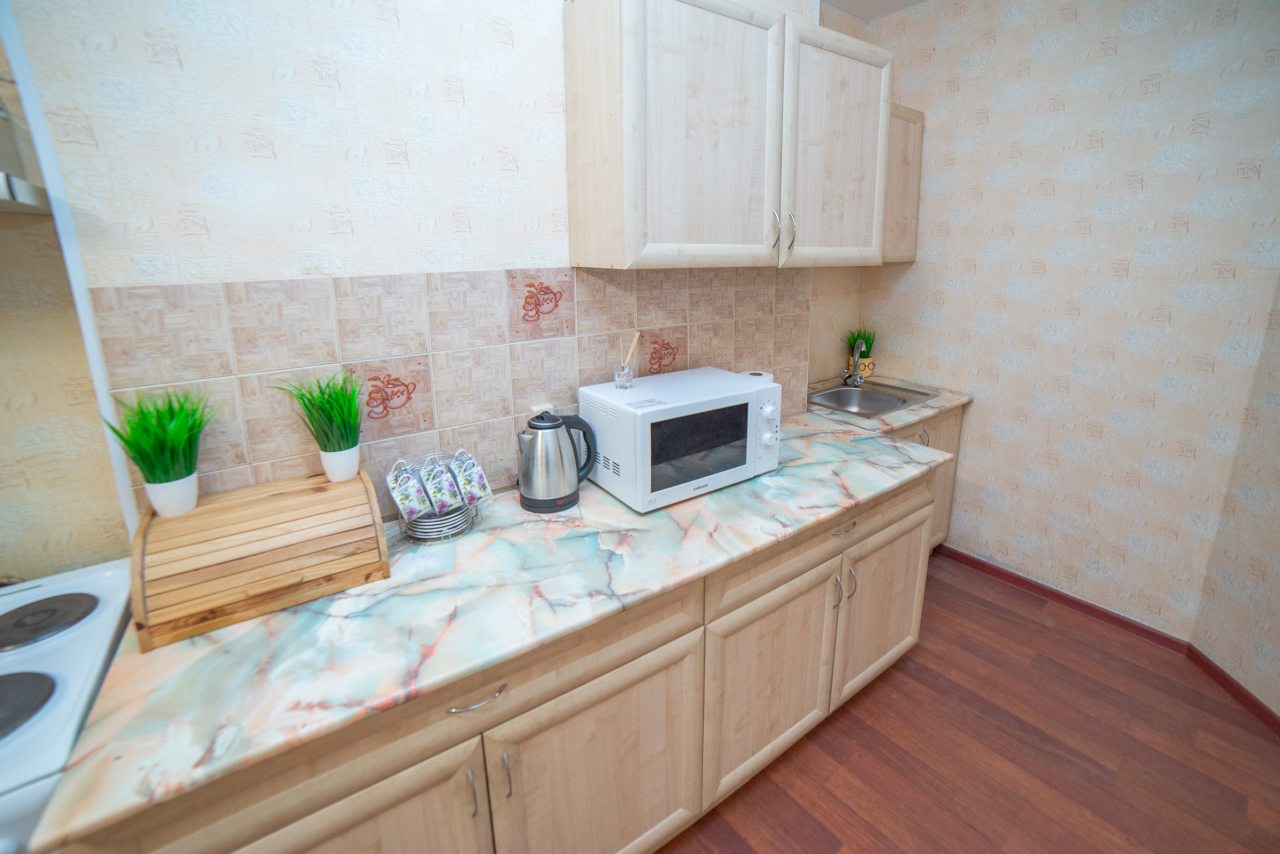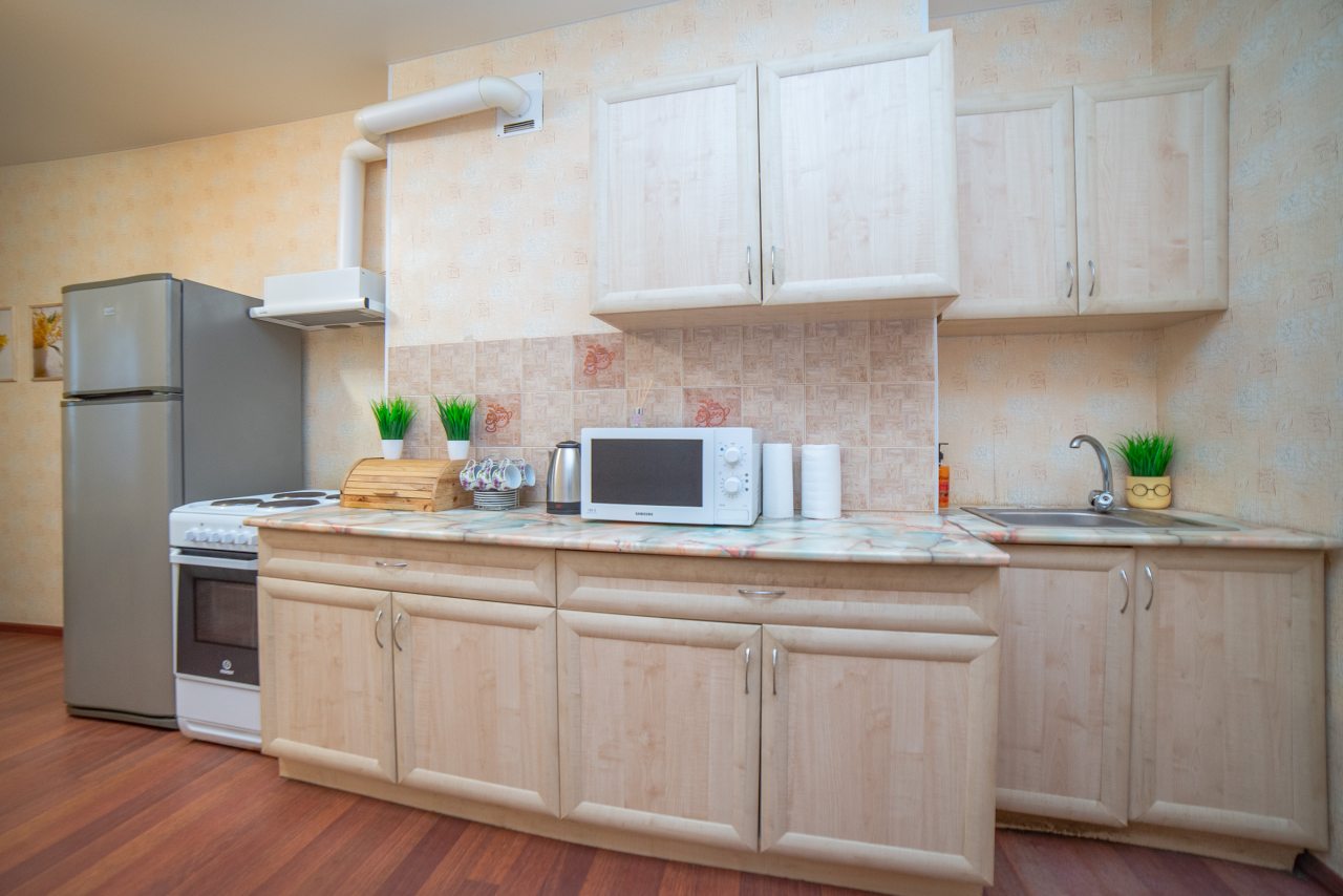 На кухонной зоне есть все необходимые принадлежности и бытовая техника для самостоятельного приготовления еды. В непосредственной близости к апартаментам расположены кафе и магазины.
