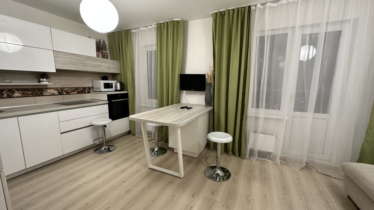Кухонная зона оснащена духовым шкафом, варочной панелью, СВЧ-печью, холодильником, чайником, уютной обеденной зоной.
