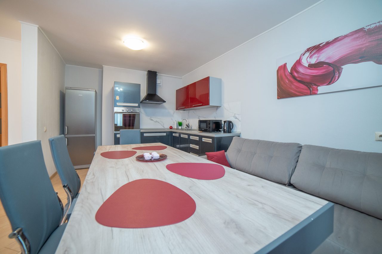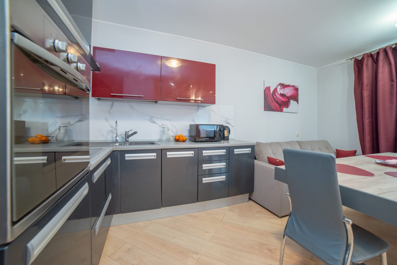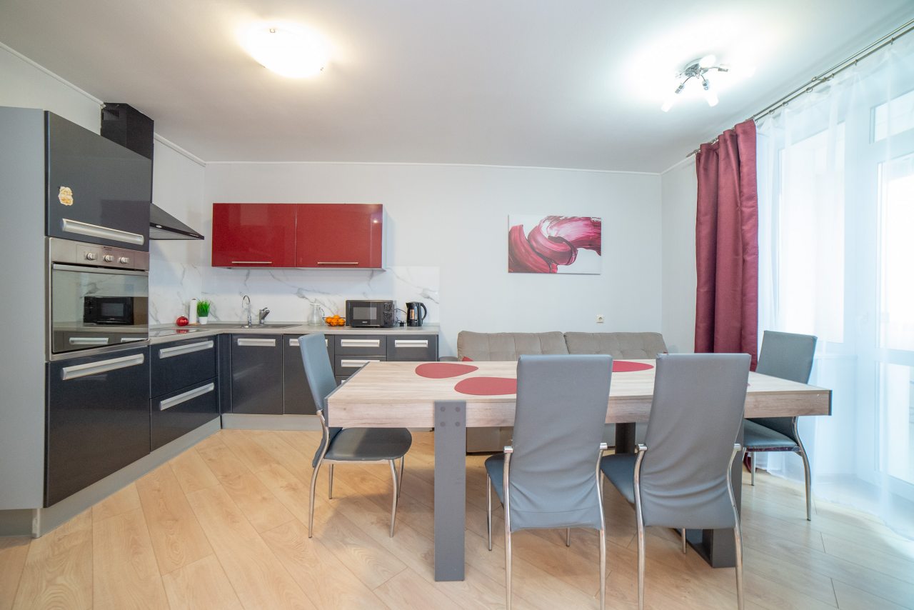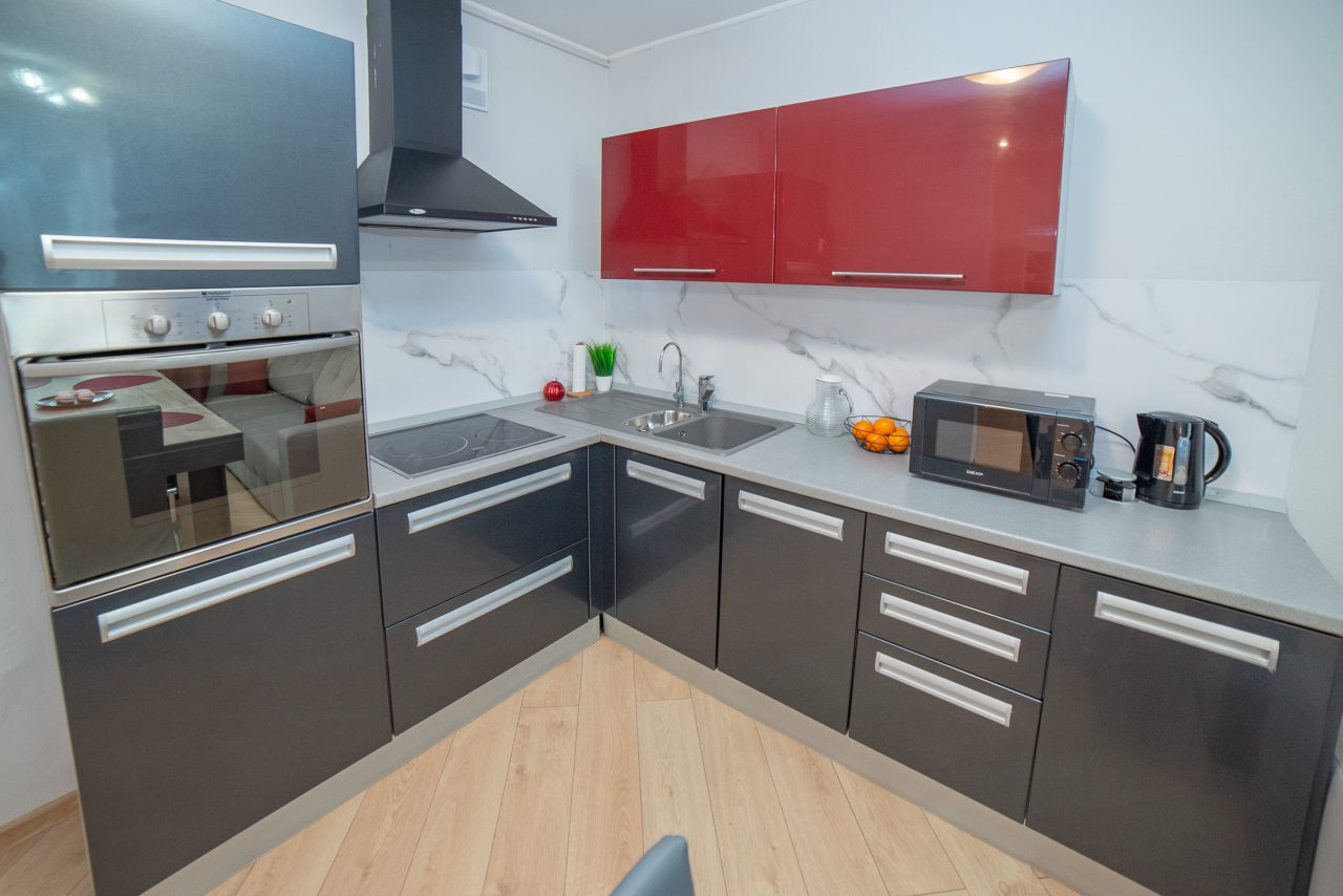 На современной кухне будет приятно готовить любимые домашние блюда и напитки, так как в наличии плита, вытяжка, СВЧ-печь, духовой шкаф, холодильник, чайник, уютная обеденная зона.