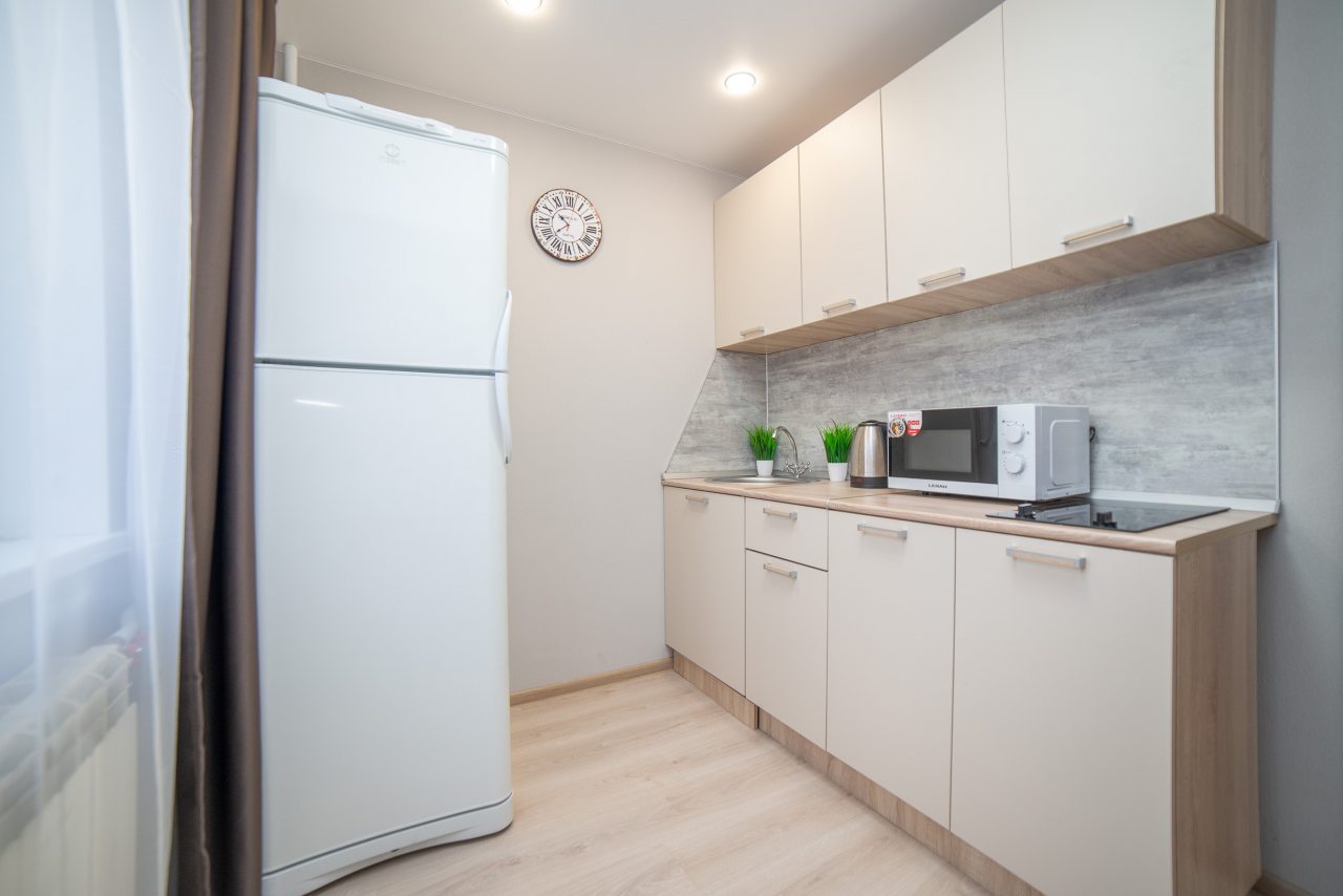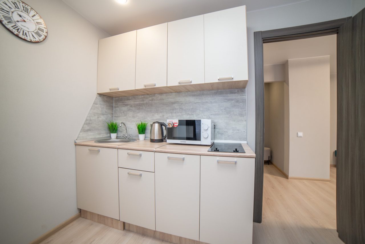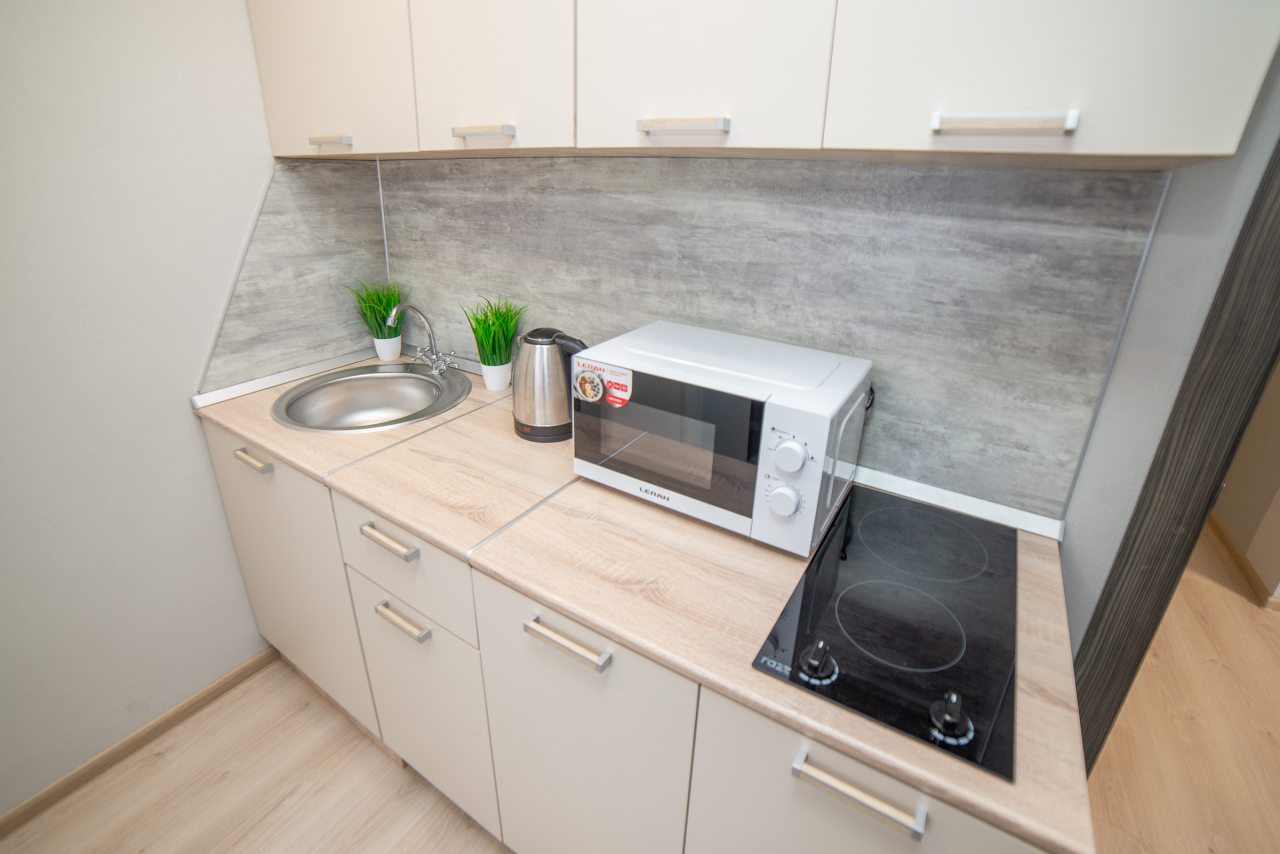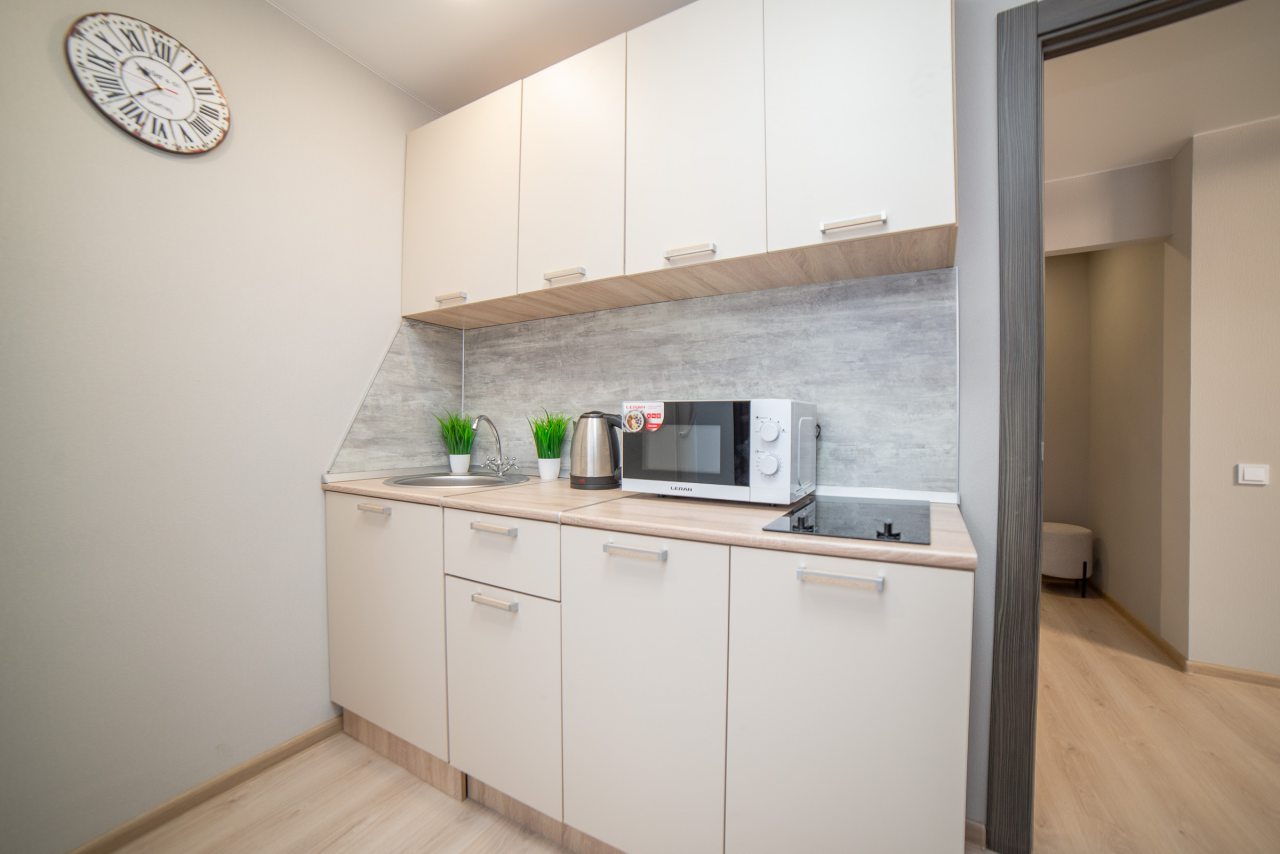 На уютной кухне будет приятно готовить домашние блюда, так как в наличии варочная панель, СВЧ-печь, холодильник, чайник, обеденная зона.