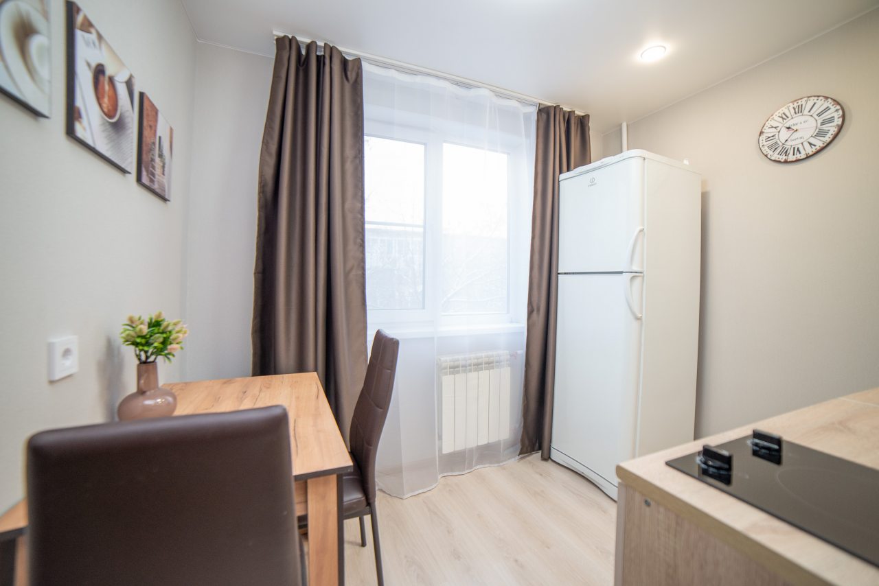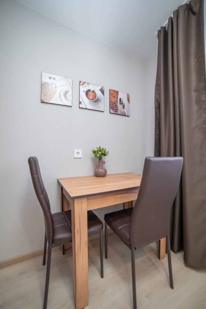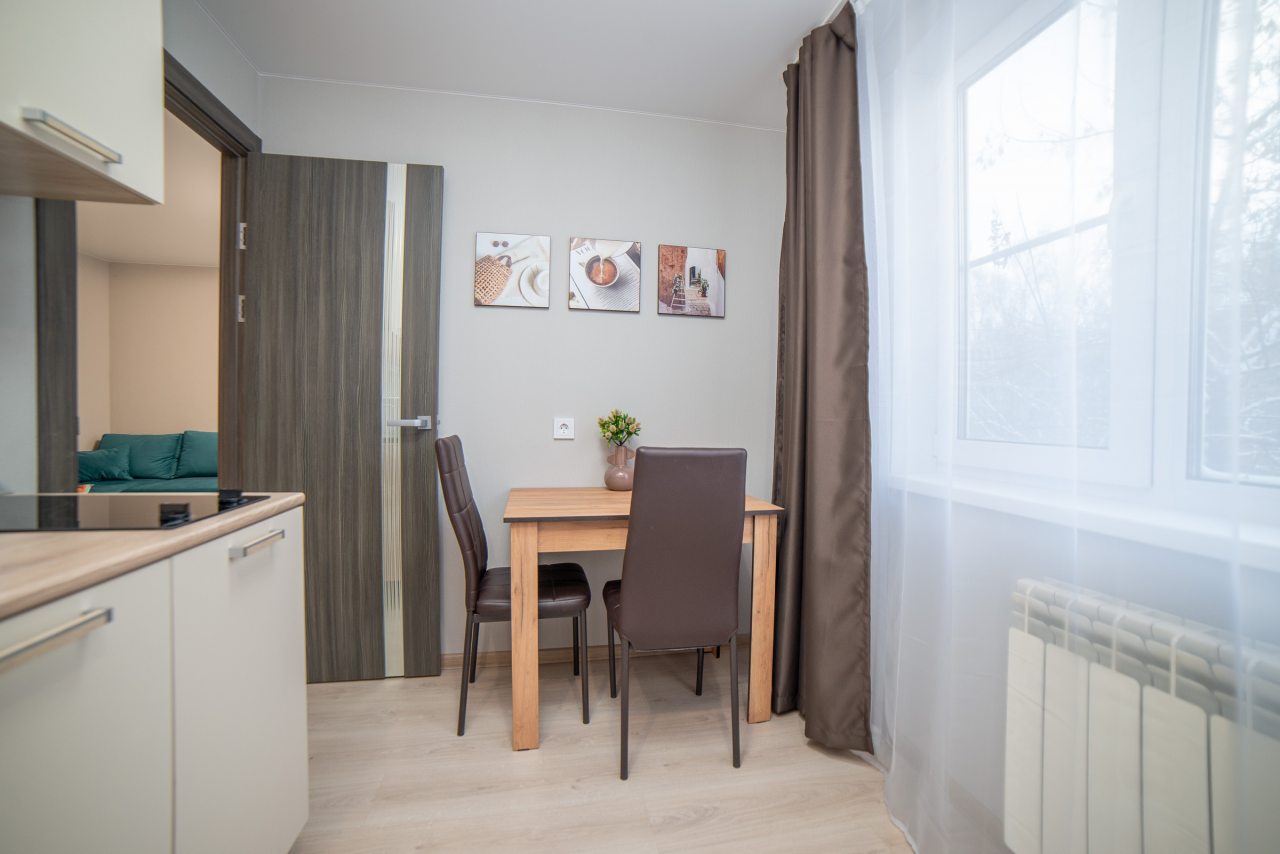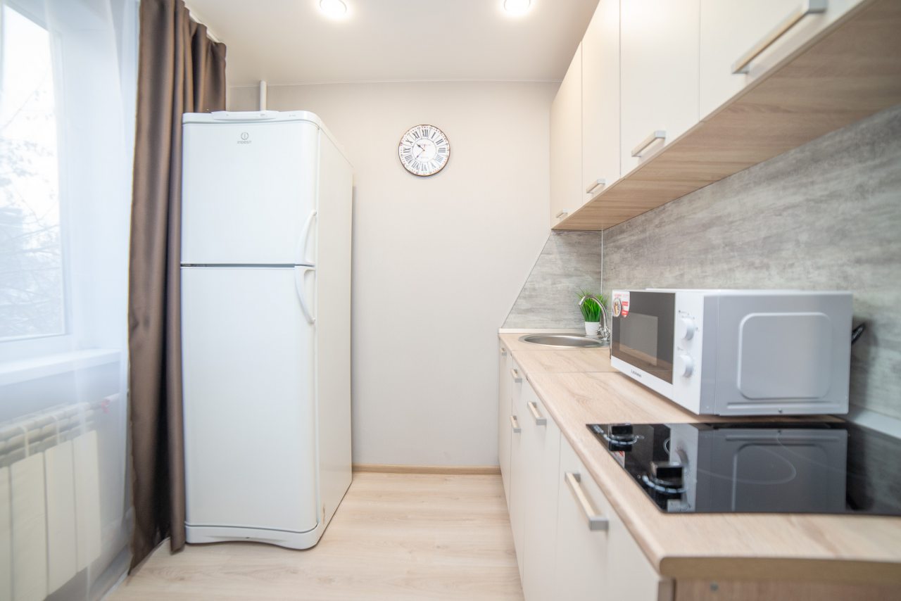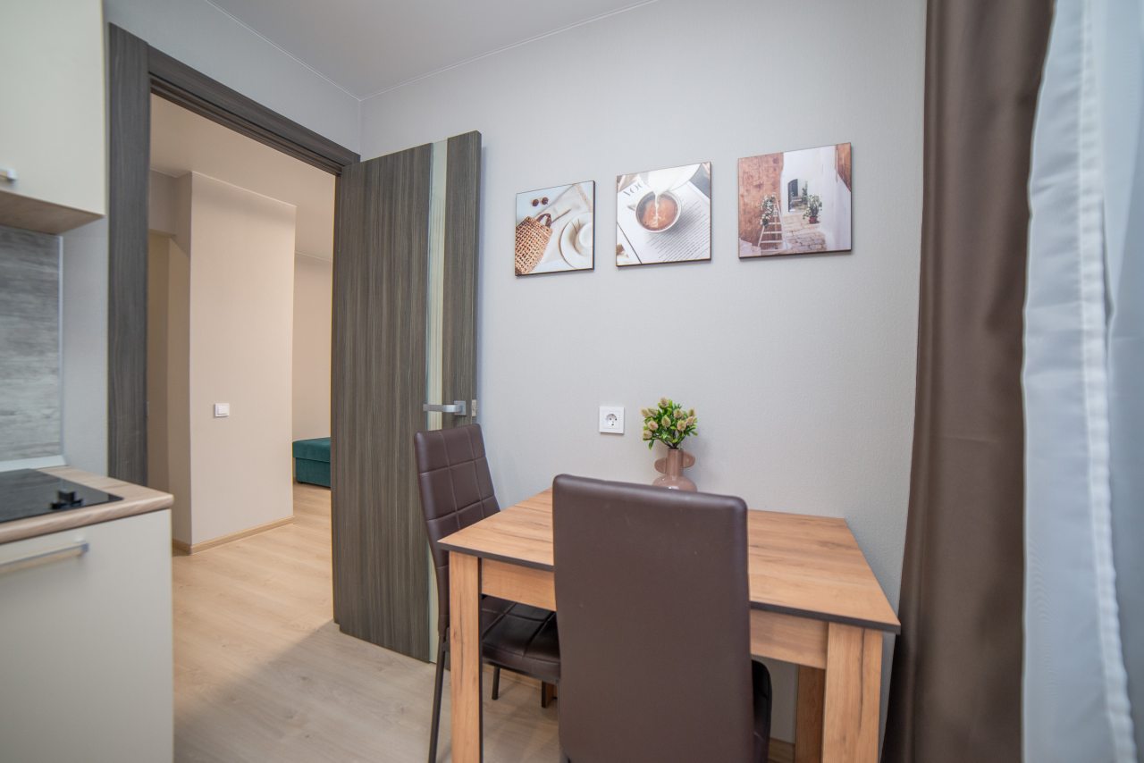 На уютной кухне будет приятно готовить домашние блюда, так как в наличии варочная панель, СВЧ-печь, холодильник, чайник, обеденная зона.