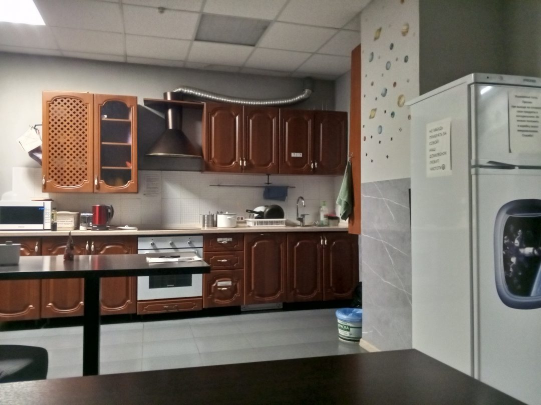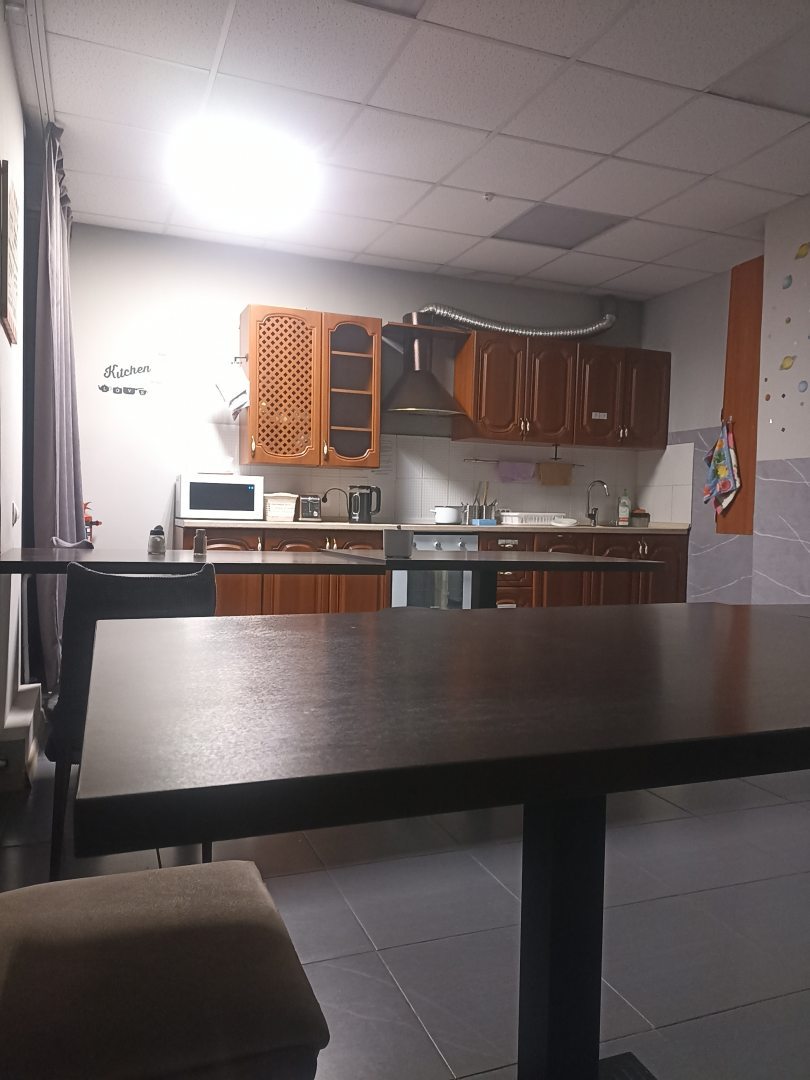 В помещении расположена прекрасная общая кухня с обновленным ремонтом, посудомоечной машиной, холодильником и духовка.