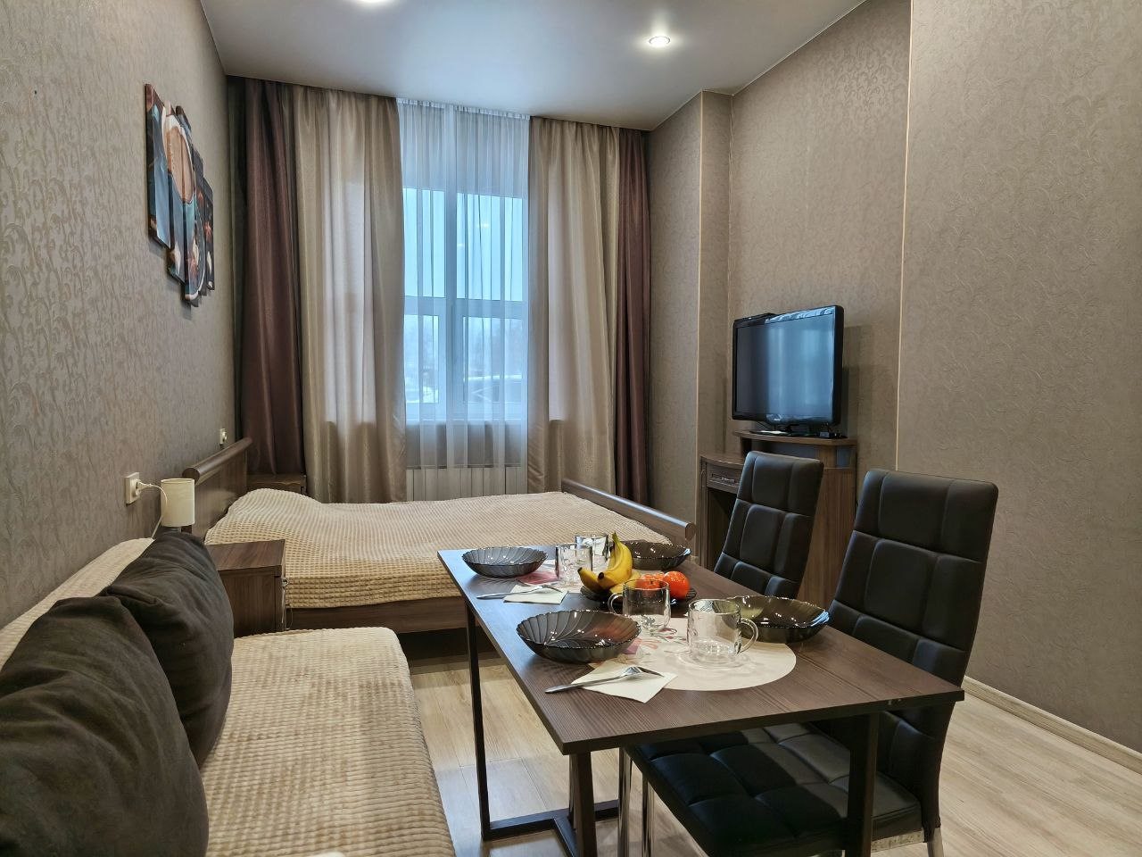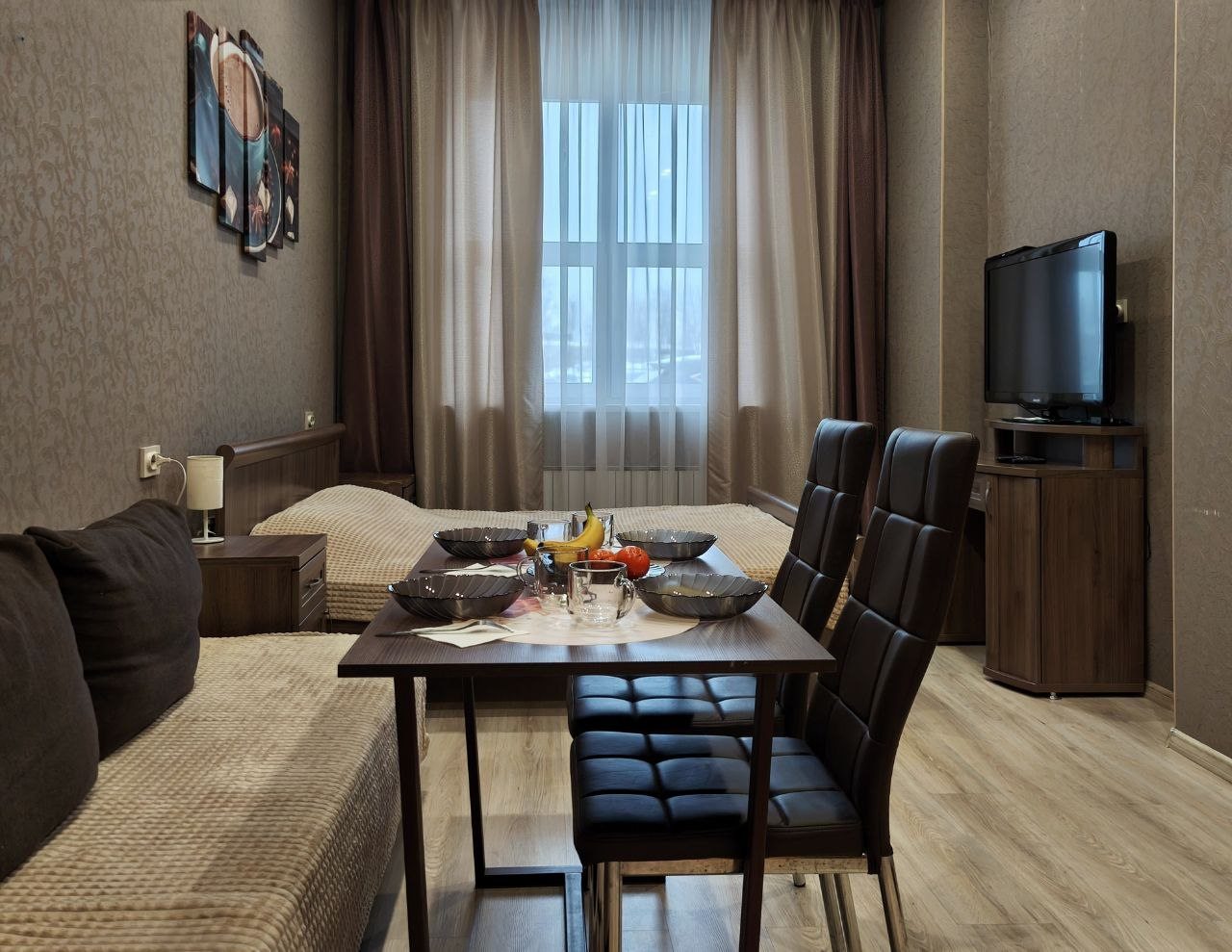 Приезжали на концерт, гостиница не далеко от вокзала. Очень удобное расположение. В номере тихо, чисто, уютно. Чайник, холодильник, микроволновка. Очень понравилось. Взяли на заметку на будущее. Рекомендую.