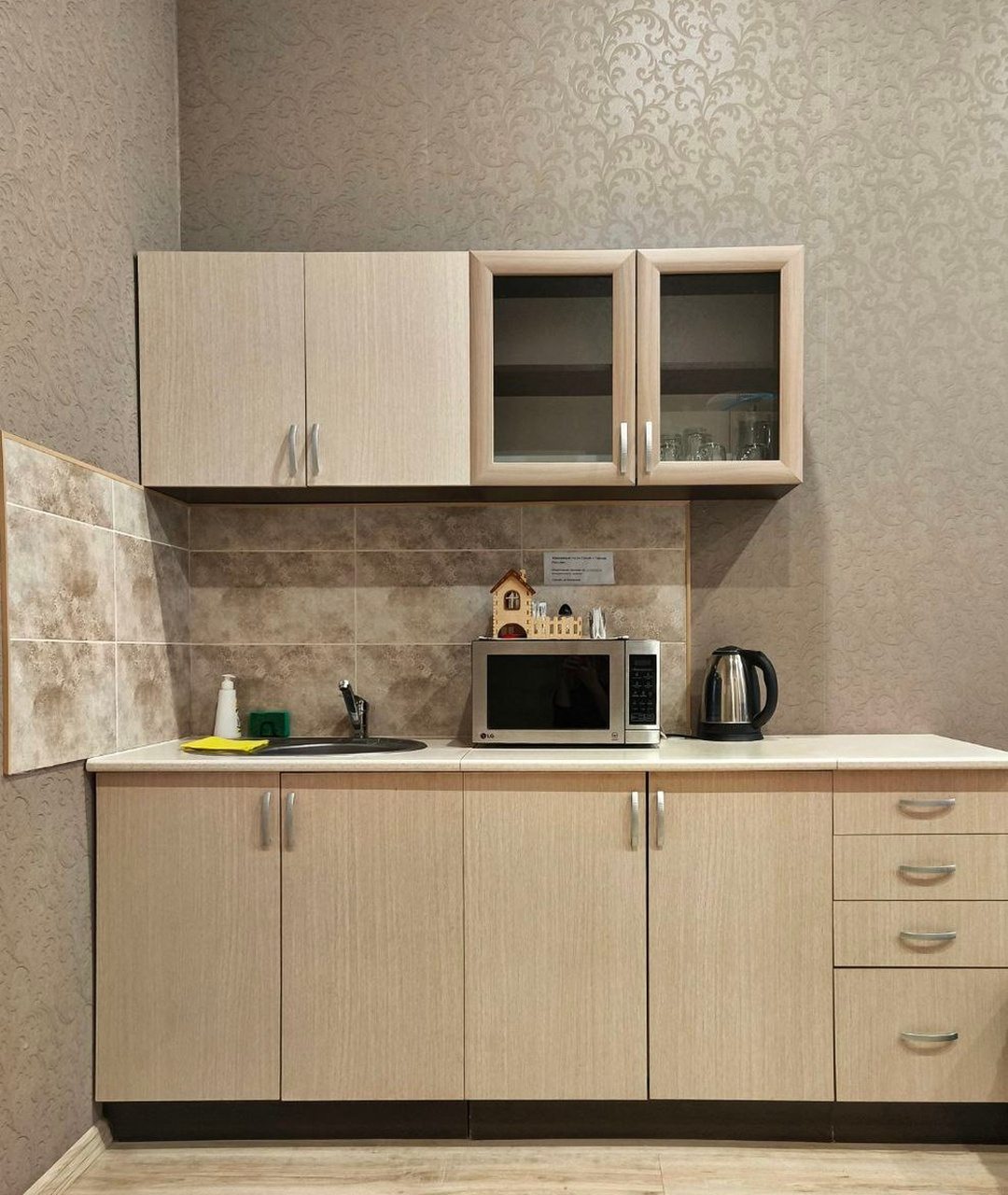 Кухонные зоны снабжены обеденными столами и техникой для приготовления еды. На этаже есть кулер с питьевой водой.