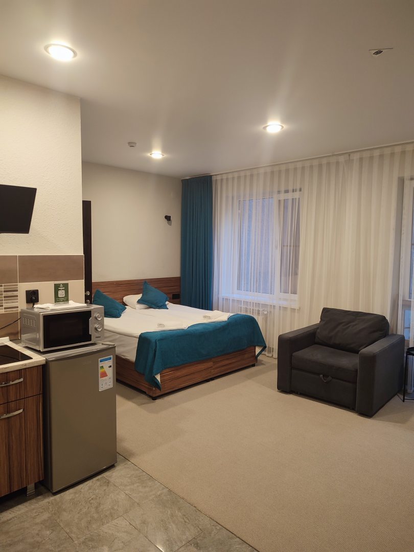 Чисто, красиво, уютно. Вид из окна просто шикарный. Есть кафе, еда вкусная. Можно купить всё в магазине и приготовить самим. В номере имеется кухня со всем необходимым. Нам всё нравится.