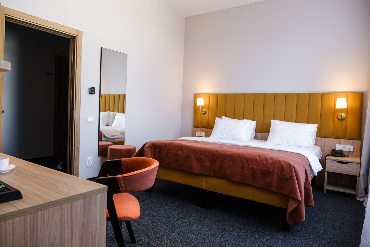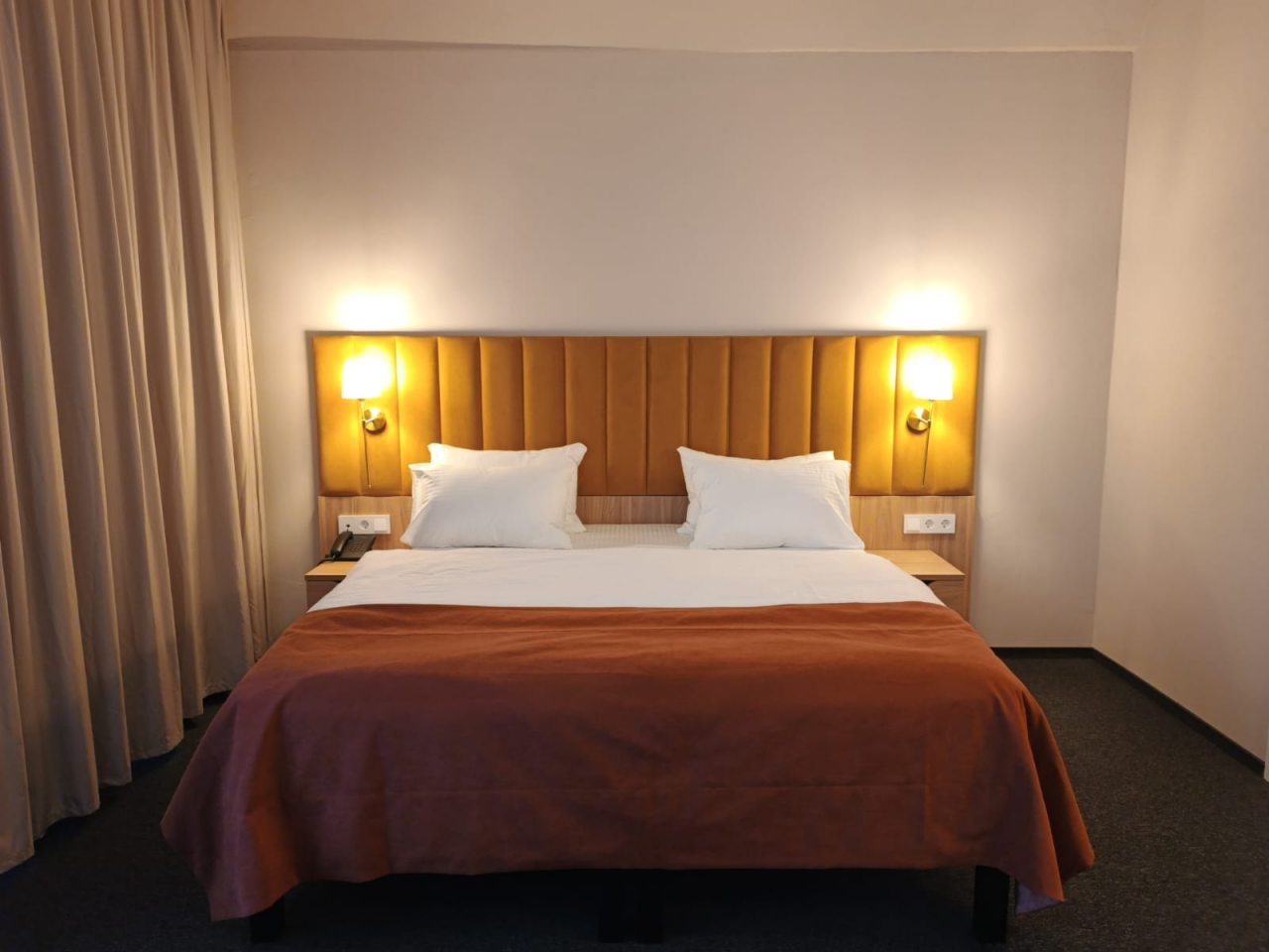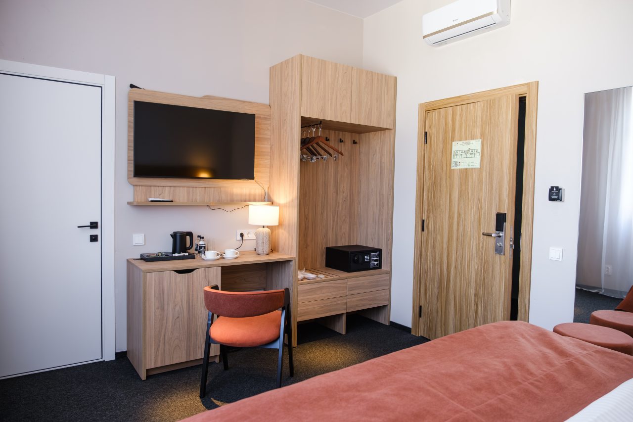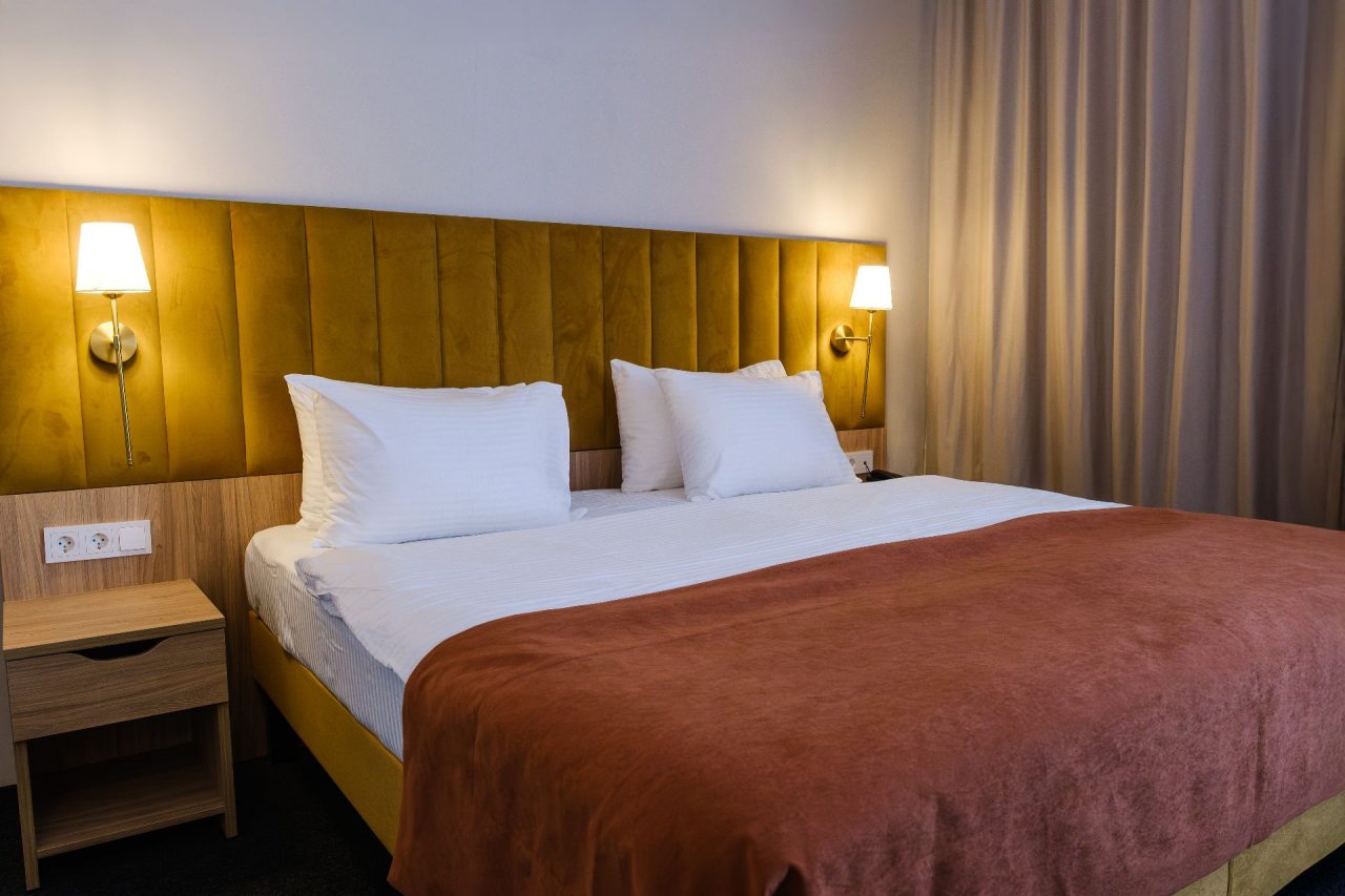 В каждом номере есть кровать с качественным матрасом, мягким изголовьем, прикроватными бра и розетками. Среди дополнительных удобств — телевизор, вместительный шкаф, сейф, стильный санузел с феном, средствами для личной гигиены и полотенцами.