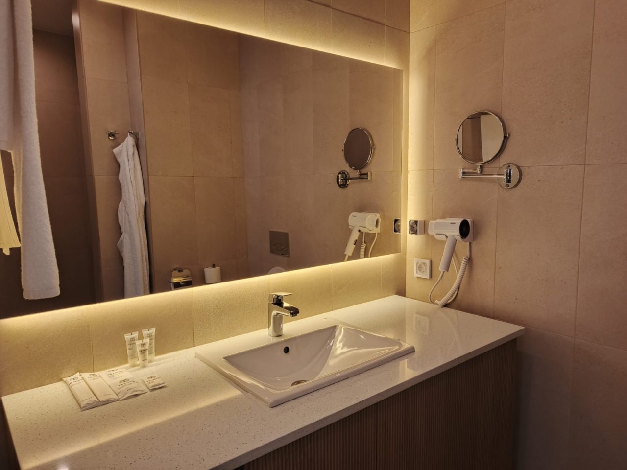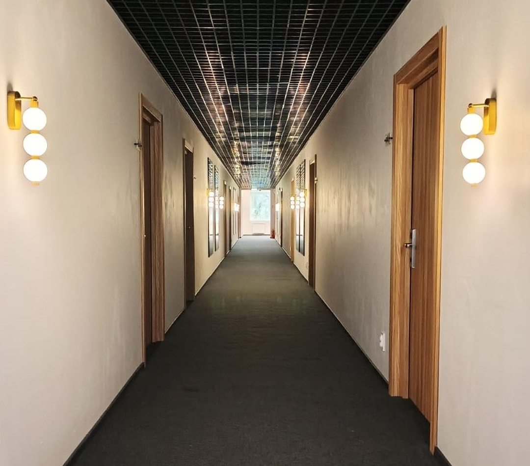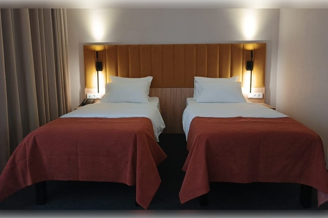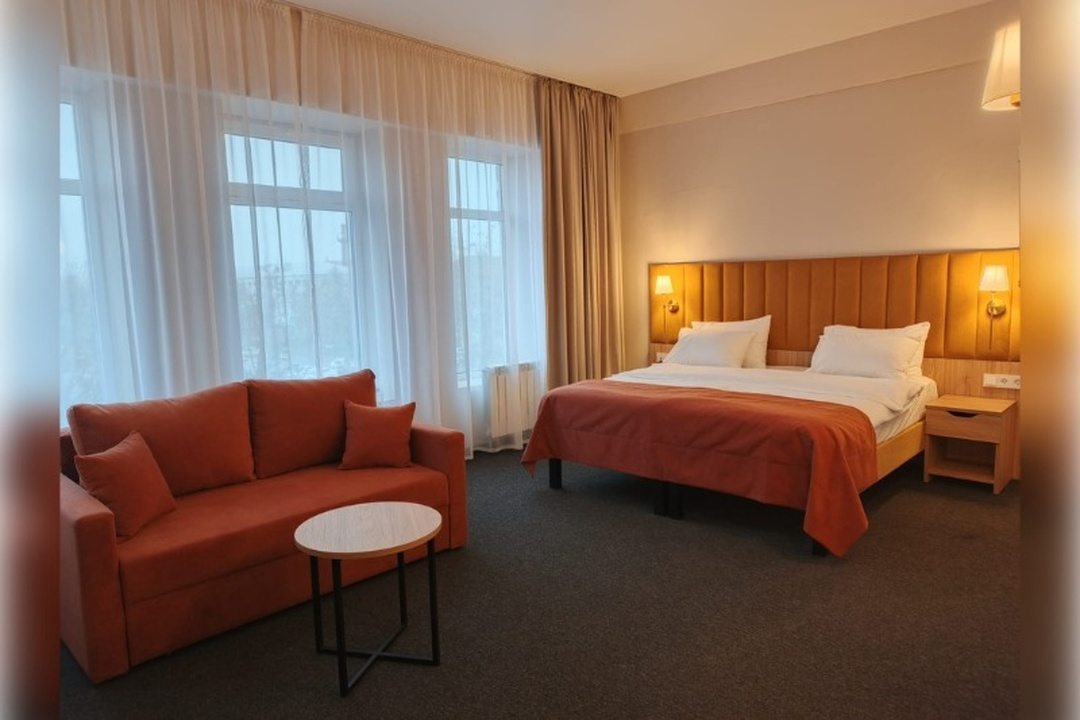 В каждом номере есть кровать с качественным матрасом, мягким изголовьем, прикроватными бра и розетками. Среди дополнительных удобств — телевизор, вместительный шкаф, сейф, стильный санузел с феном, средствами для личной гигиены и полотенцами.