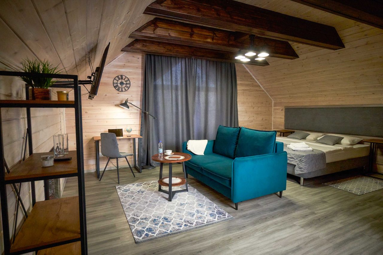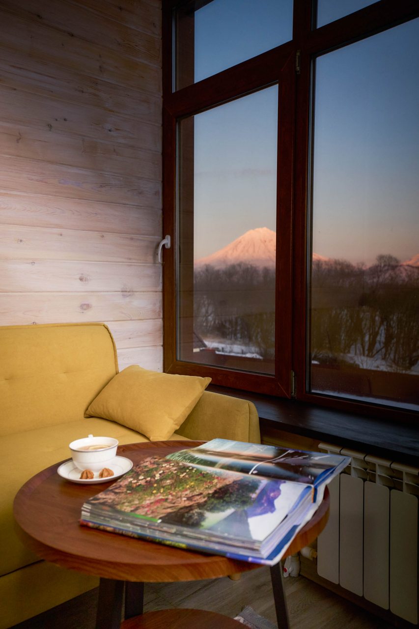 В современном коттедже есть несколько уютных спален, ванные комнаты, гостиная со столовой и большая кухня. Из удобств имеется камин, телевизор, доступ к Wi-Fi, набор полотенец и средств гигиены, необходимая мебель. Из окон открывается шикарный вид на камчатские вулканы.