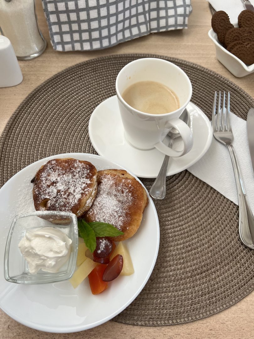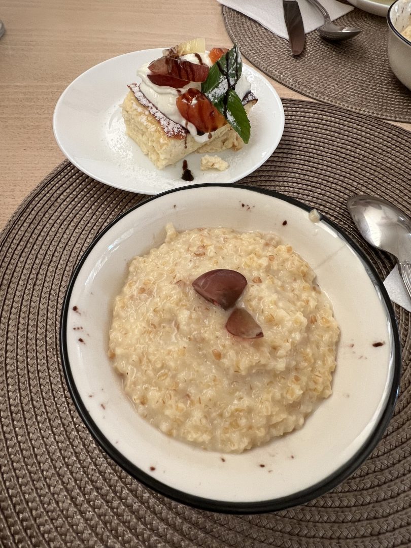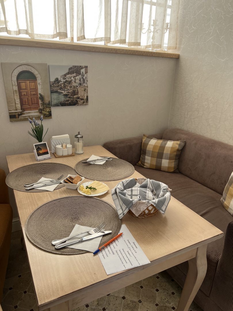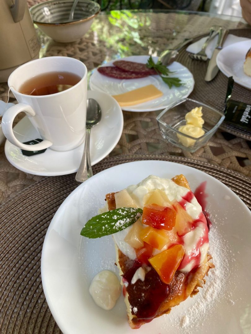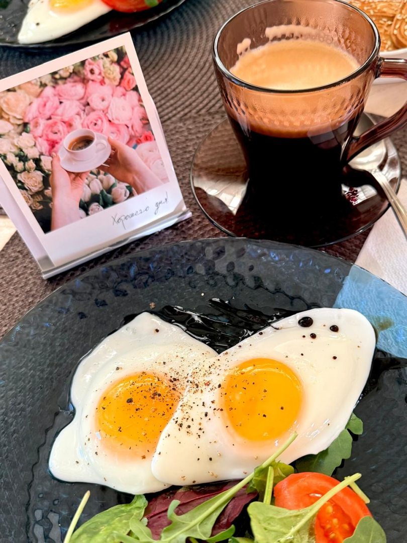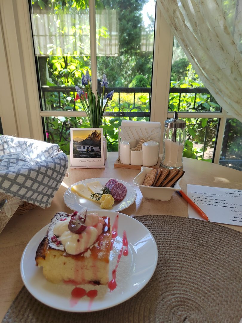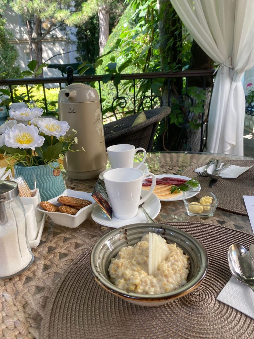 Завтраки на выбор из двух вариантов, просто отличные – большие порции и вкусные, состоят из нескольких блюд. Подача эстетичная, блюда красиво оформлены. Завтраки проходят на уютной и симпатичной террасе. Время завтрака можно выбирать.