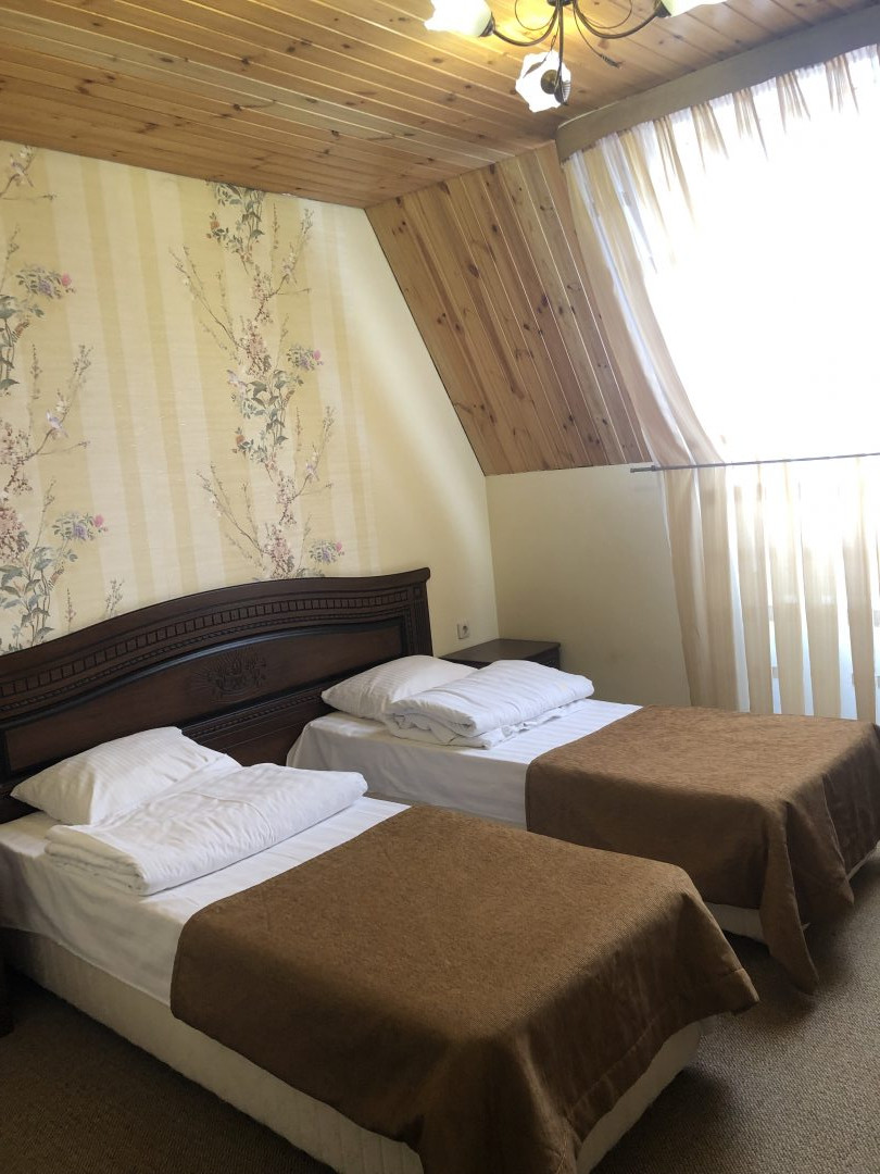 Отель расположен в тихом районе города, вид из номера на две стороны. Утром прекрасный вид на горы, очень красиво. Рядом расположена остановка общественного транспорта, можно доехать до Курортного парка, где в основном развлечения, исторические локации. В номере имеется холодильник, чайник. Есть буфет с набором посуды,тарелки, чайные чашки, приборы.