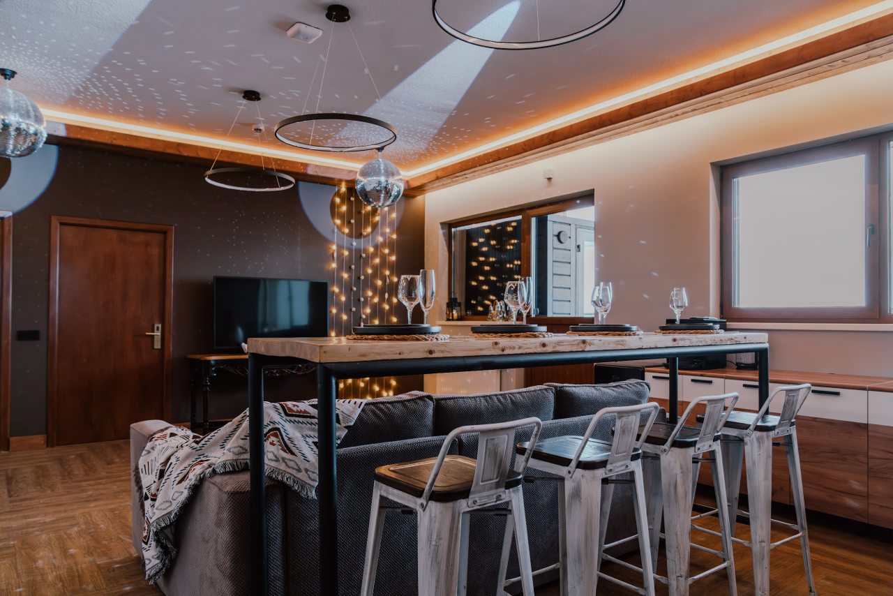 Предлагается пять номеров, выполненных в дизайнерском решении, которое отражает дух высокогорного карнавала. Каждая категория оснащена функциональной мебелью и современной техникой: удобные кровати, зоны для хранения личных вещей, телевизор. В собственной ванной комнате установлен набор сантехники. А трехкомнатные апартаменты оснащены джакузи и сауной на террасе, откуда открывается красивый пейзаж.