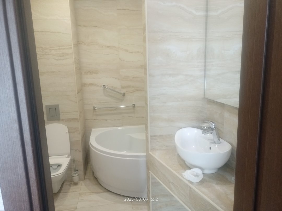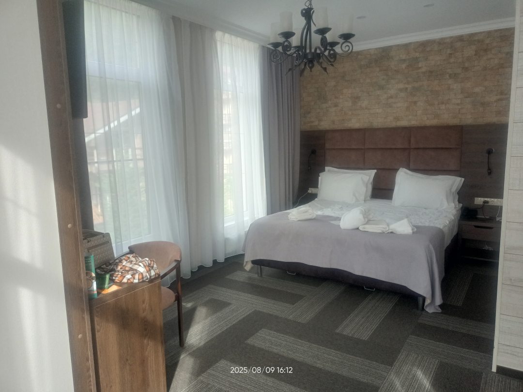 Итак, номер. Огромные окна, выходят на три стороны. Сам номер большой, высокие потолки, две комнаты. Много пространства, воздуха и света. В одной кровать, с жёстким, но очень комфортным матрасом, в другой раскладной диван, тоже уютный. Две ванные комнаты - в одной душ, в другой ванна(в глаза бросилось сразу отошедший потолок и грязь по краю ванны. Поэтому купались только в душе, там в глаза ничего не бросалось). Куча полотенец, ванные принадлежности(шампуньки, гели, лосьоны для тела, бритвенные станки, зубная щётка с пастой) все в индивидуальных упаковочках и в обеих ванных комнатах в двух экземплярах. Полотенца,халаты. Все белоснежное и мягкое.