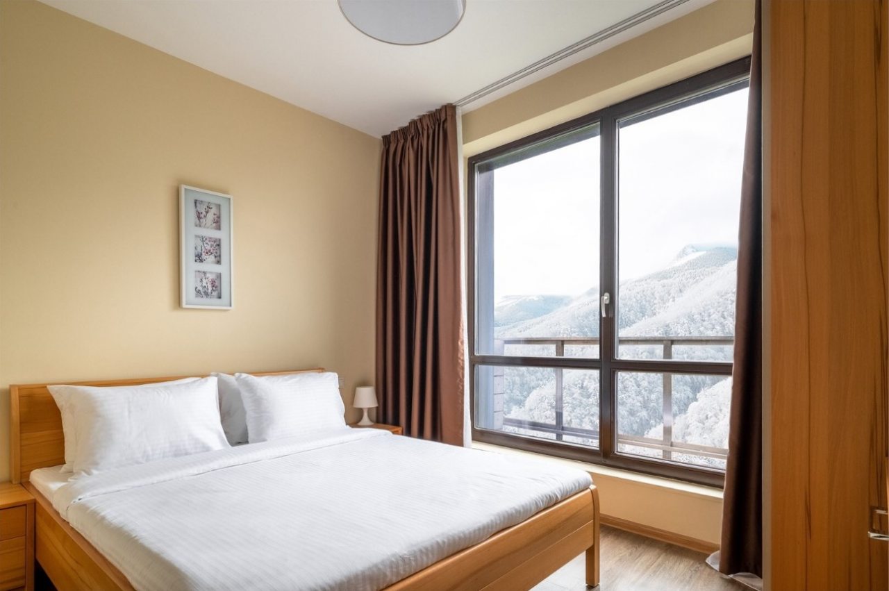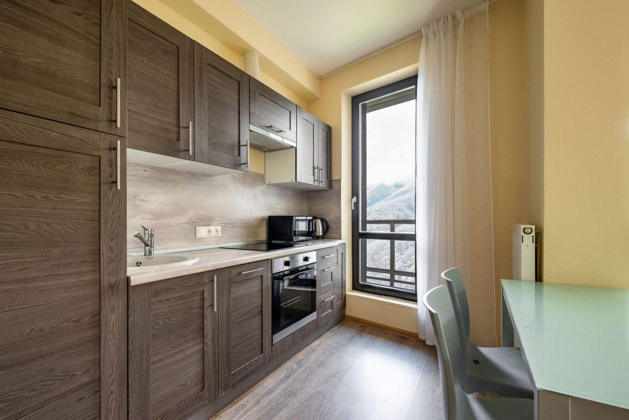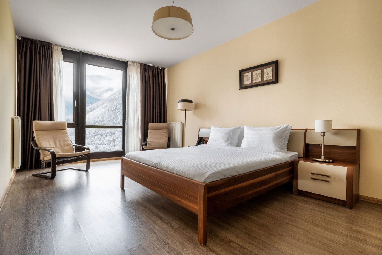 Очень просторный номер и очень удобная планировка. Шйкарный вих на горы и подъемник, именно то что я искала. До розы Хутор и назад ездит шаттл каждый час туда, и обратно. Вежливый персонал хороший расторан+ наличие парковки.