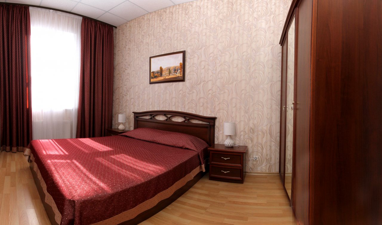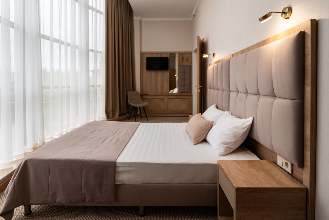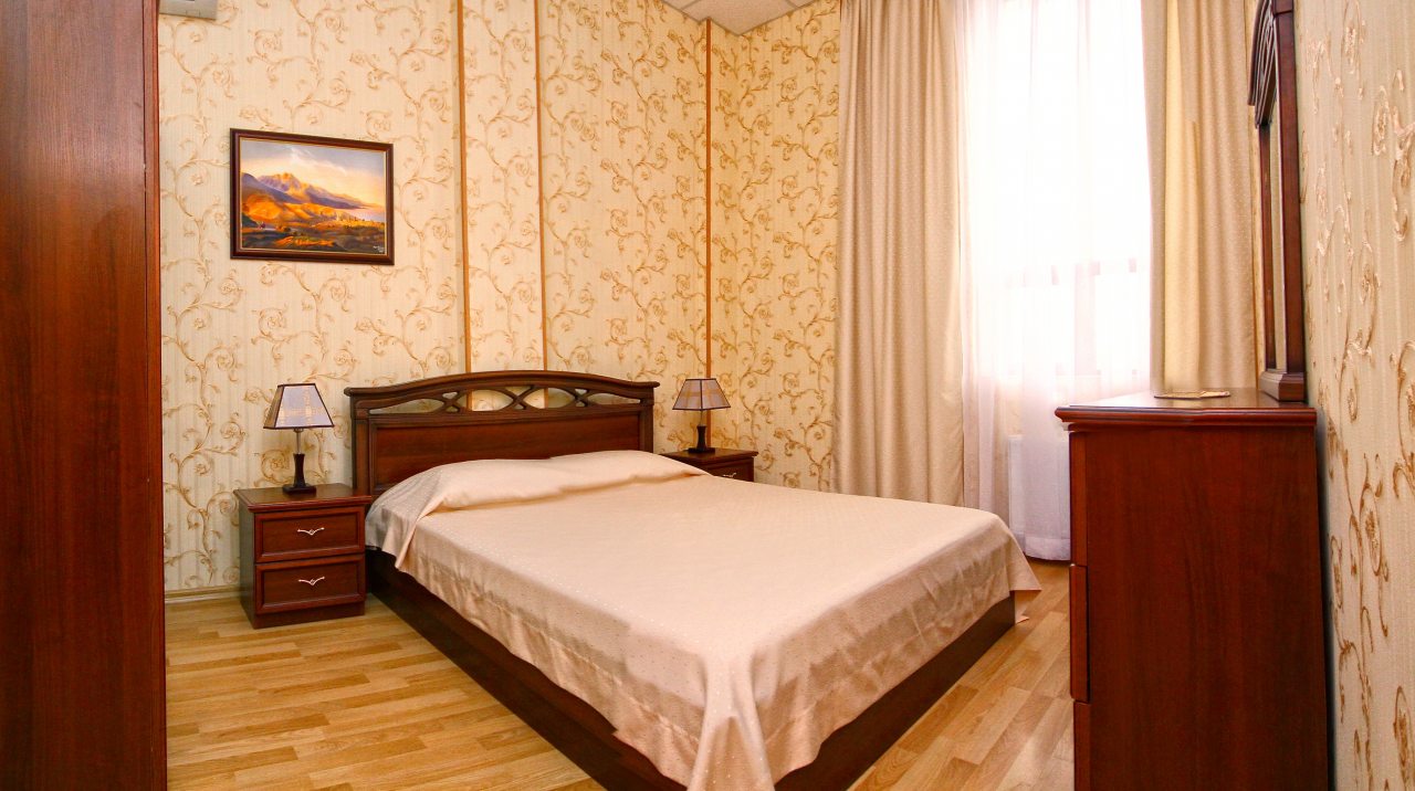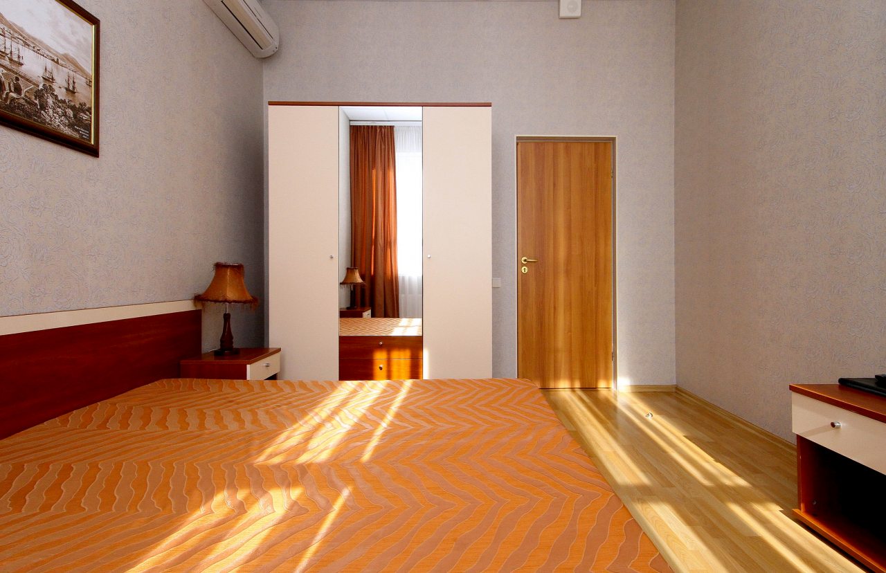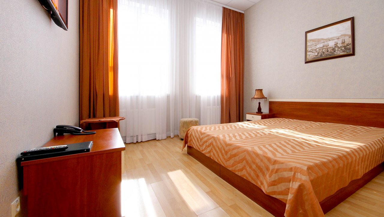 К размещению представлены комфортабельные номера с современным ремонтом. Они укомплектованы набором мебели и техники: двуспальная кровать с белоснежным постельным бельем, прикроватные тумбочки, обеденный столик на две персоны, телевизор, шкаф, телефон. В санузле установлен душ. Есть доступ к сети Wi-Fi.