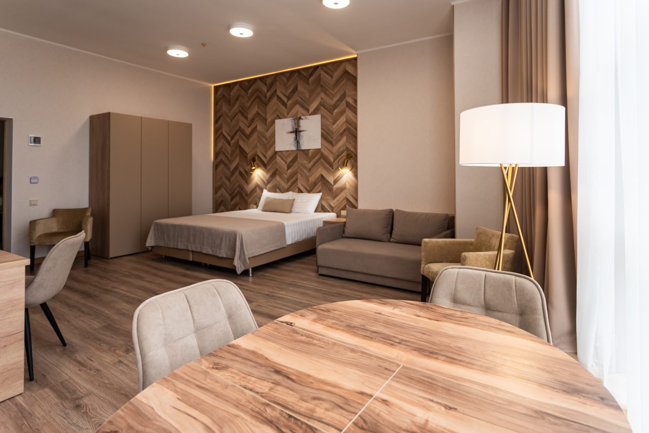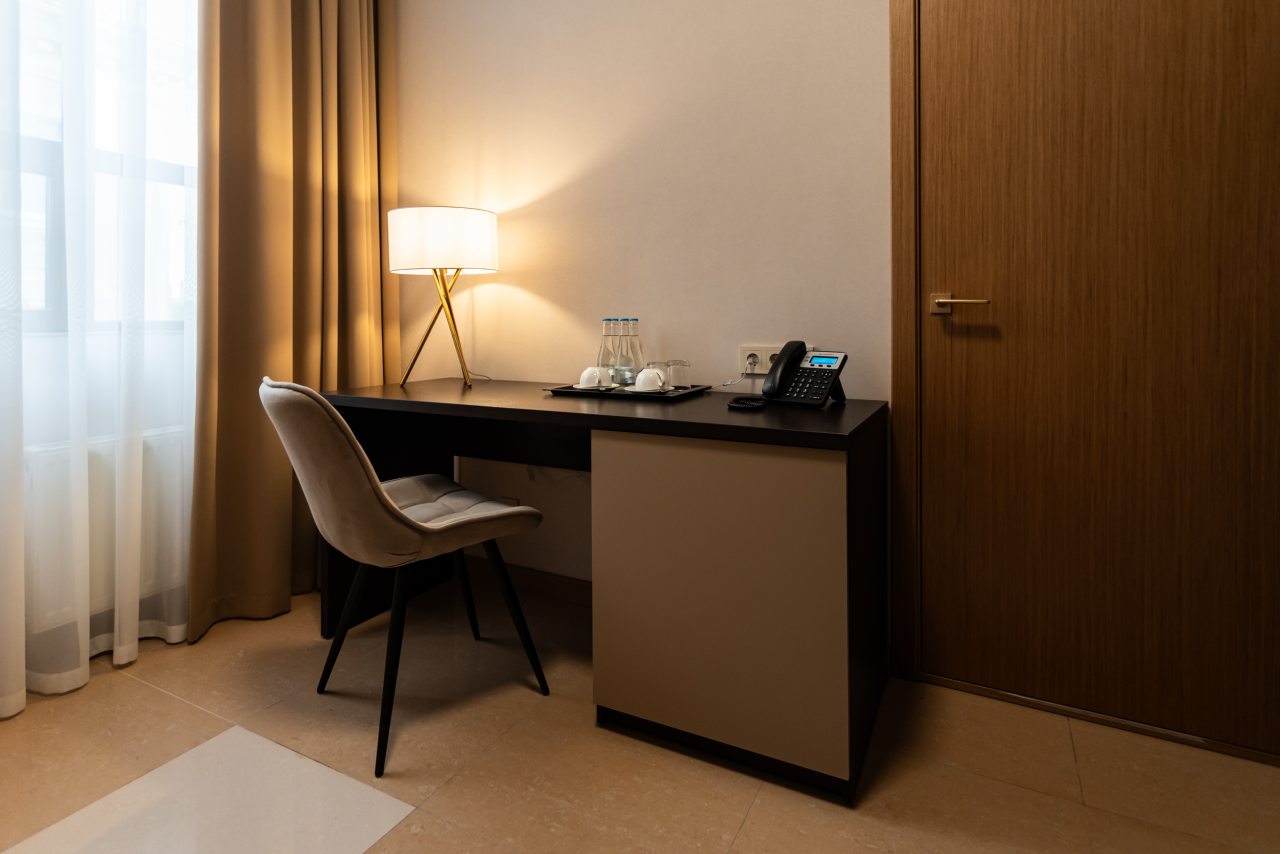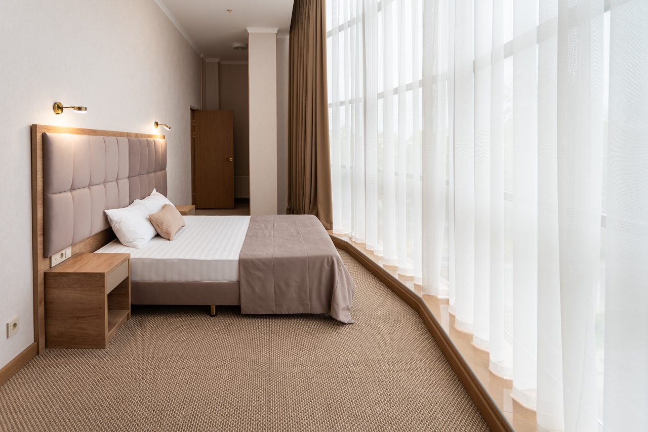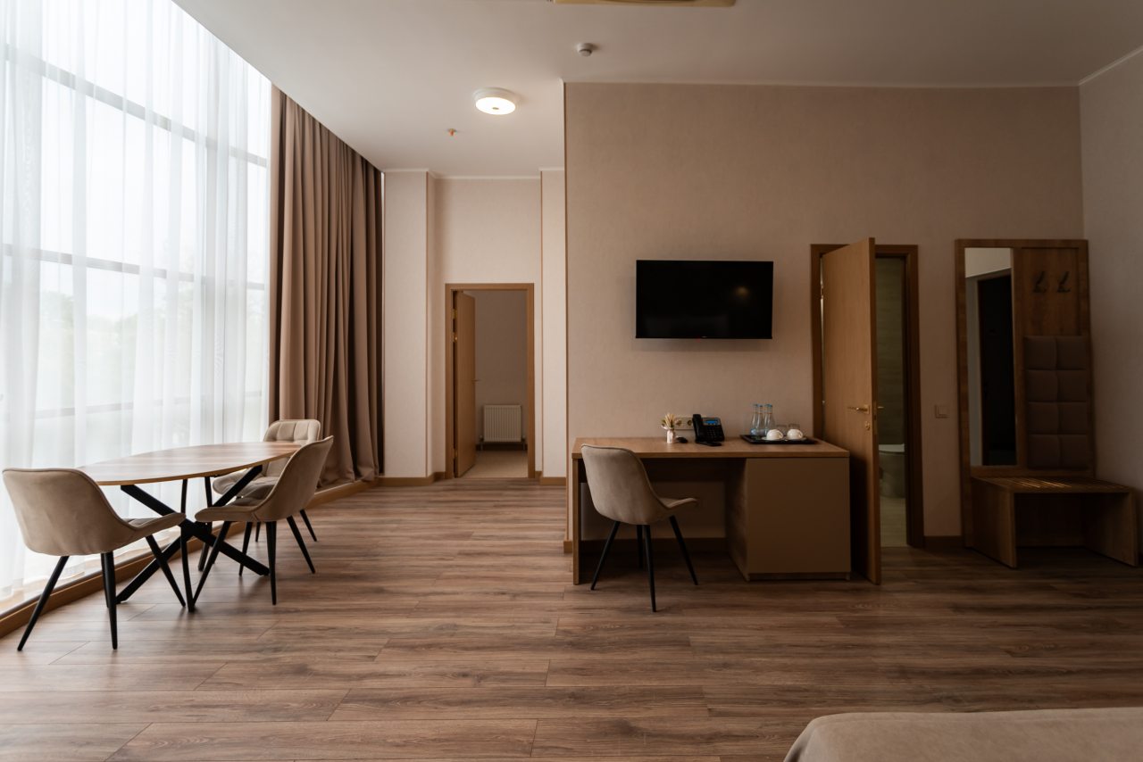 К размещению представлены комфортабельные номера с современным ремонтом. Они укомплектованы набором мебели и техники: двуспальная кровать с белоснежным постельным бельем, прикроватные тумбочки, обеденный столик на две персоны, телевизор, шкаф, телефон. В санузле установлен душ. Есть доступ к сети Wi-Fi.