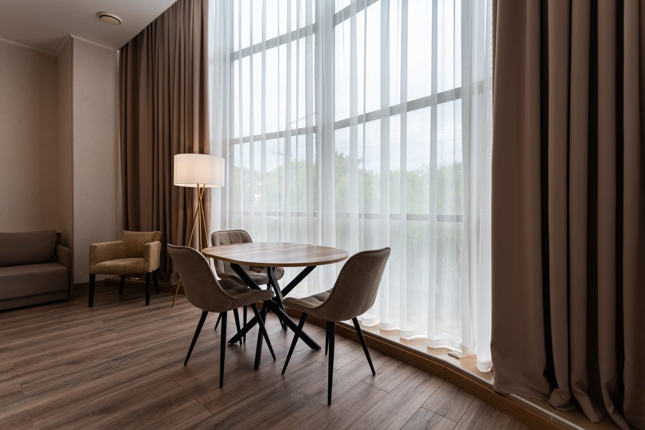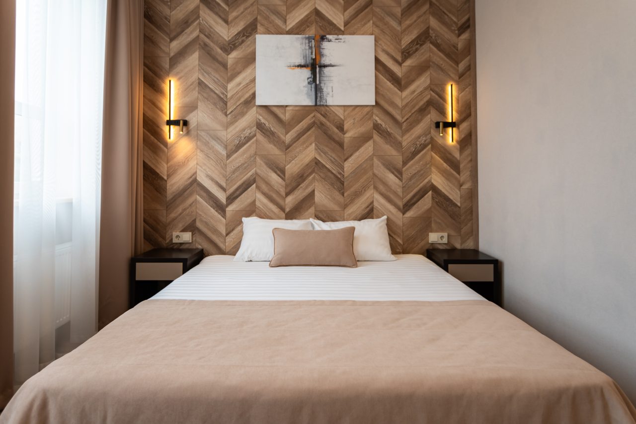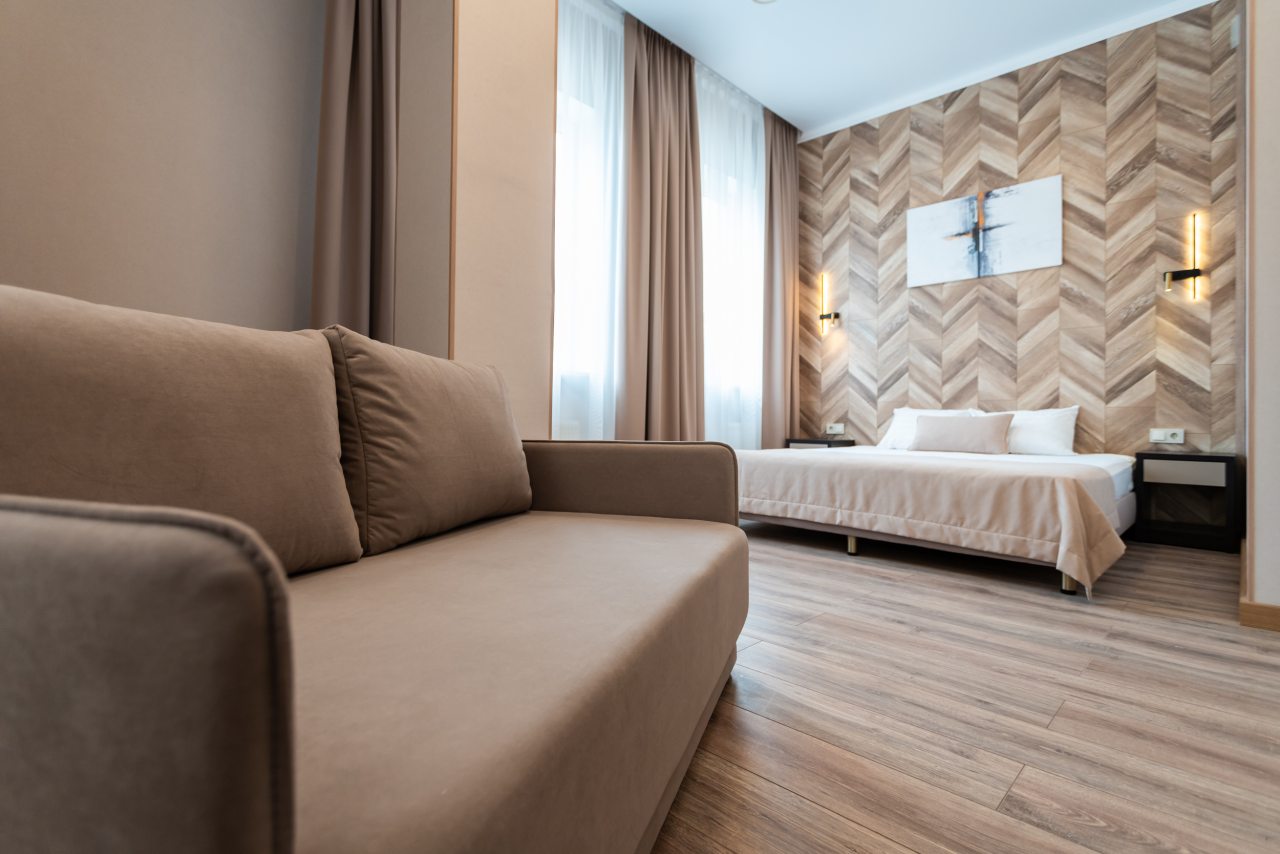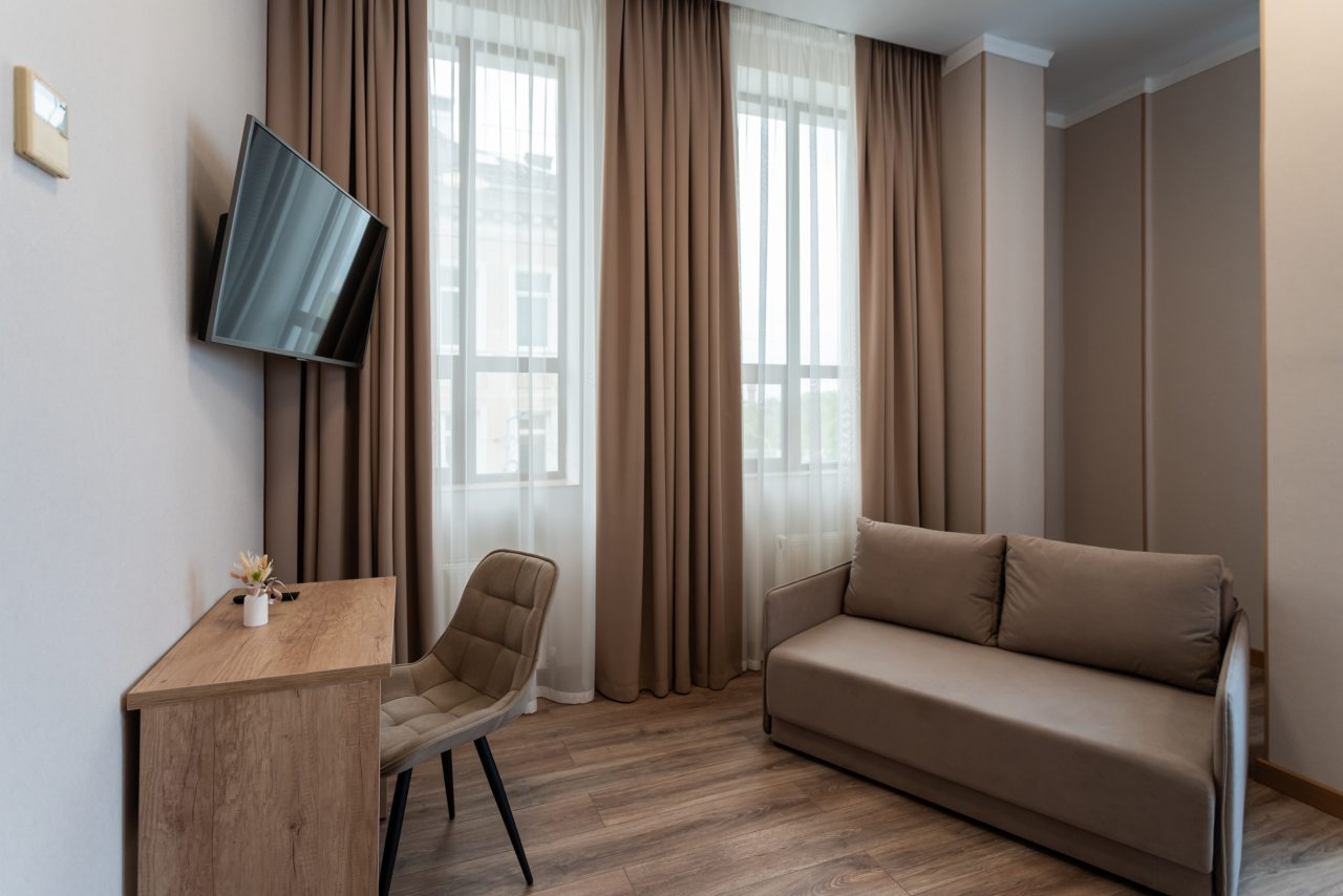 К размещению представлены комфортабельные номера с современным ремонтом. Они укомплектованы набором мебели и техники: двуспальная кровать с белоснежным постельным бельем, прикроватные тумбочки, обеденный столик на две персоны, телевизор, шкаф, телефон. В санузле установлен душ. Есть доступ к сети Wi-Fi.