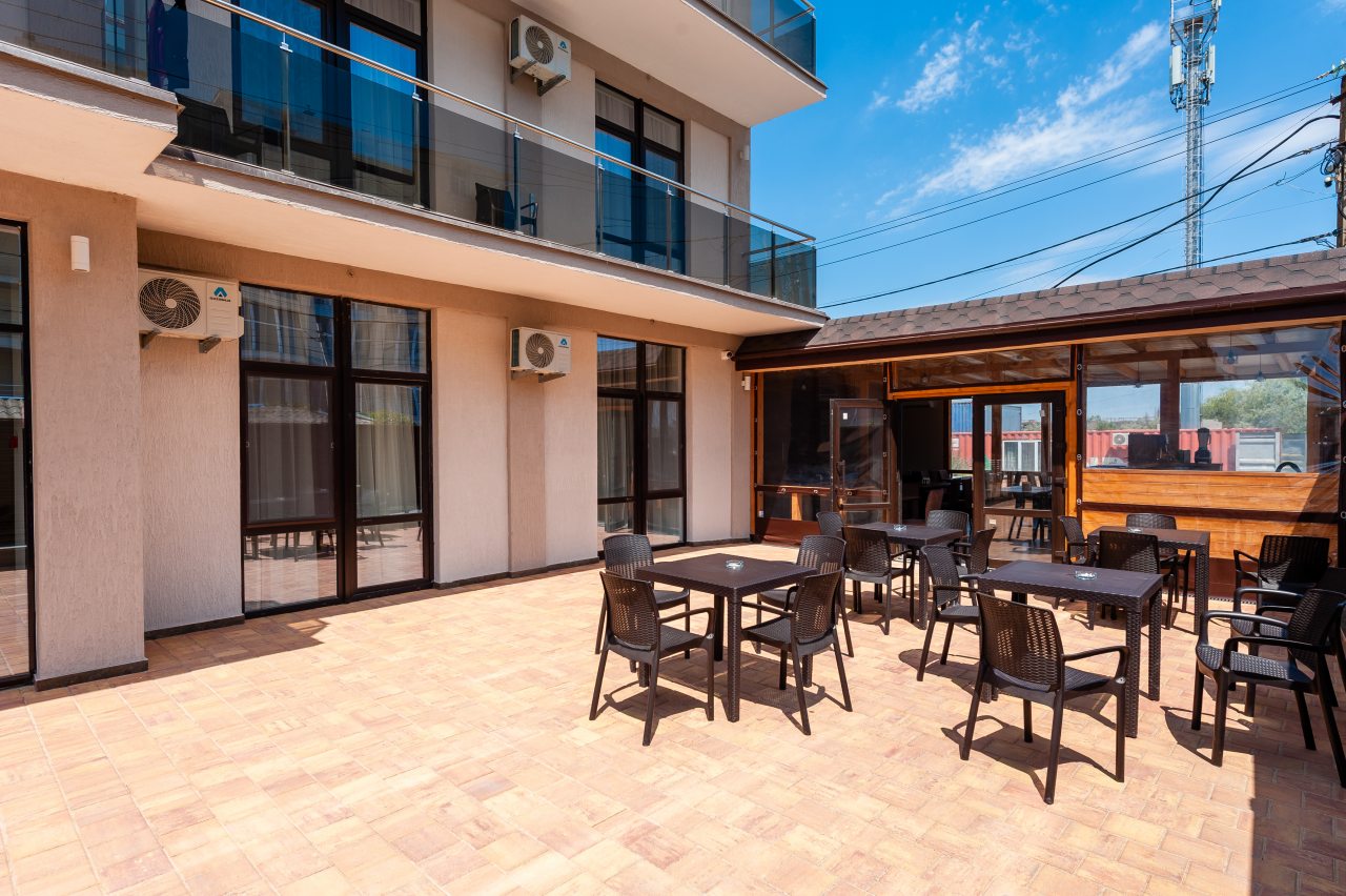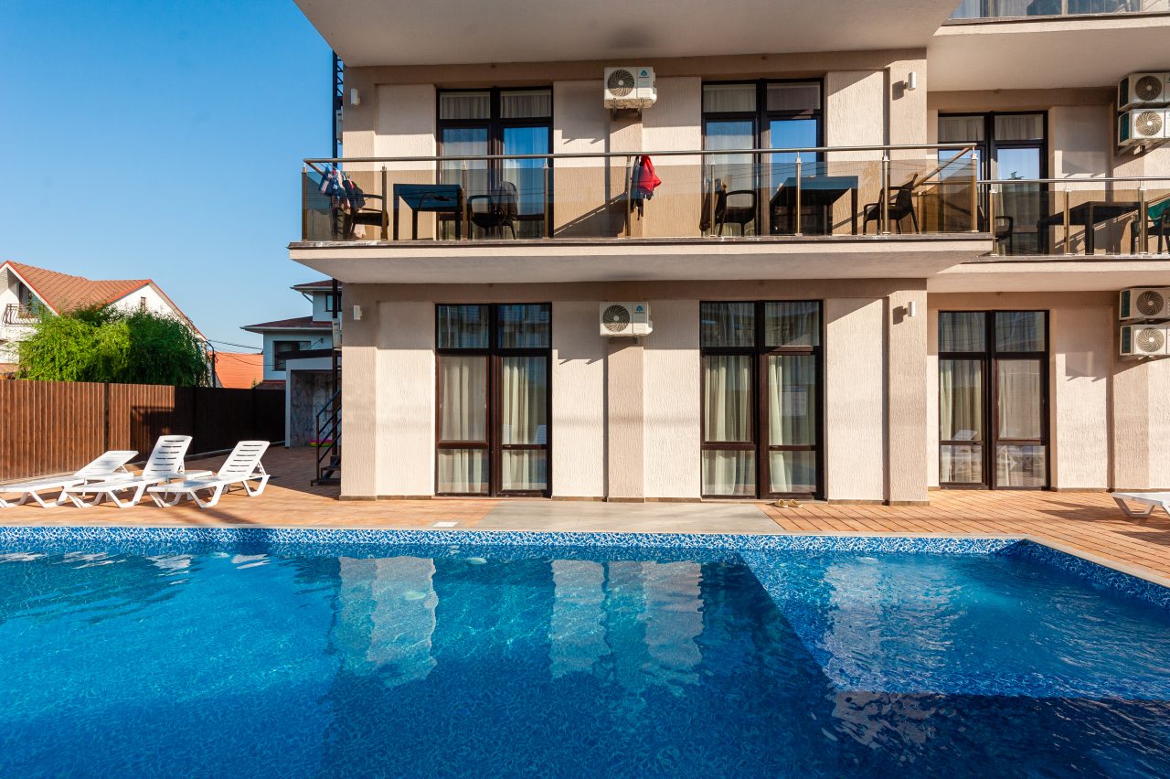 На территории есть уютная зона с лежаками и бассейном, а до пляжа буквально 100 метров. В свободное время гости могут отдохнуть на горячем песке и насладиться видами бескрайнего Черного моря. Неподалеку работает дельфинарий. Расстояние до железнодорожного вокзала составит 3,4 км, а до ближайшего аэропорта — 113,1 км.