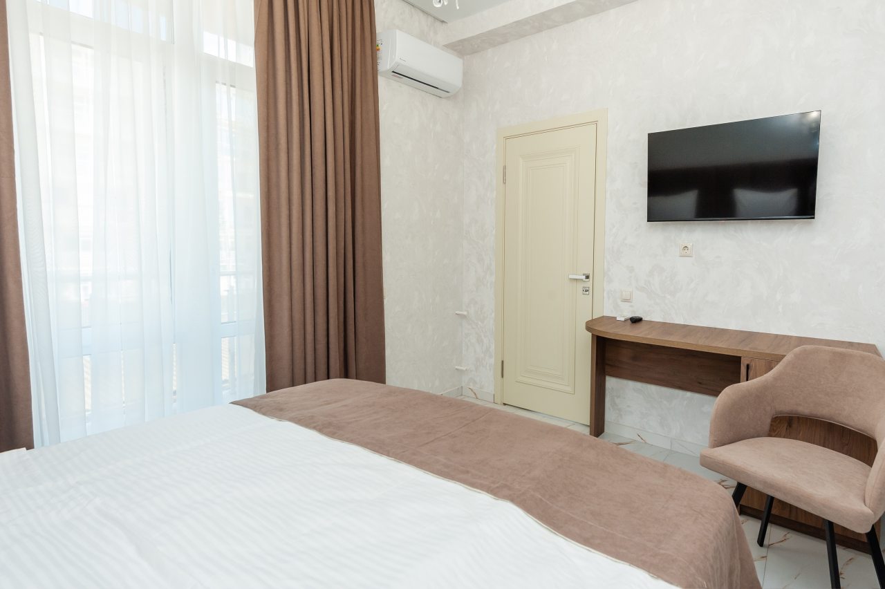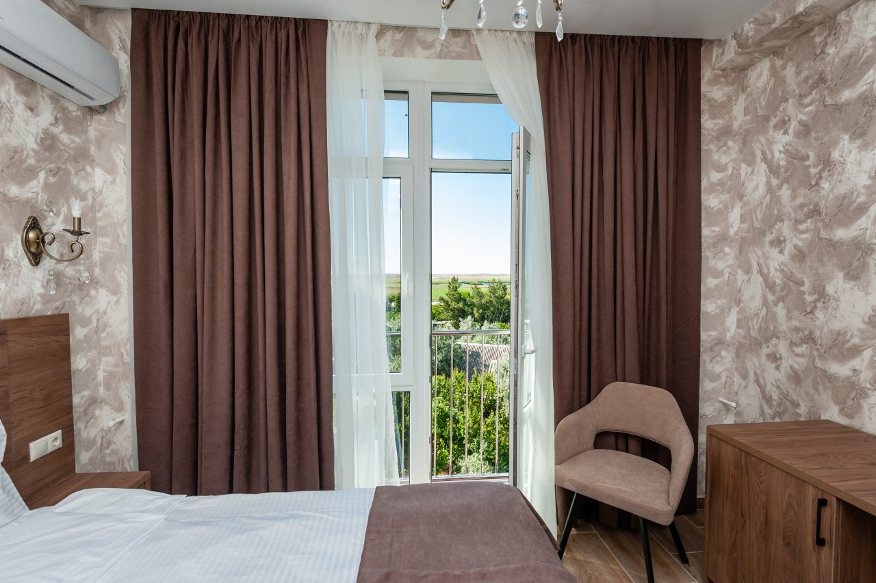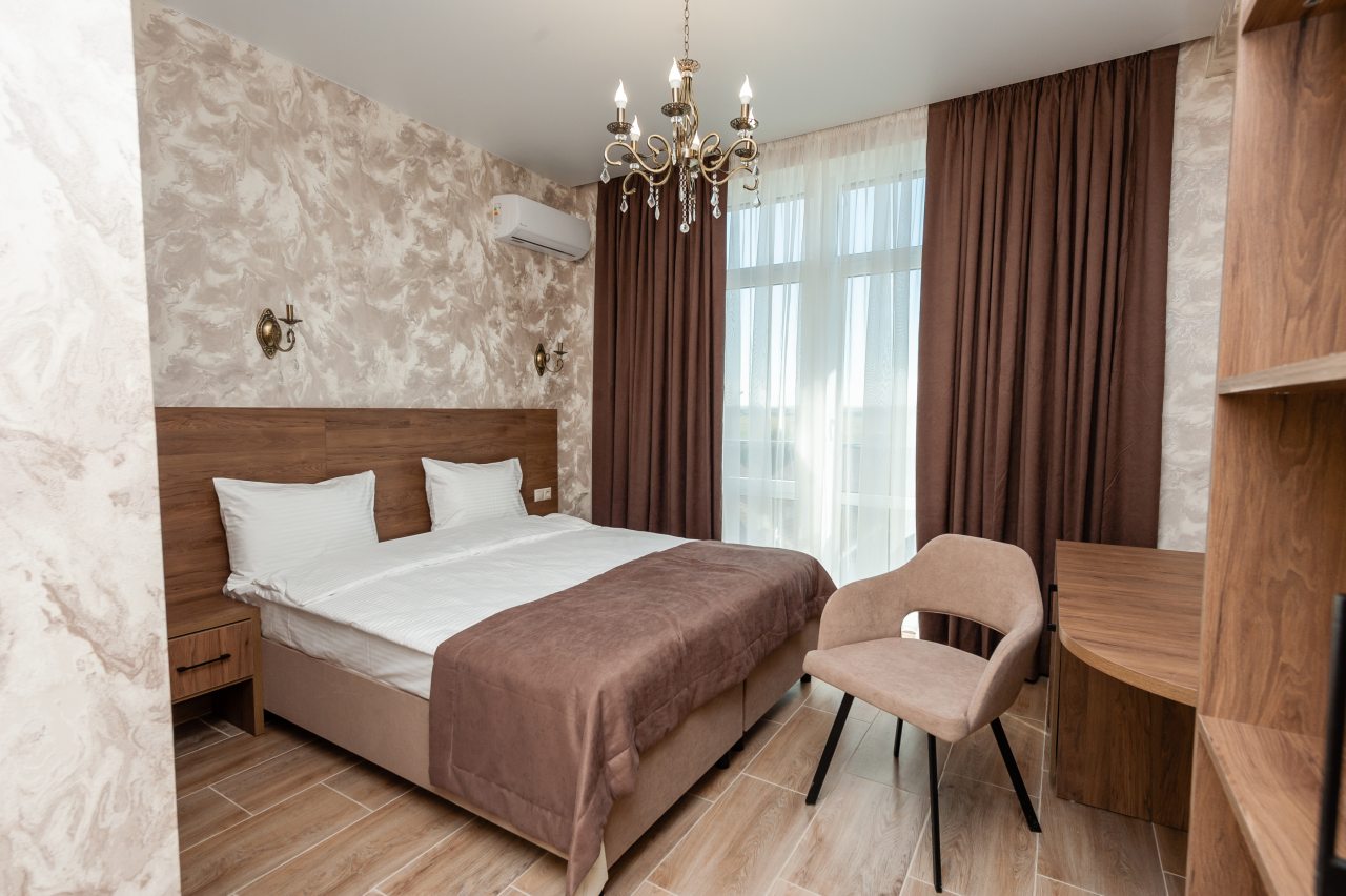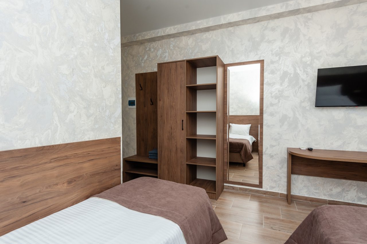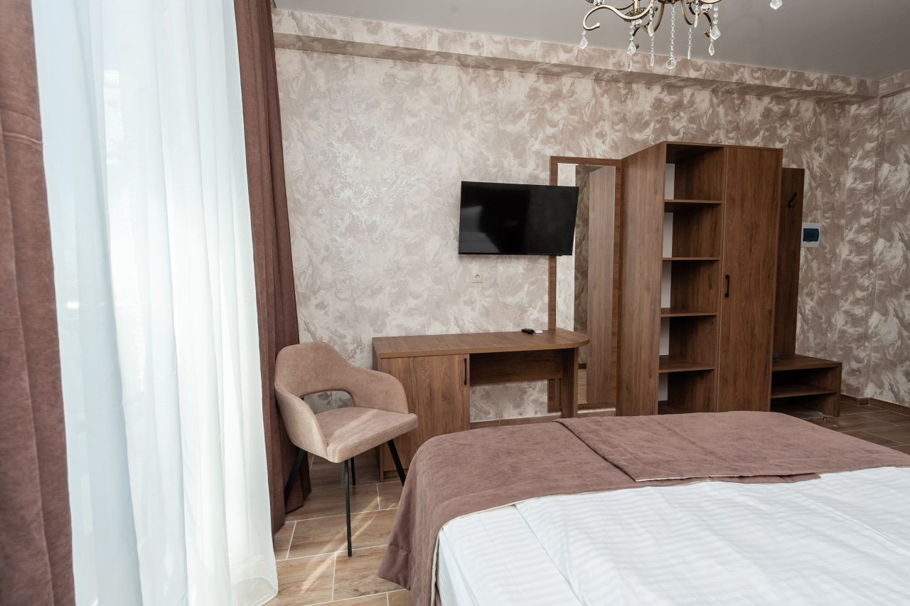 Для размещения отдыхающих подготовлены современные номера в приятной цветовой гамме. Они оснащены мебелью и техникой для отдыха: удобные спальные места с белоснежным постельным бельем, кондиционер, стол и стул, шкаф для одежды, телевизор. В ванной комнате есть фен и полотенца.