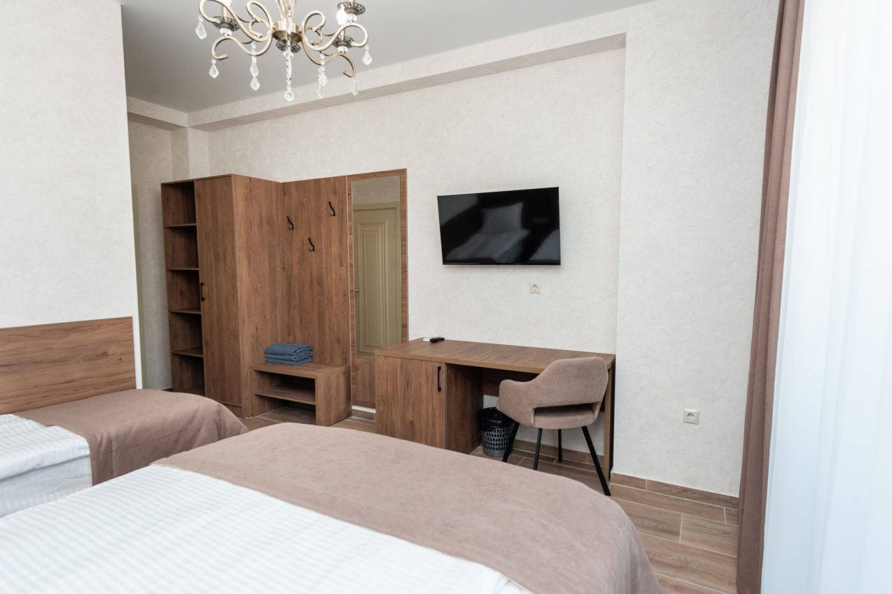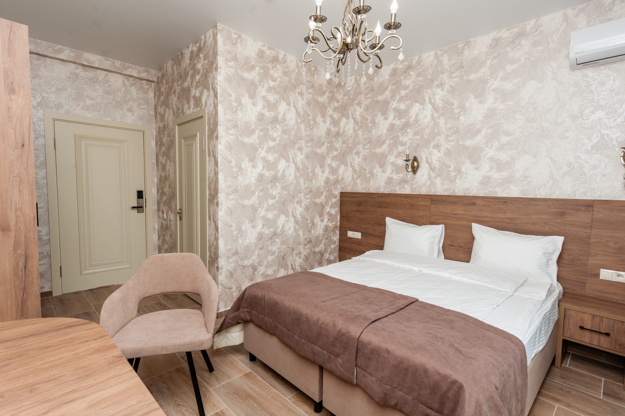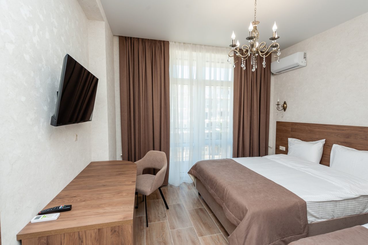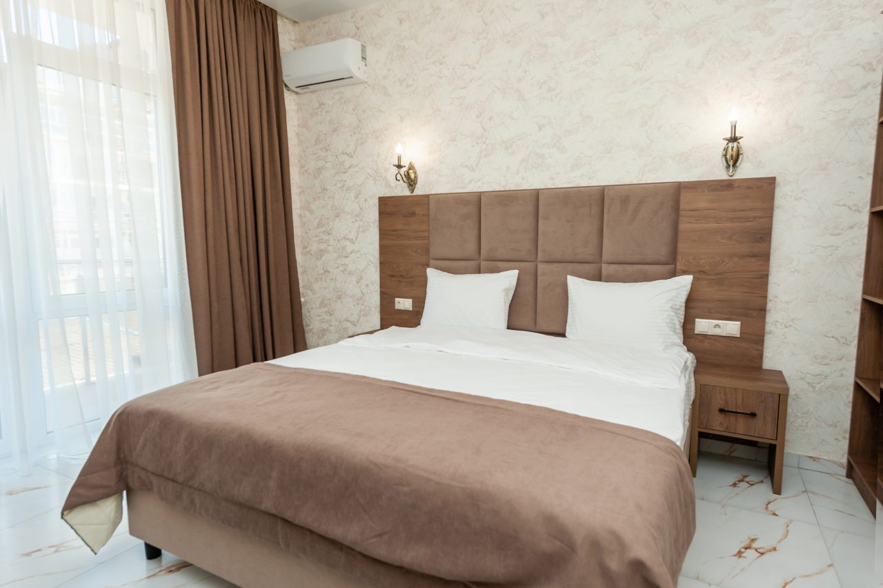 Для размещения отдыхающих подготовлены современные номера в приятной цветовой гамме. Они оснащены мебелью и техникой для отдыха: удобные спальные места с белоснежным постельным бельем, кондиционер, стол и стул, шкаф для одежды, телевизор. В ванной комнате есть фен и полотенца.