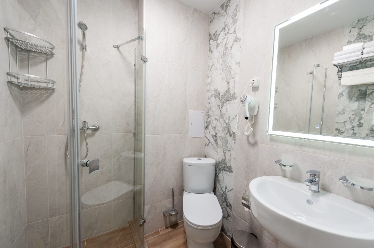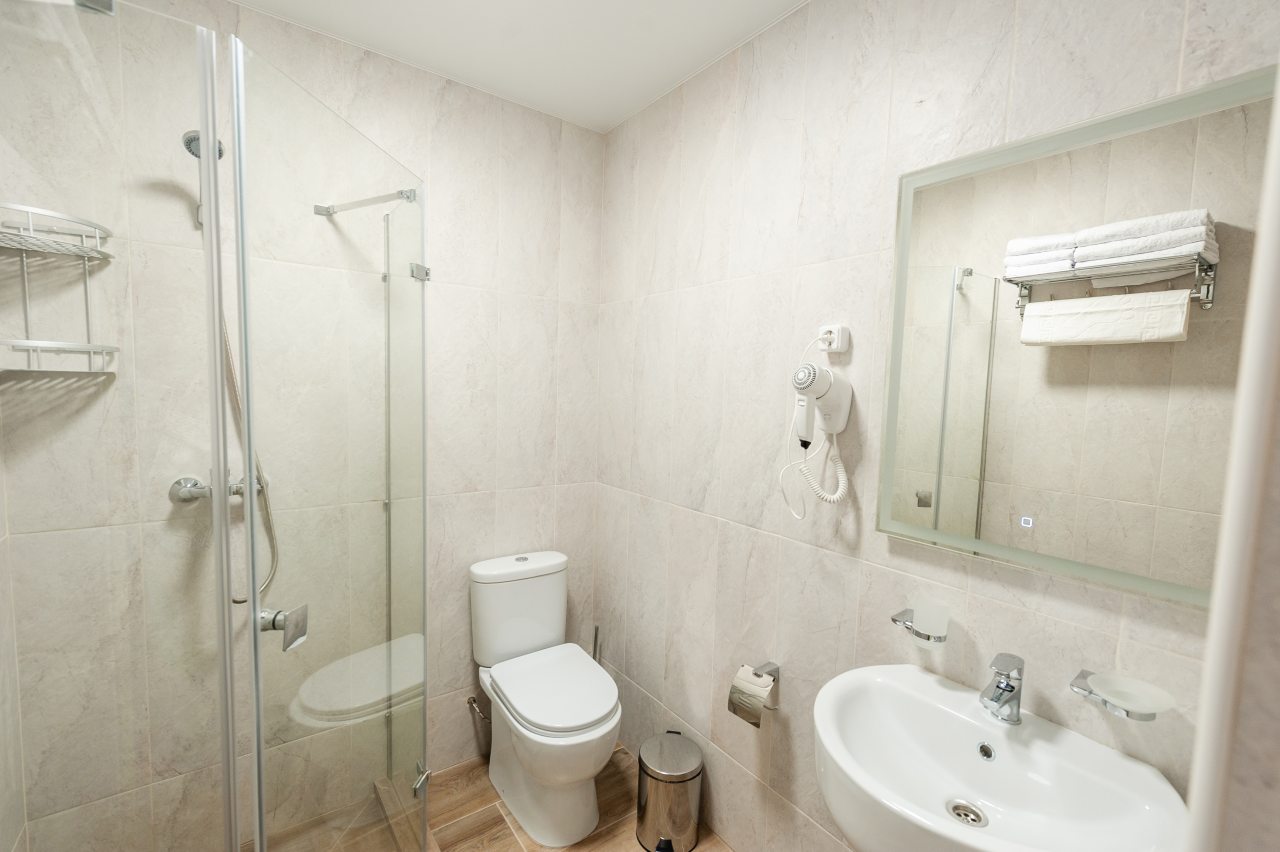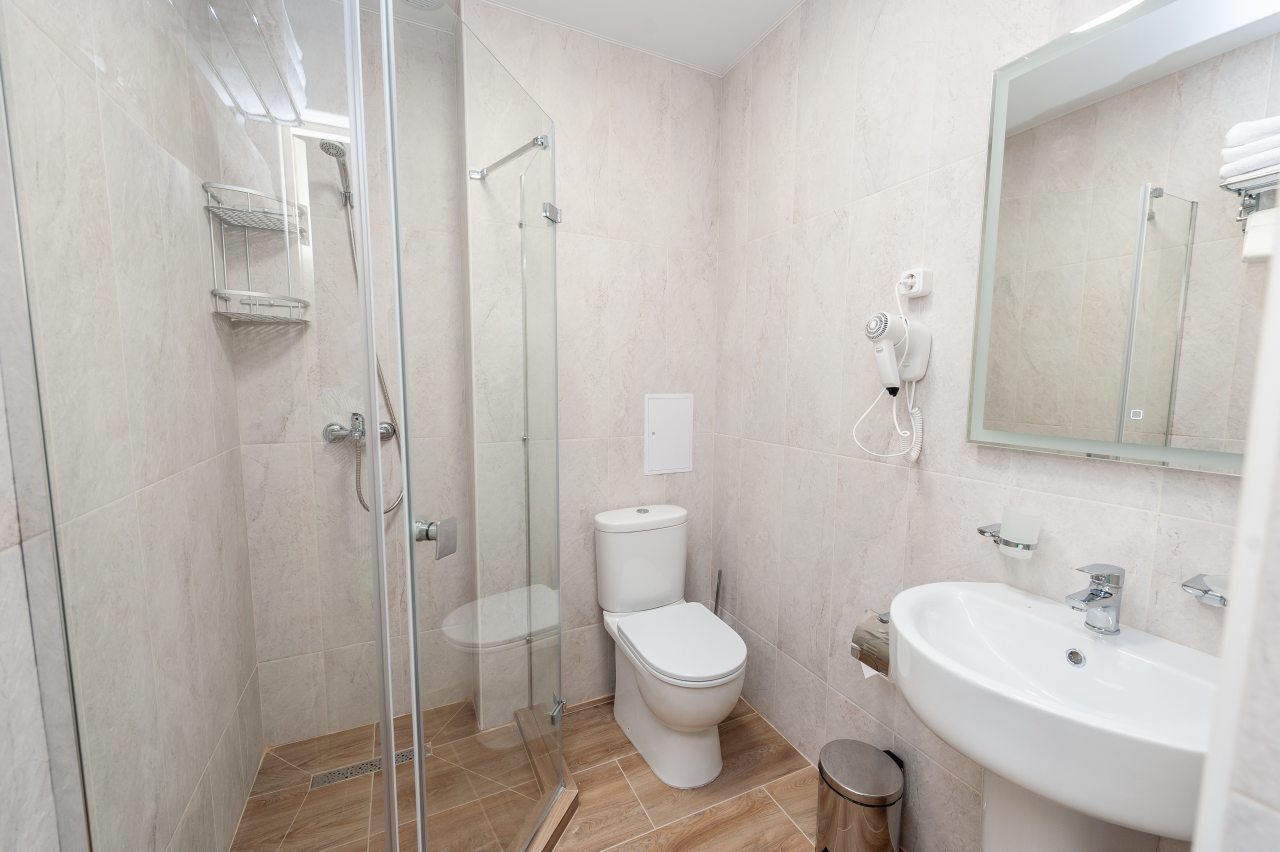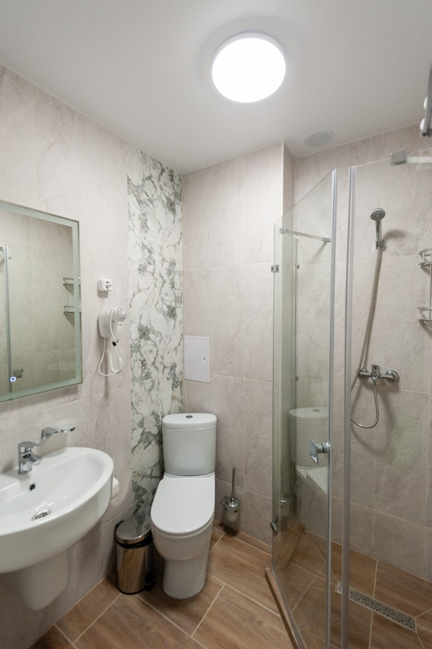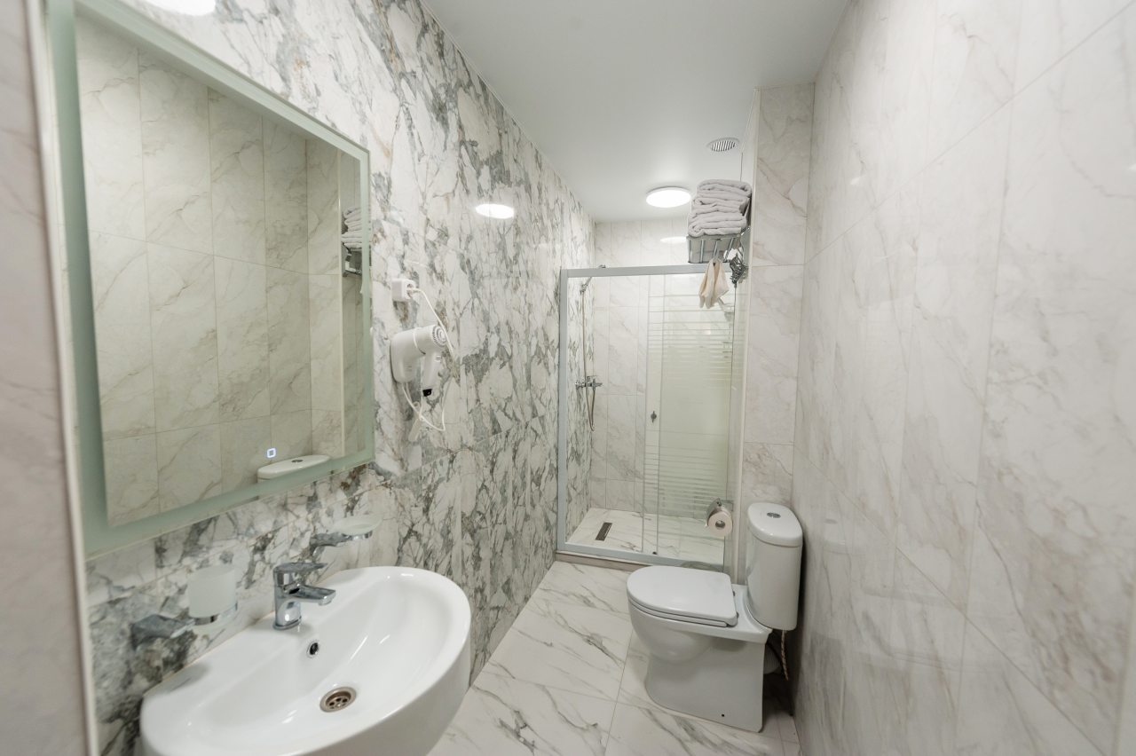 Для размещения отдыхающих подготовлены современные номера в приятной цветовой гамме. Они оснащены мебелью и техникой для отдыха: удобные спальные места с белоснежным постельным бельем, кондиционер, стол и стул, шкаф для одежды, телевизор. В ванной комнате есть фен и полотенца.