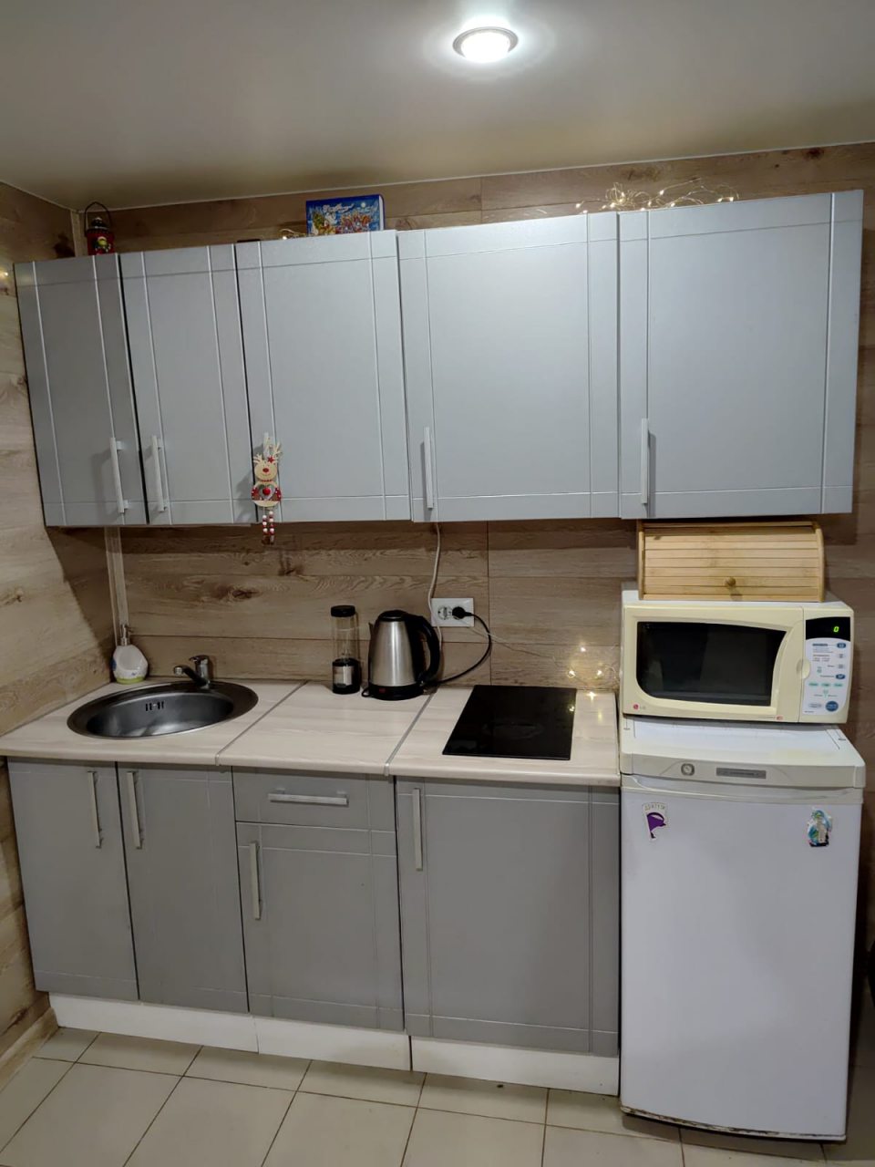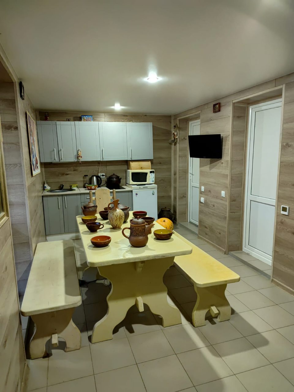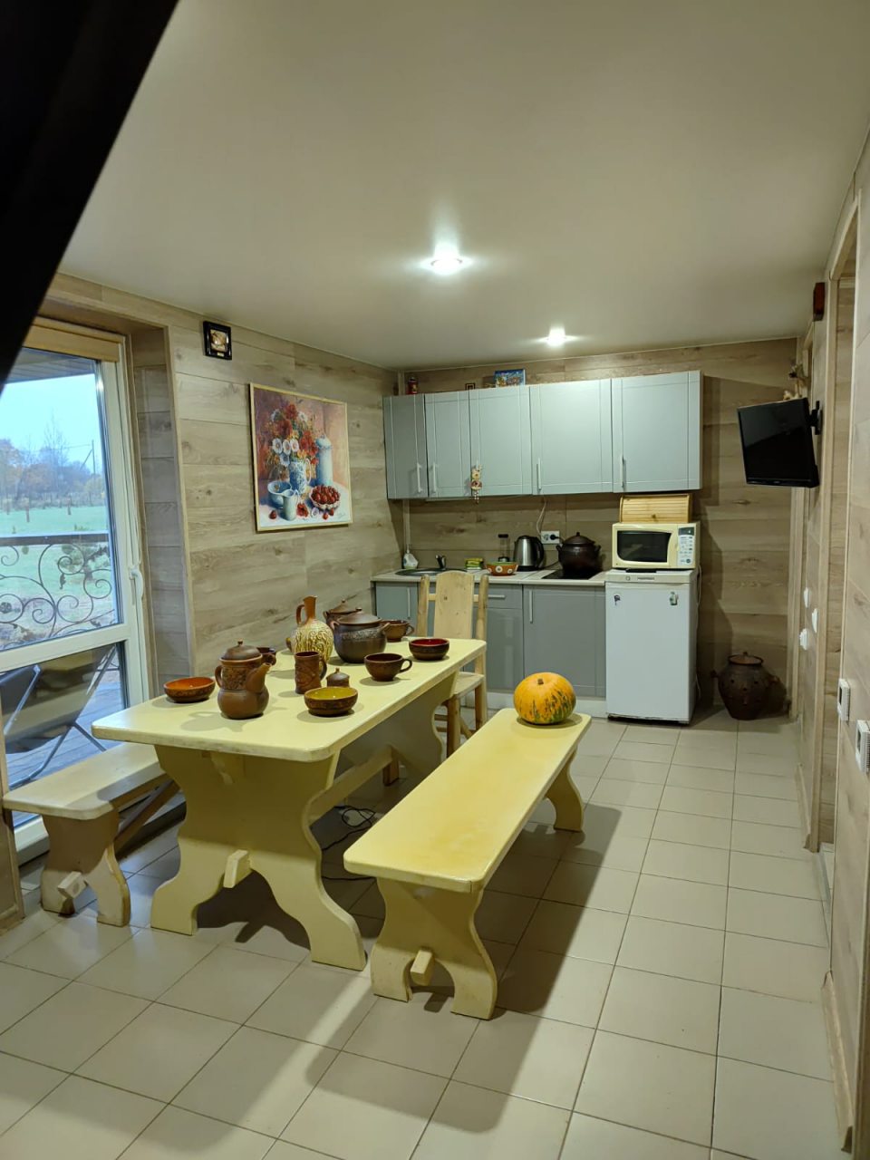 Для приготовления любимых напитков и блюд, а также неспешной трапезы имеется кухня, укомплектованная варочной панелью, СВЧ, холодильником, чайником, уютной обеденной зоной.