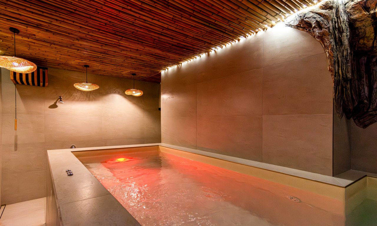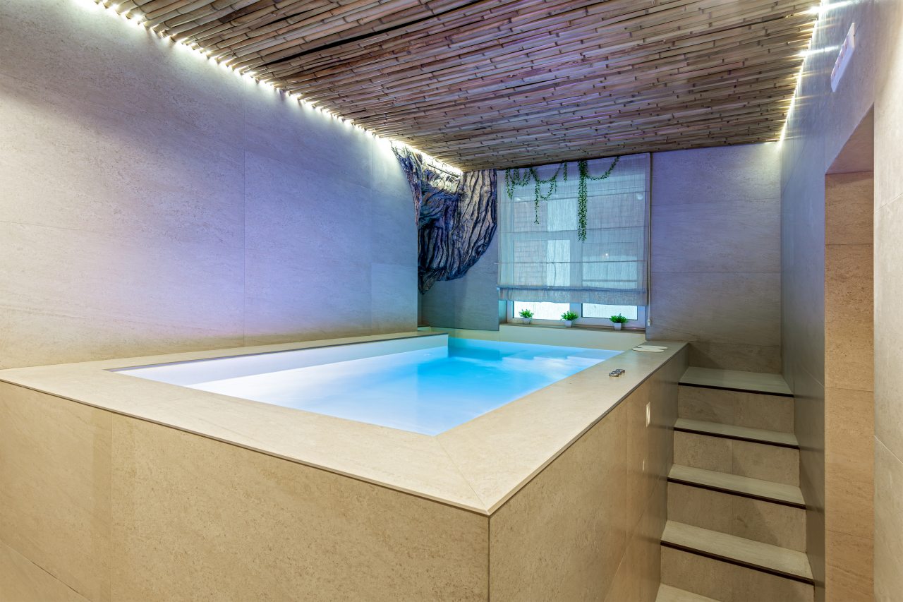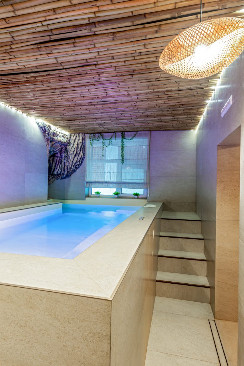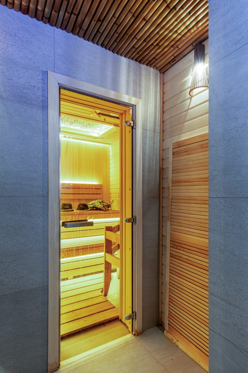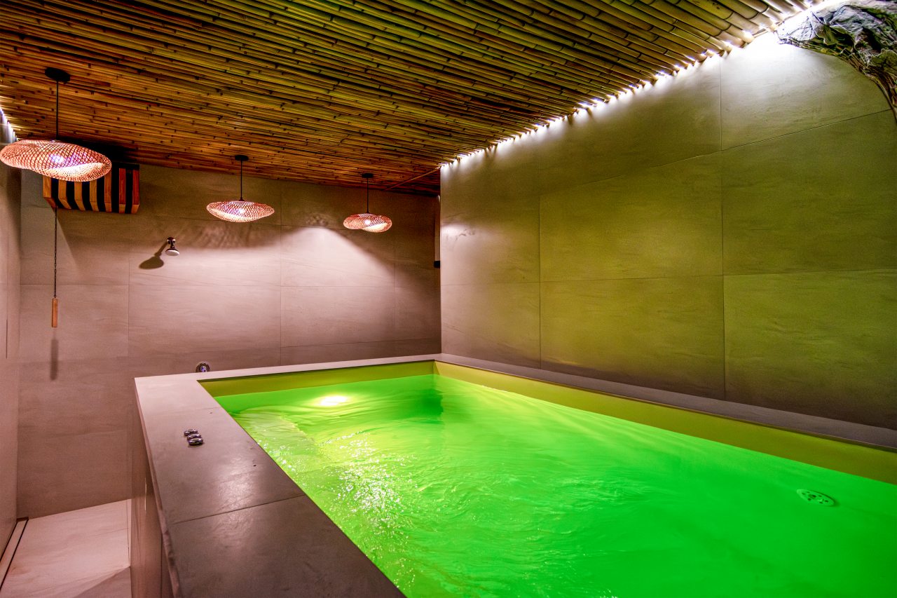 СПА-зона с подогреваемым бассейном, с гидромассажем, джакузи и завораживающим водопадом. Обливная бочка с холодной водой и душ в зоне бассейна. Сауна в зоне бассейна.
