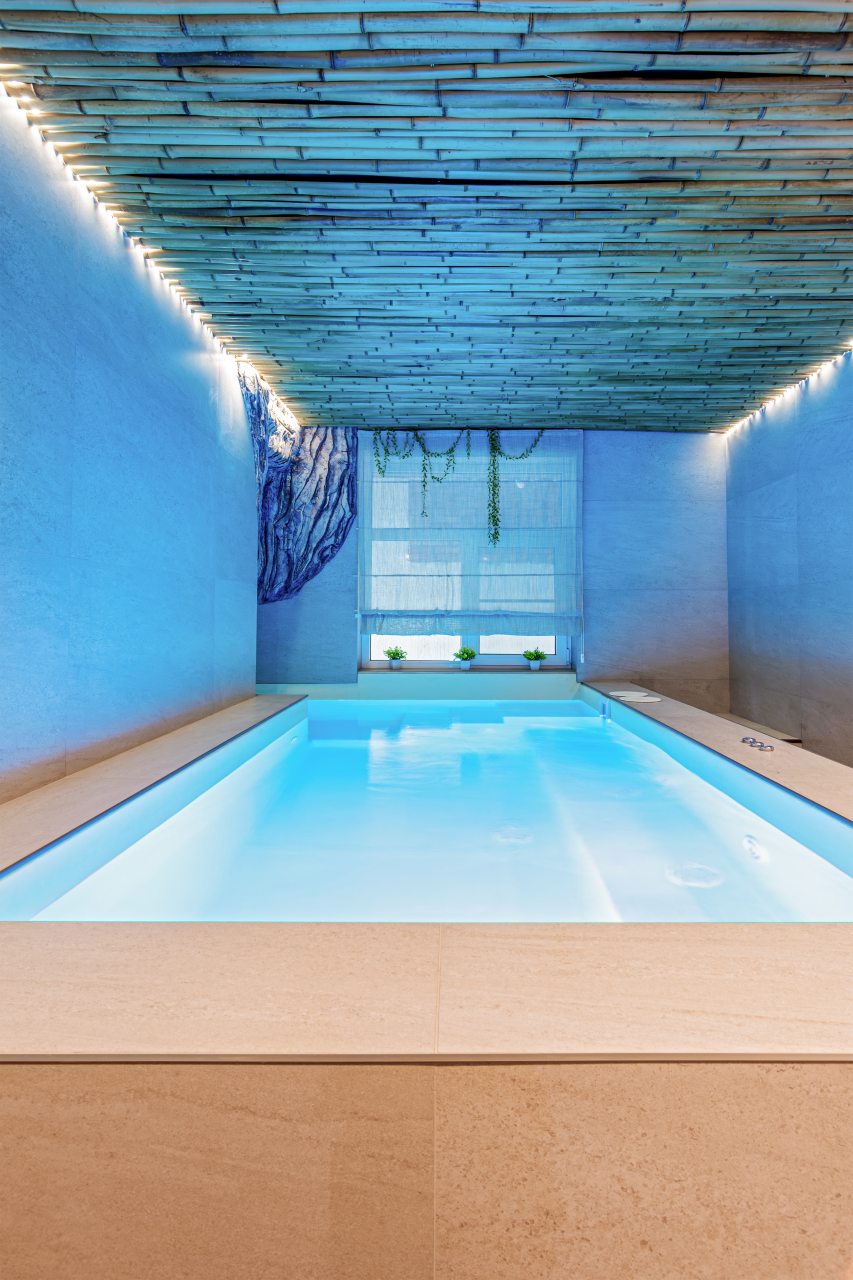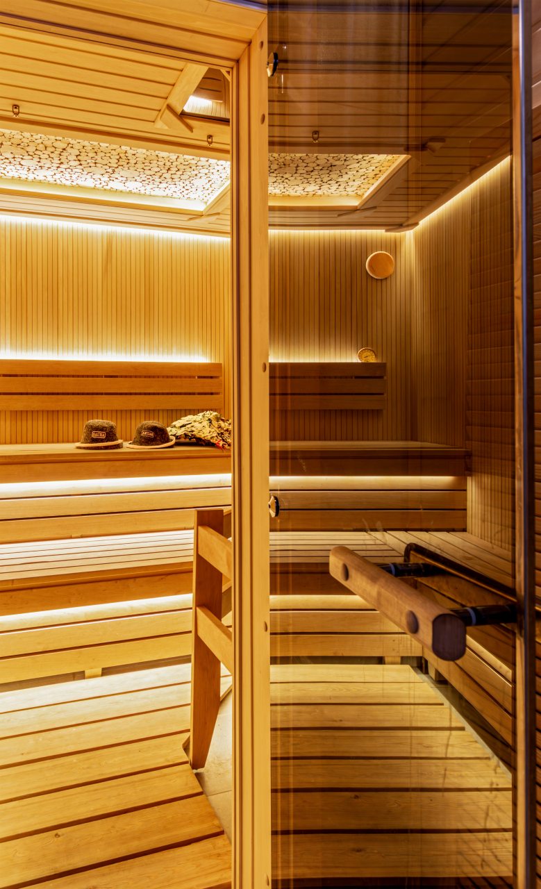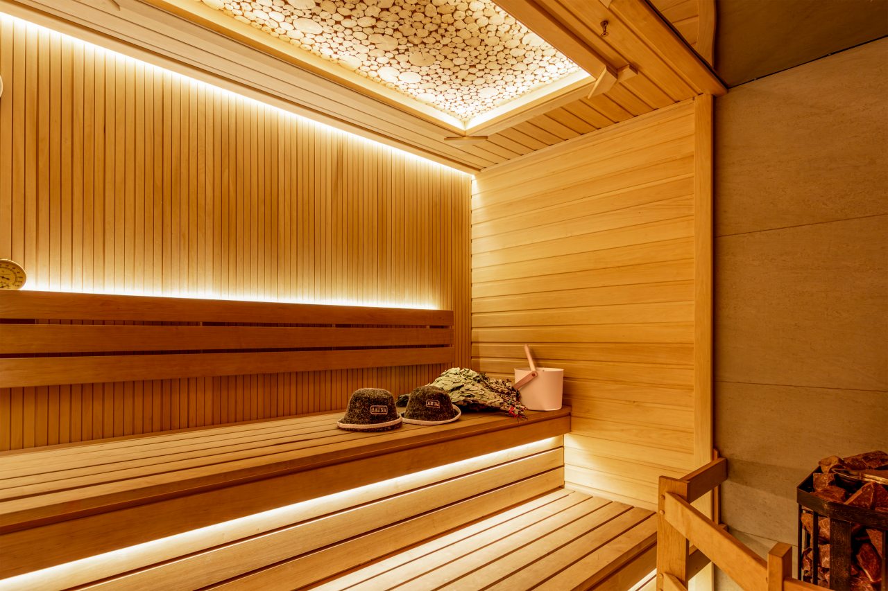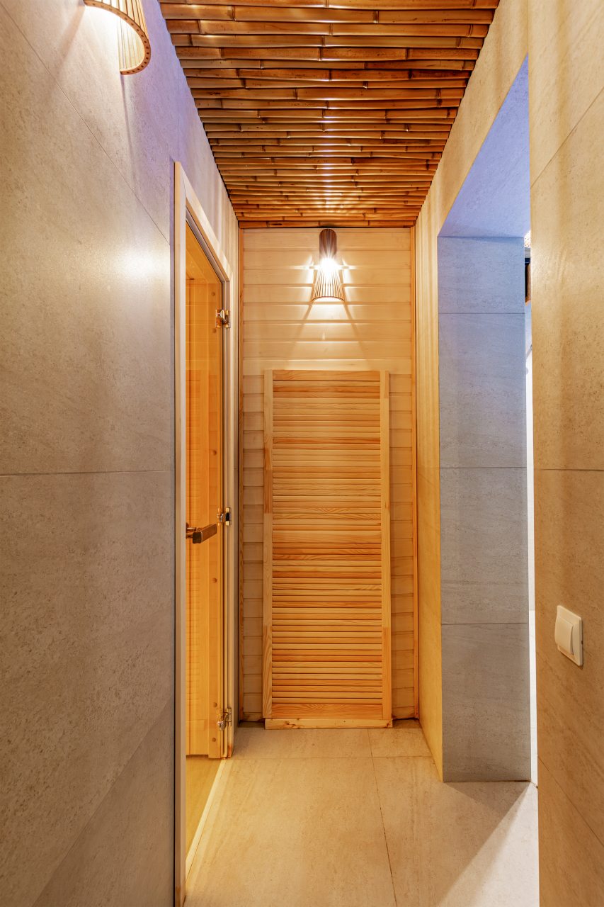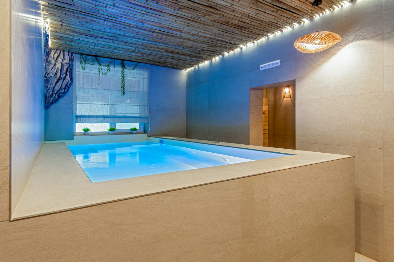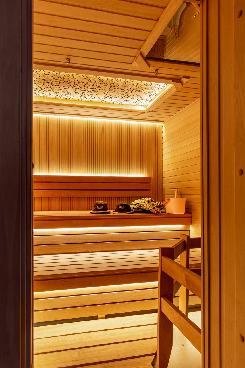 СПА-зона с подогреваемым бассейном, с гидромассажем, джакузи и завораживающим водопадом. Обливная бочка с холодной водой и душ в зоне бассейна. Сауна в зоне бассейна.