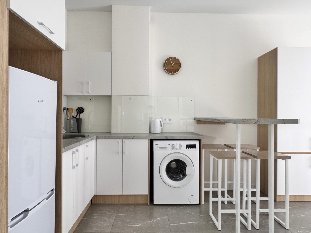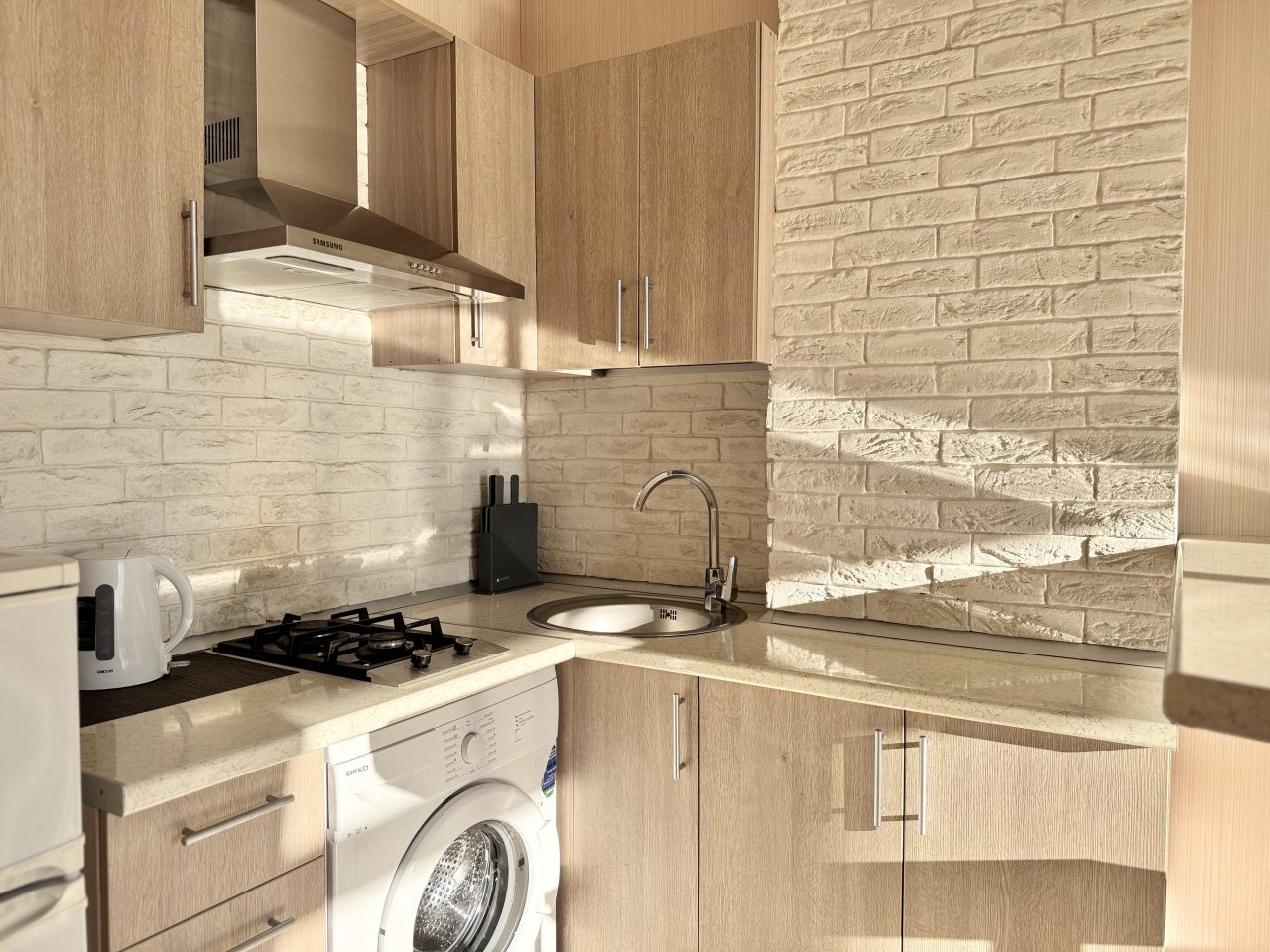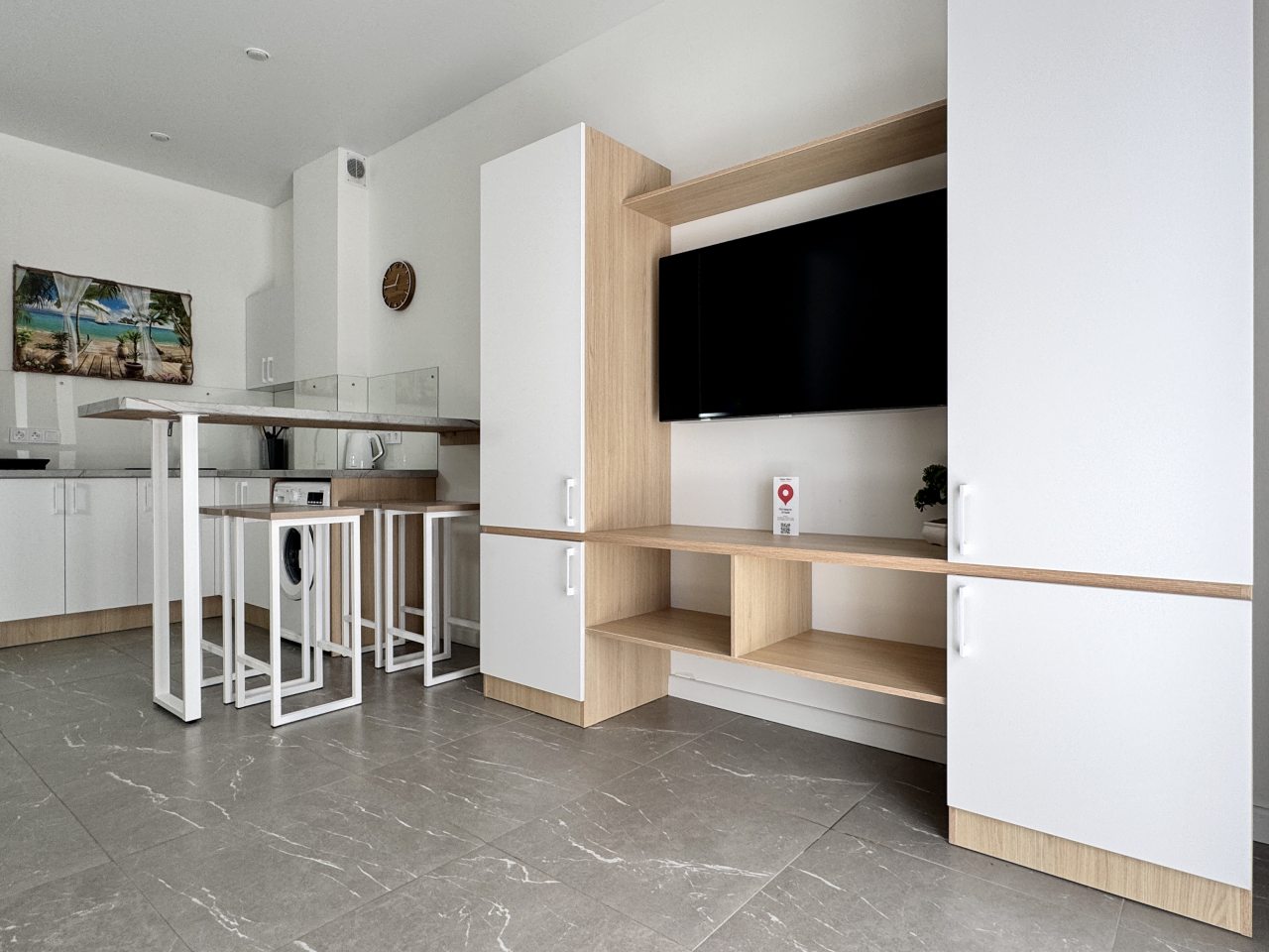 В некоторых номерах есть оборудованная кухня с холодильником, чайником, плитой. В пешей доступности — столовая и пиццерия.