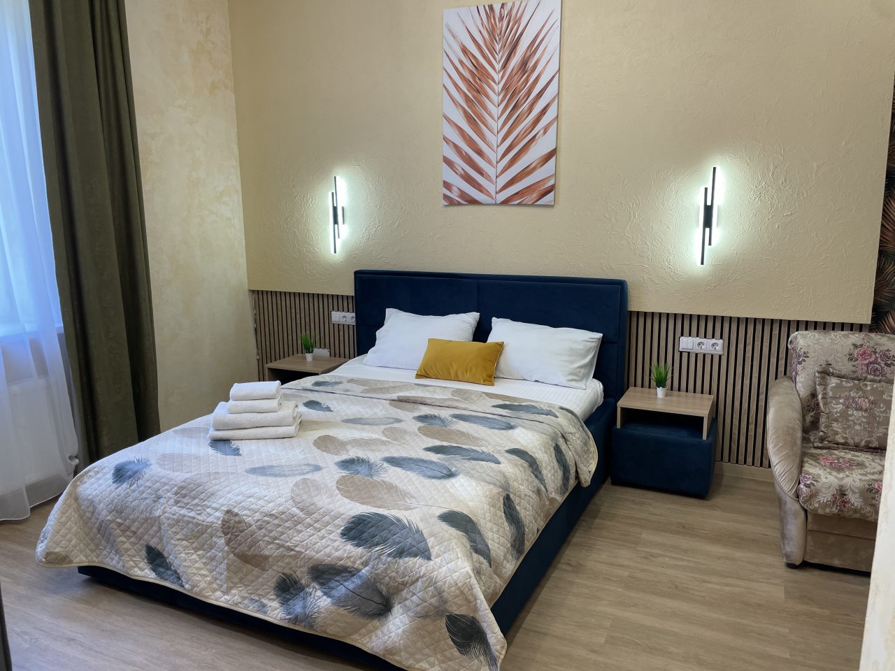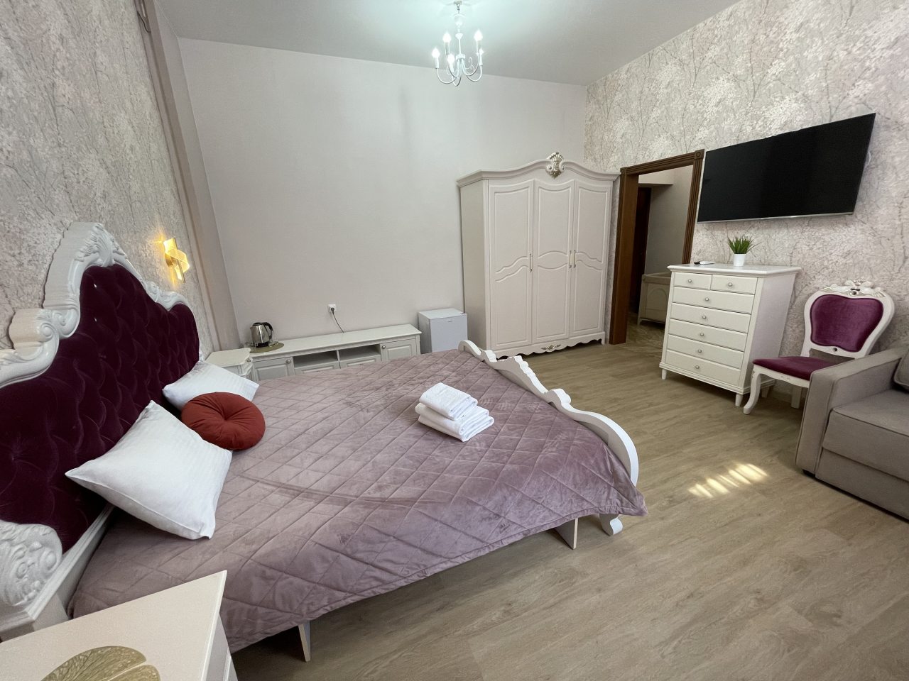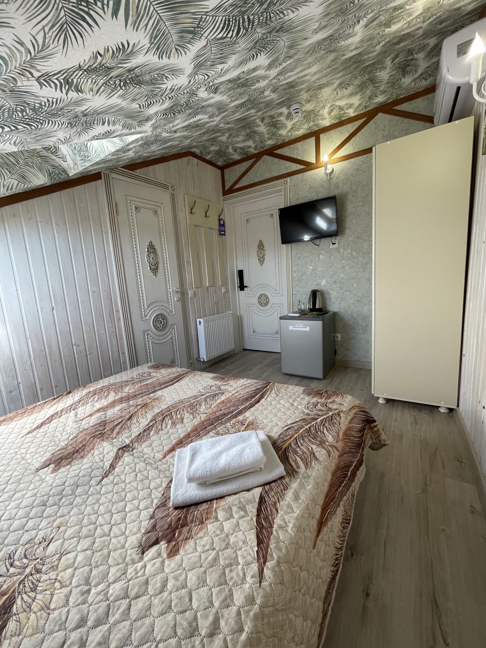 Оформление в стиле прованс и использование в интерьере пастельных тонов делает атмосферу номеров домашней и уютной. В них есть все необходимые удобства: комфортабельная мебель, телевизор, сплит-система, Wi-Fi, отдельная ванная комната с банными принадлежностями.