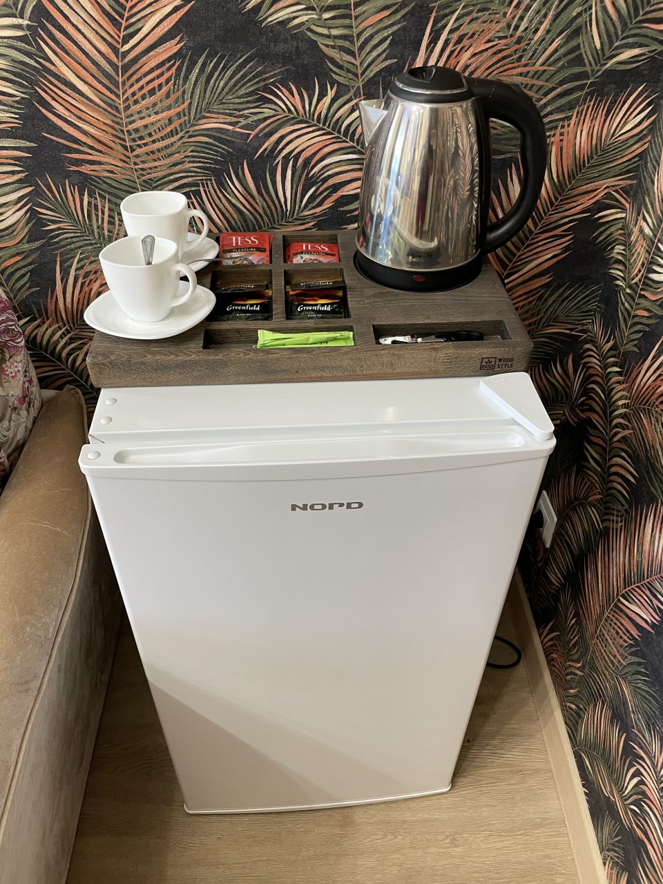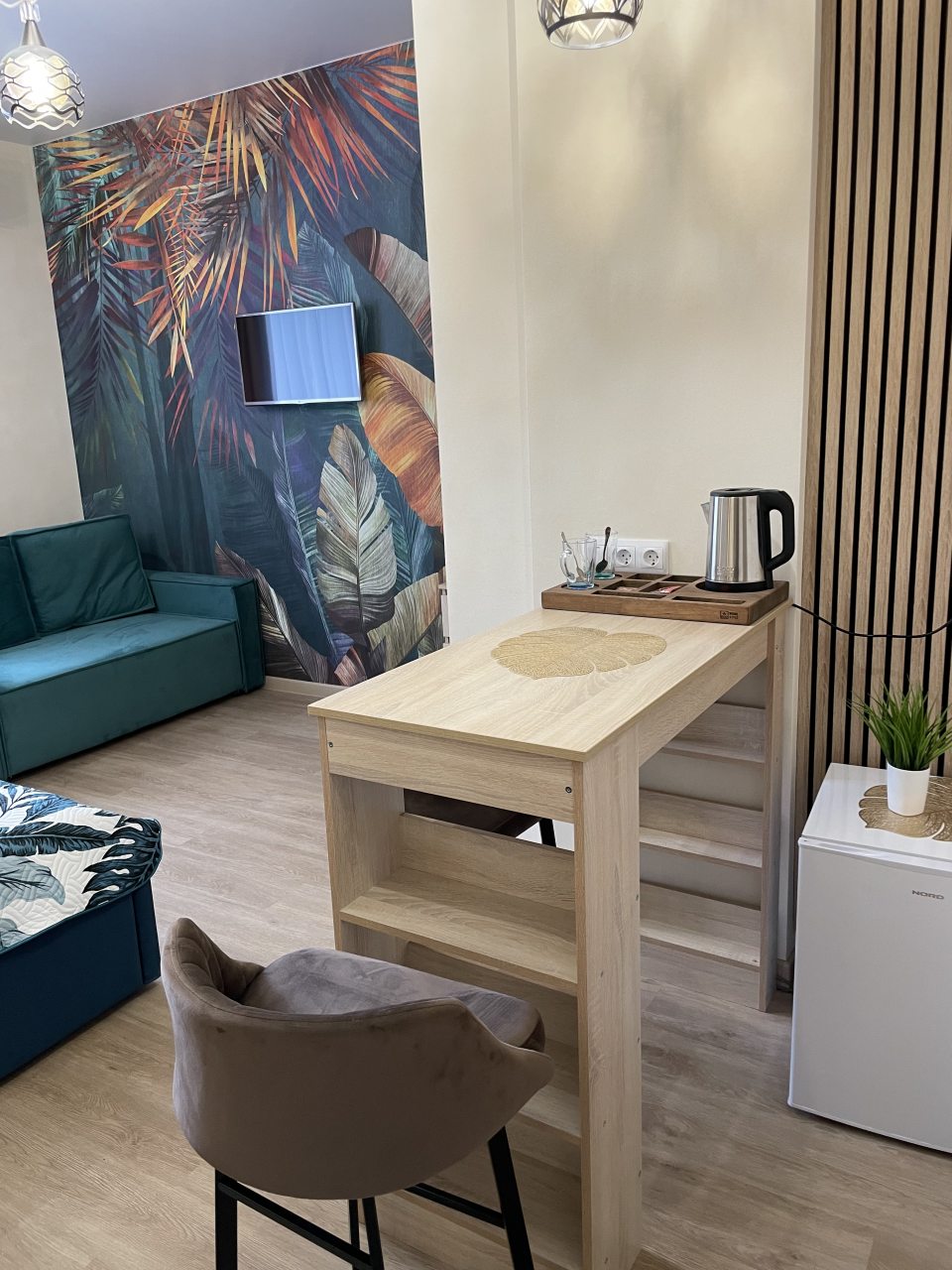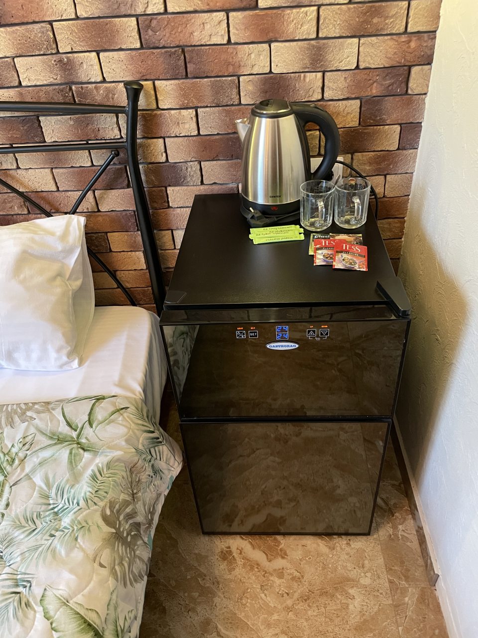 Горячая вода настраивается моментально, есть кулер рядом с номером, столики на улице для посиделок