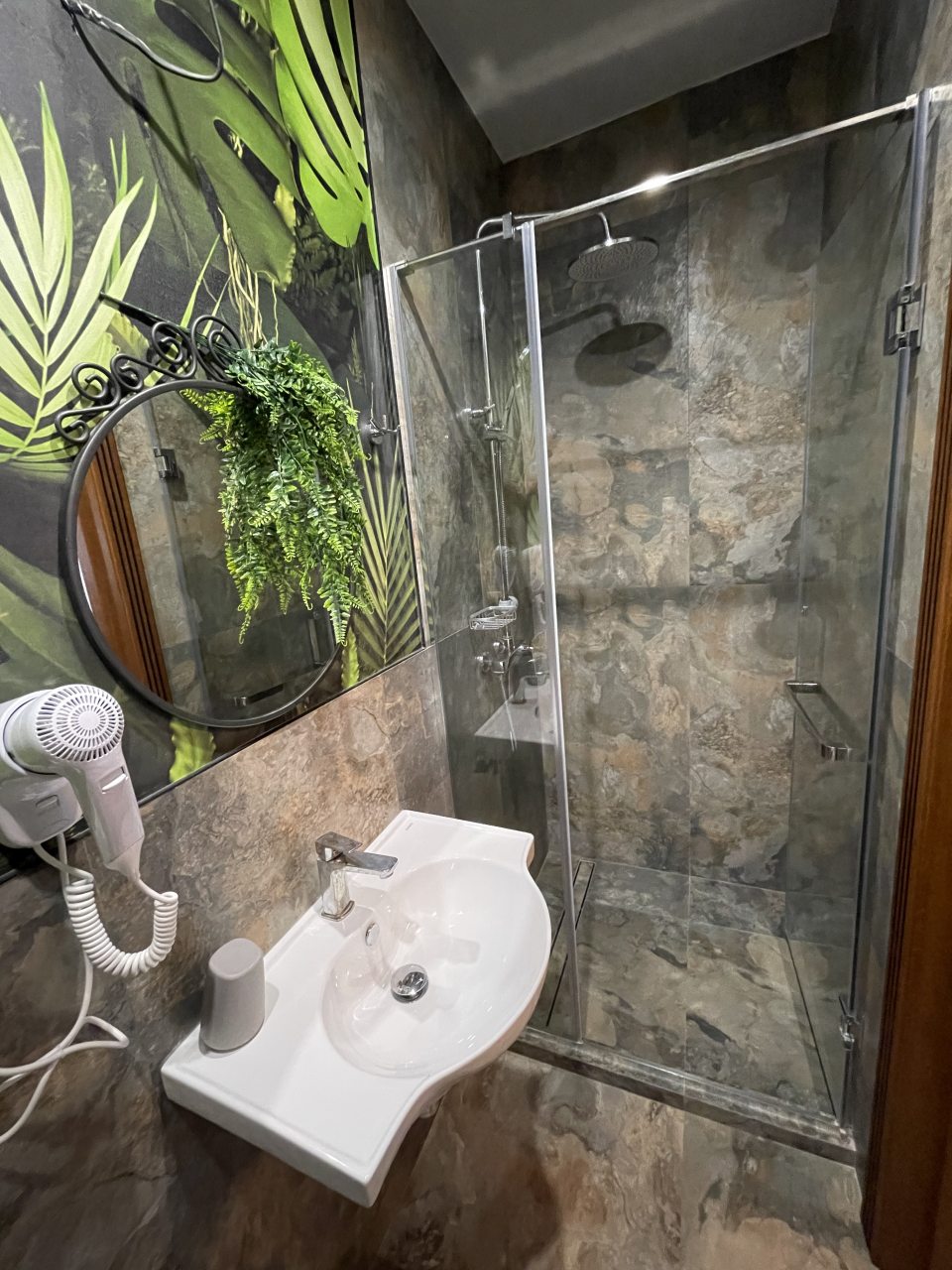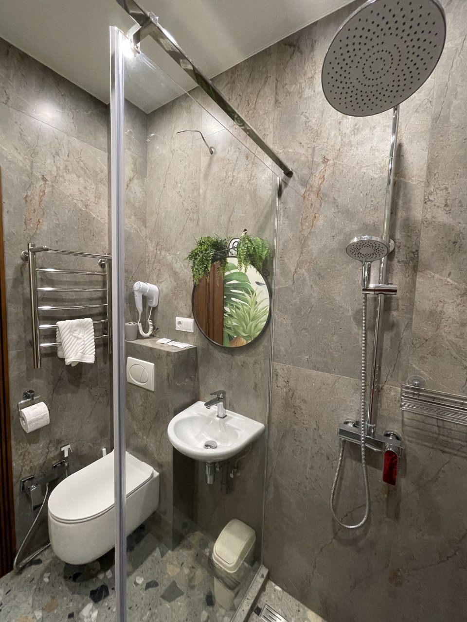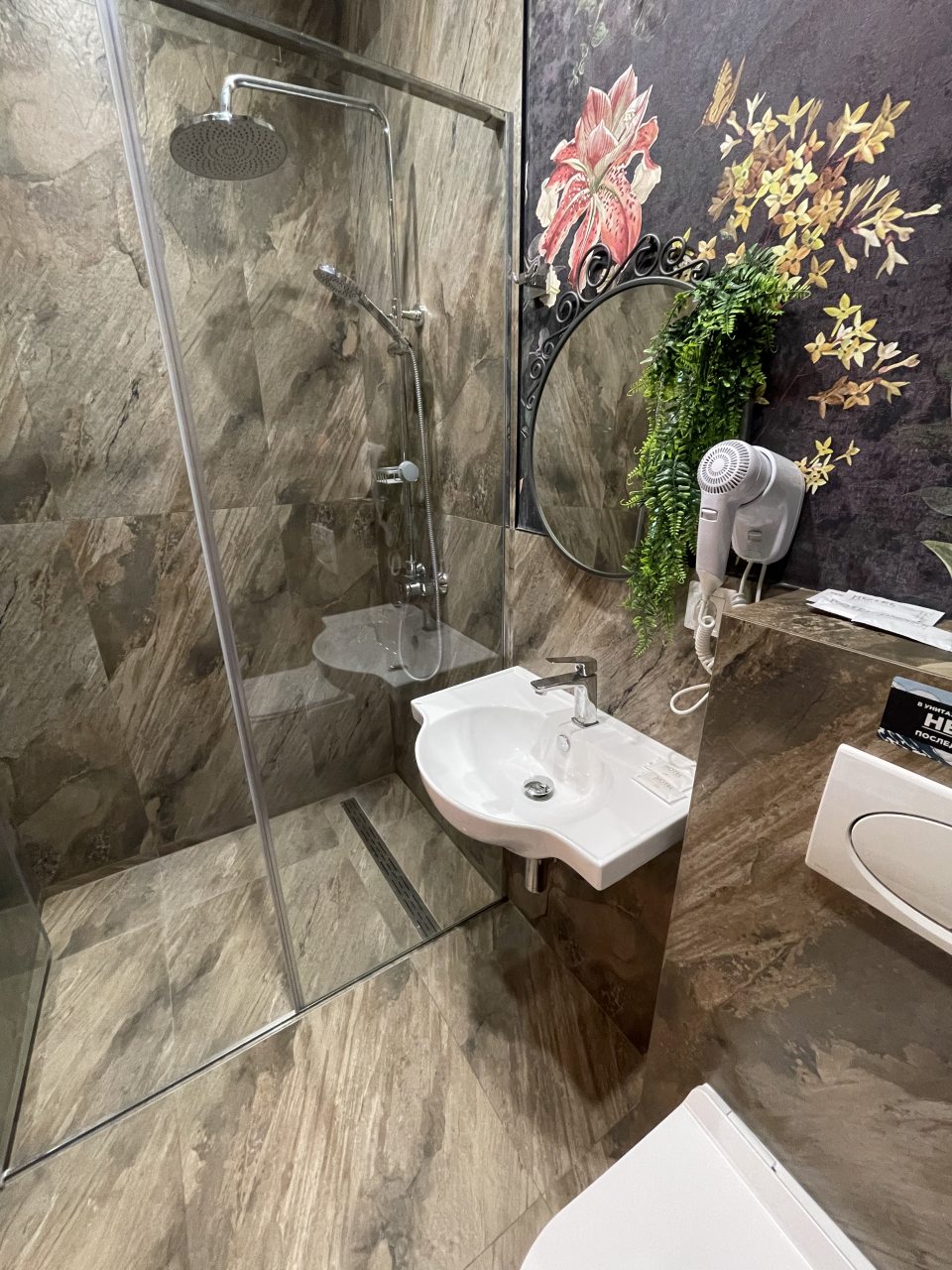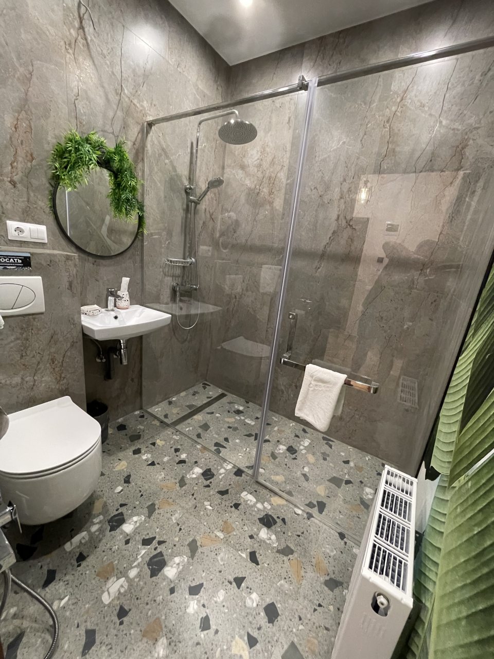 Отель находится недалеко от набережной. Красивый, на этажах есть места отдыха, диваны и столики. Внизу есть кафе, жалко погода подвела, не смогли посидеть из-за унагана. Очень красивые номера. Были много раз в Геленджике в разных отелях. Но в этот хочется вернуться. Спасибо за прекрасный отдых. Бронировали номер на мансарде, а нас заселили на 2 этаж. Даже номер представили лучше! Напротив разные магазины: КБ, Алкотека, магнит.