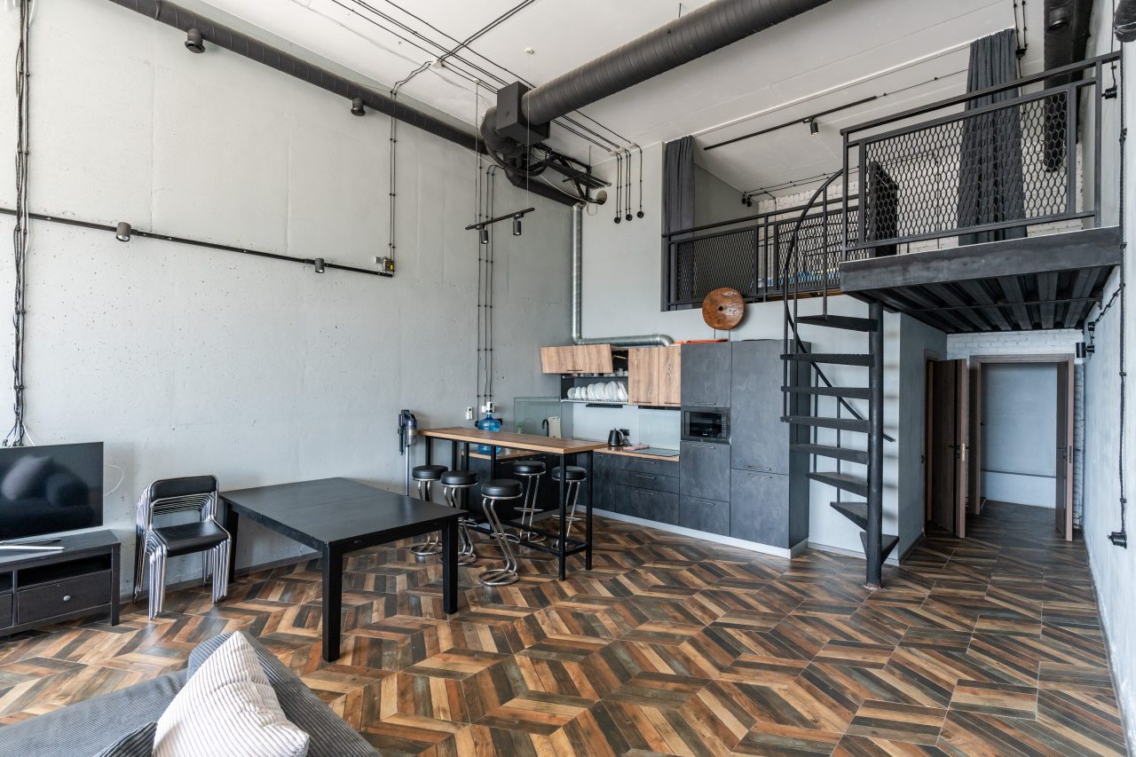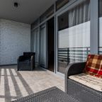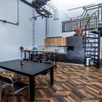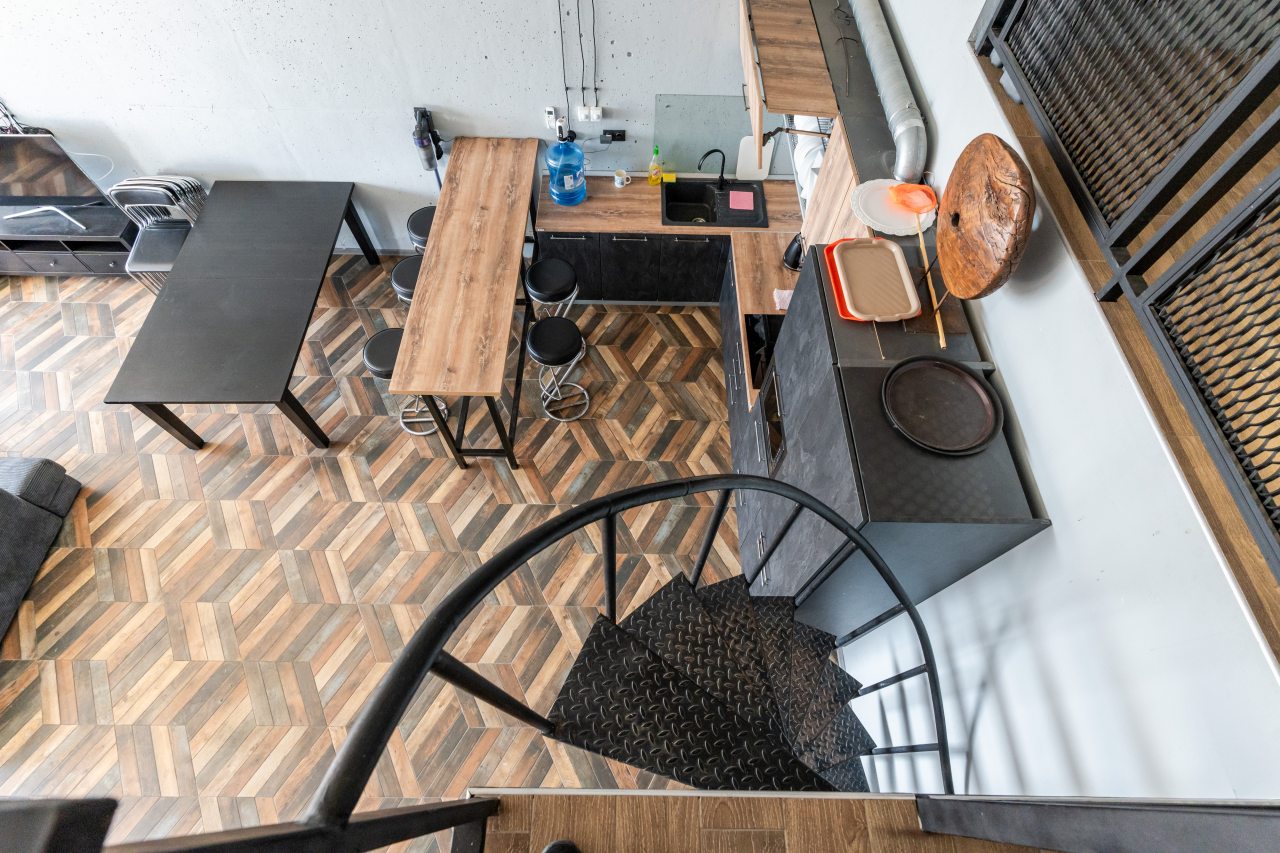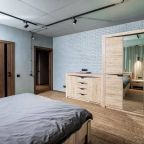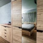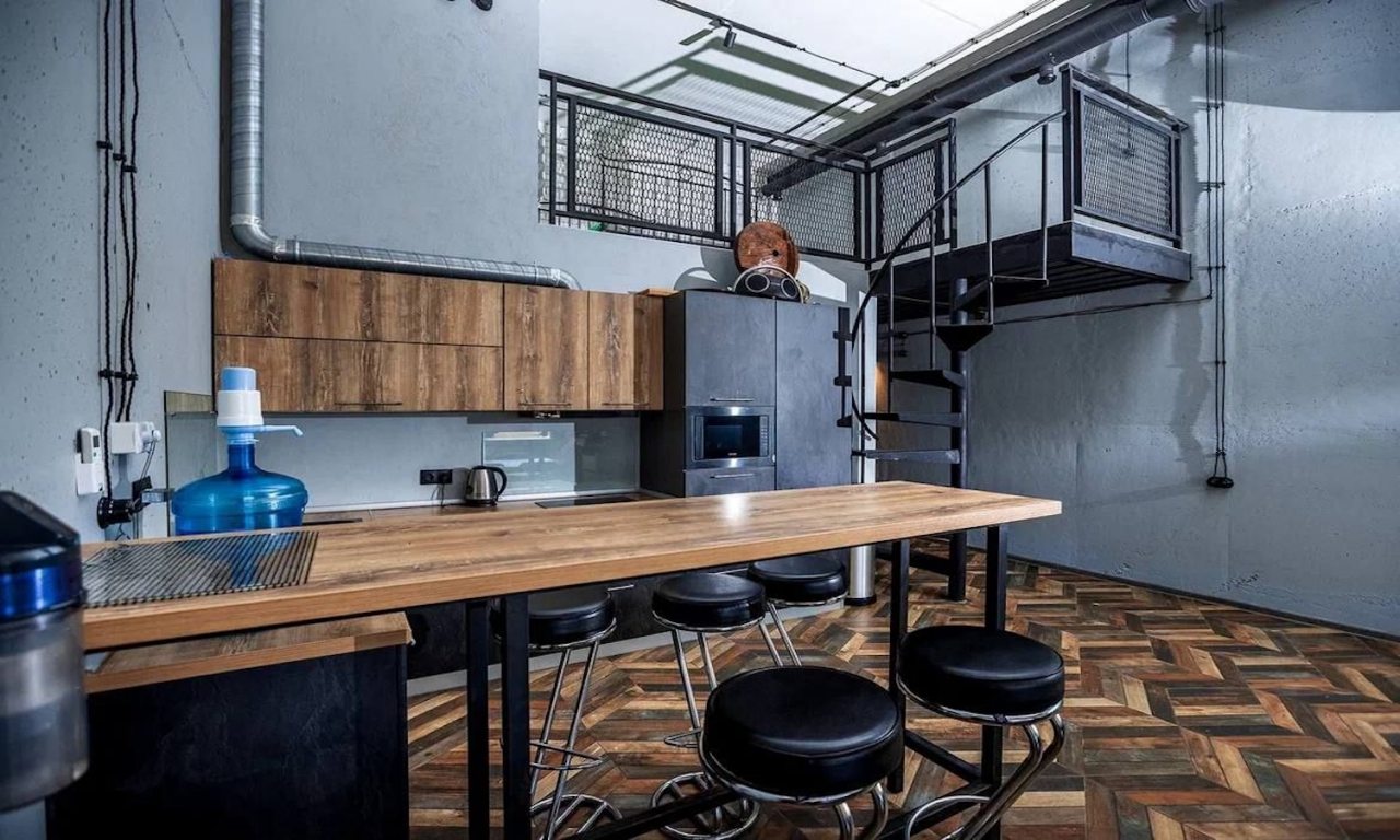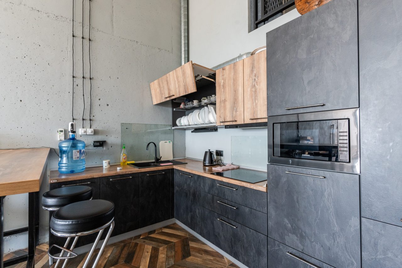 Кухня оснащена стильным гарнитуром, варочной панелью, электрочайником, микроволновой печью, вытяжкой, набором посуды и др. Пообедать можно в ближайшем кафе.