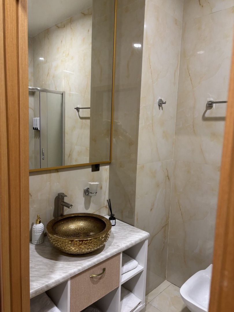 Из недостатков: шумоизоляция плохая, не было лицевых и ножных полотенец, только банные, коврика в ванной нет. В ванной в зимнее время года холодно, душ принимвть не комфортно. На кровати два матраца друг на дружке, один сьезжает, не удобно спать.