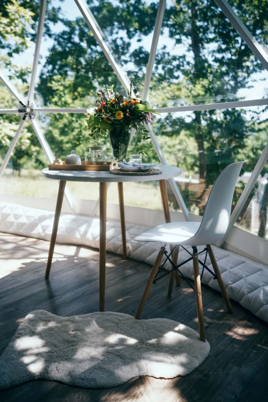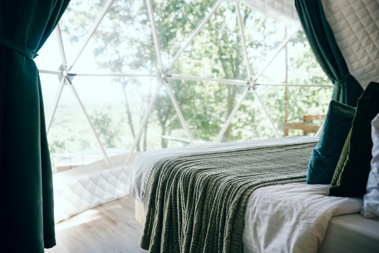 Гостям предлагается необычный вариант размещение — проживание в шале в виде сферы. Домик имеет панорамные окна с красивым видом на природу. Внутри двухэтажная кровать с удобным ортопедическим матрасом, которая создана для крепкого сна. Если будет жарко, можно включить кондиционер. Также имеется собственная ванная комната с душевой кабиной.