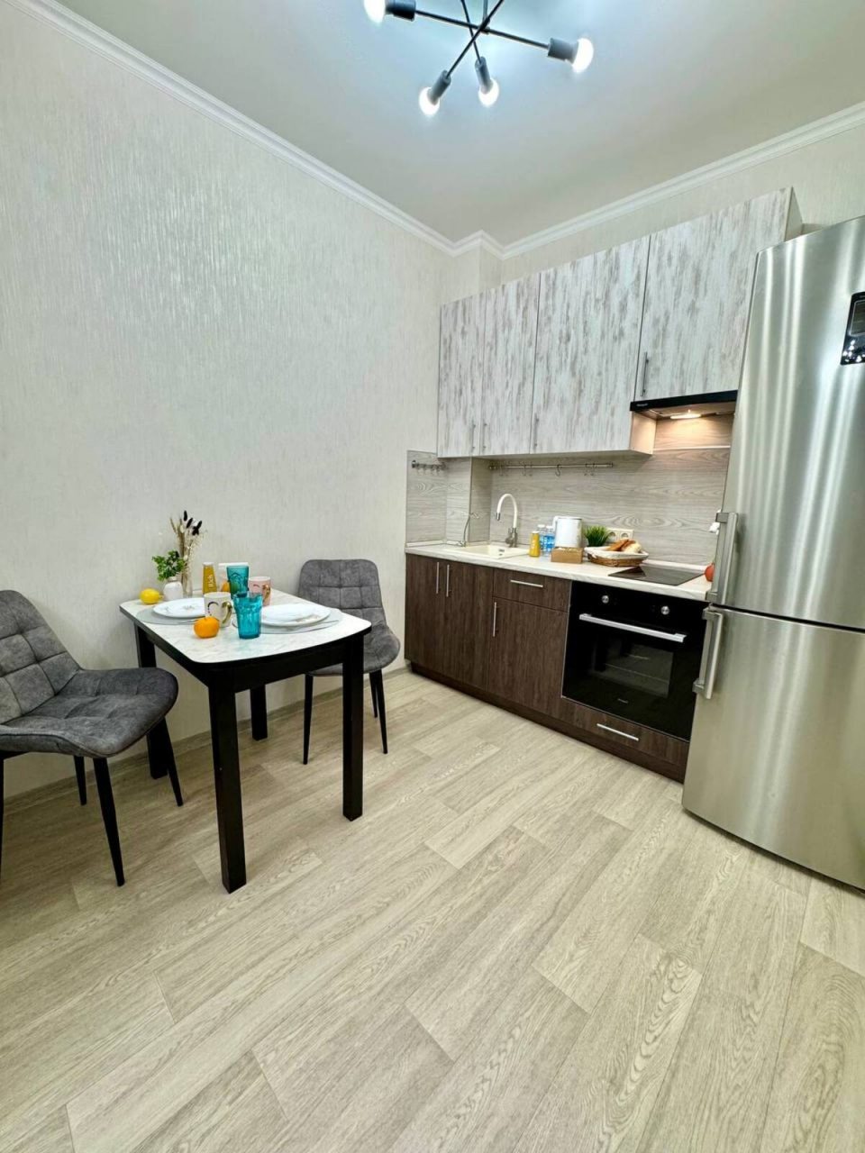 Кухонная зона оснащена варочной панелью, духовым шкафом, вытяжкой, холодильником, чайником и обеденной зоной для приема пищи.
