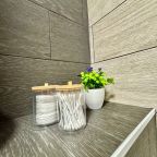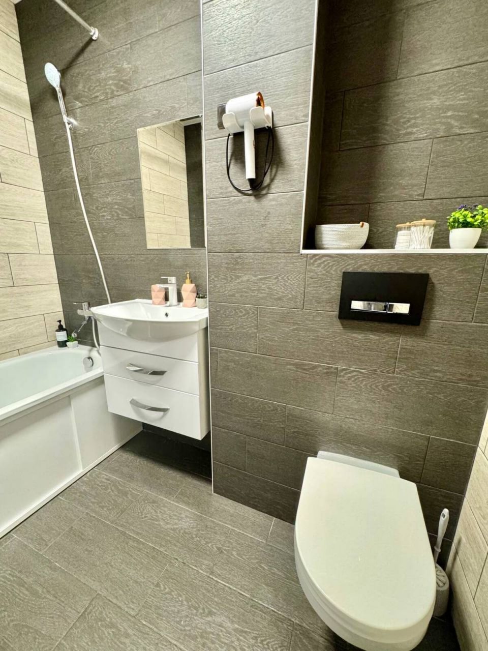 Внутри гостей ожидает большая и удобная двуспальная кровать, шкаф с зеркалом в полный рост, два мягких дивана с телевизором, а также полноценная ванна, туалетно-гигиенические принадлежности и стиральная машина.