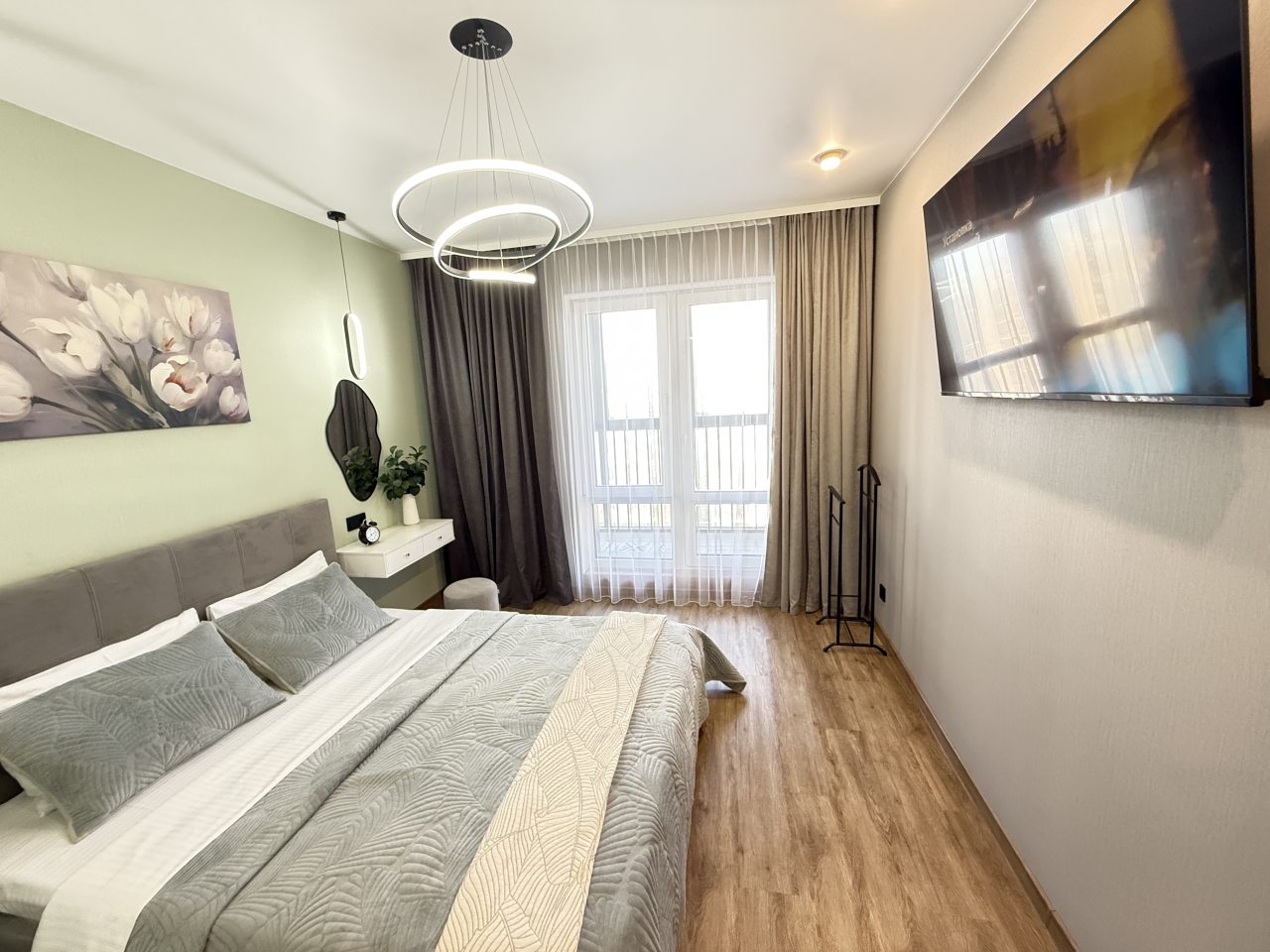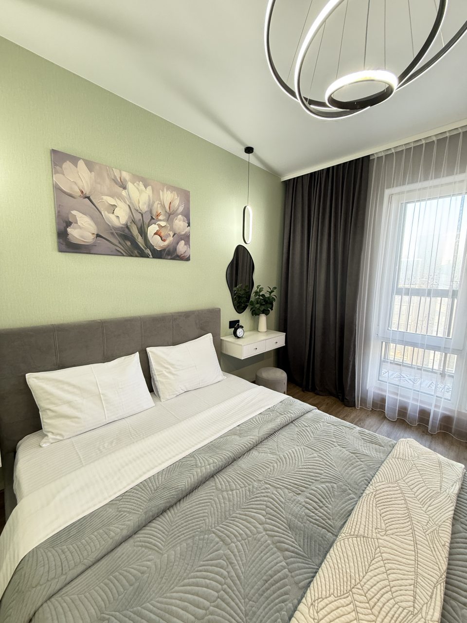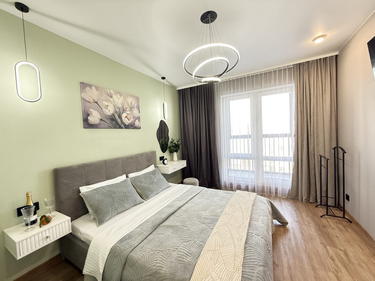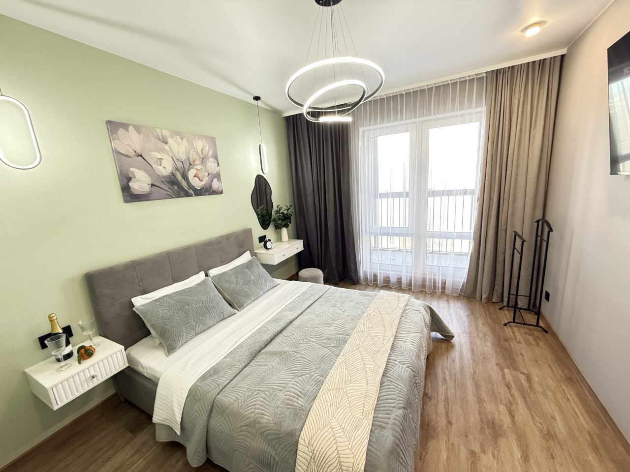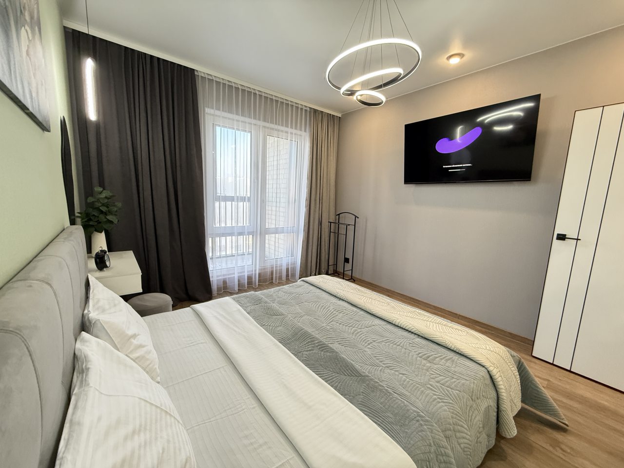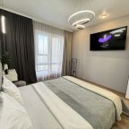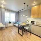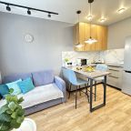 Стильная квартира оснащена комфортабельной мебелью и необходимой техникой: удобными спальными местами, обустроенной лоджией, ванной со стиральной машиной, интернетом и телевизором. Благодаря затемненным шторам и звукоизоляции в квартире — находящийся рядом аэропорт не будет нарушать покой гостей.