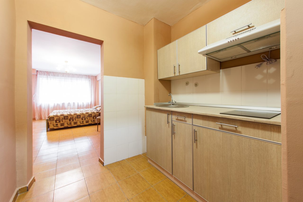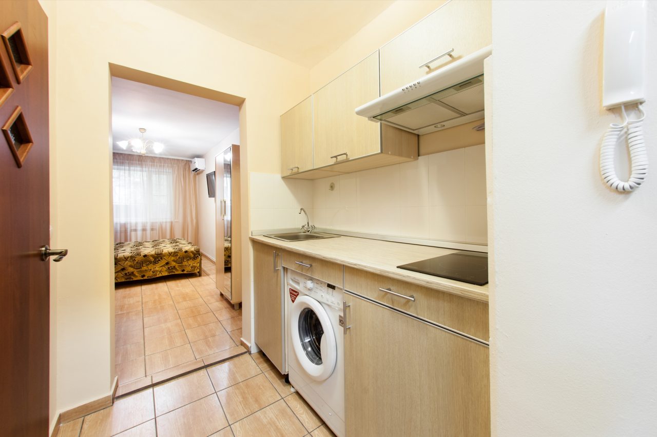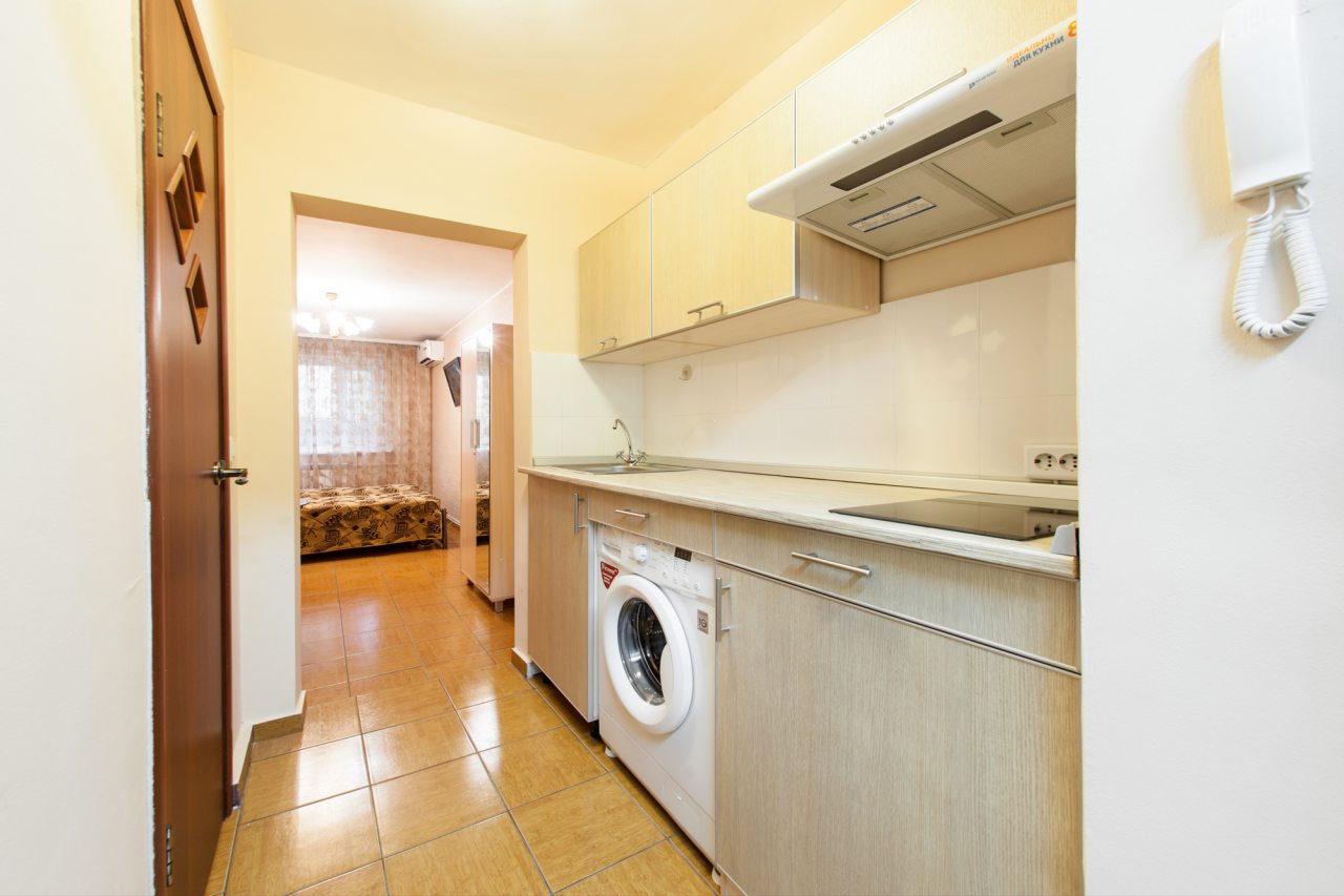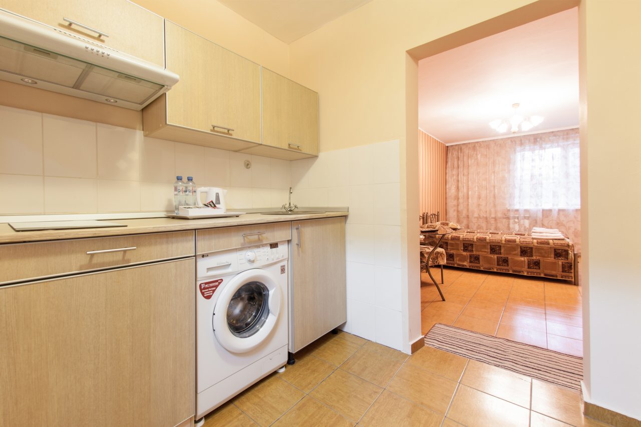 Кухонная зона оснащены гарнитуром и бытовой техникой. Пообедать можно в одном из ближайших кафе.