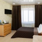 Среди основных удобств — двуспальная кровать, мягкий и вместительный диван, комод, телевизор, затемненные шторы, просторный балкон с панорамными окнами и зоной отдыха, ванная комната со стиральной машиной.