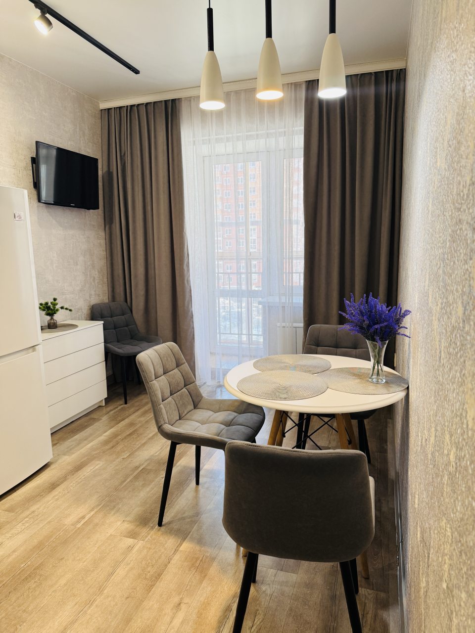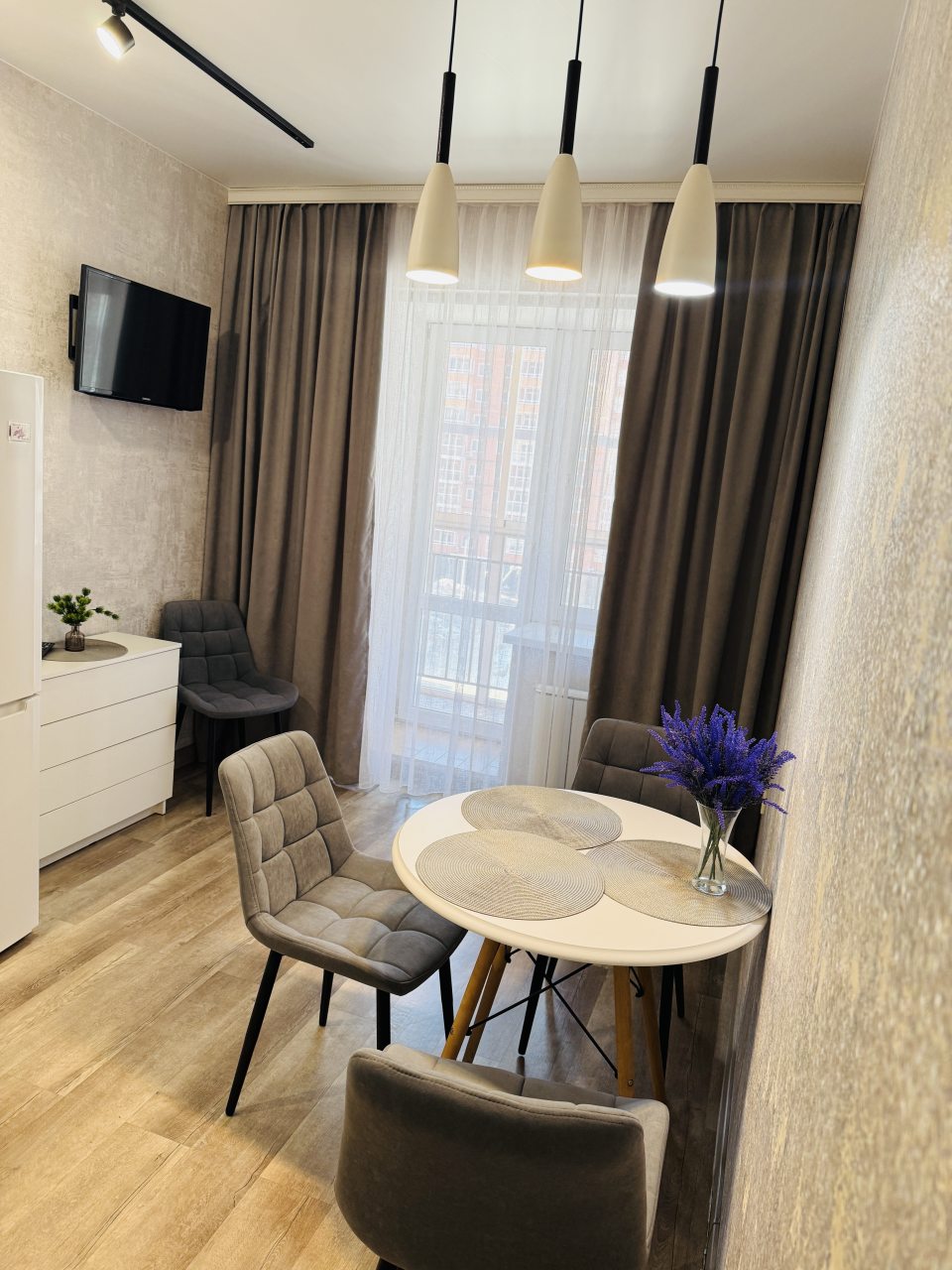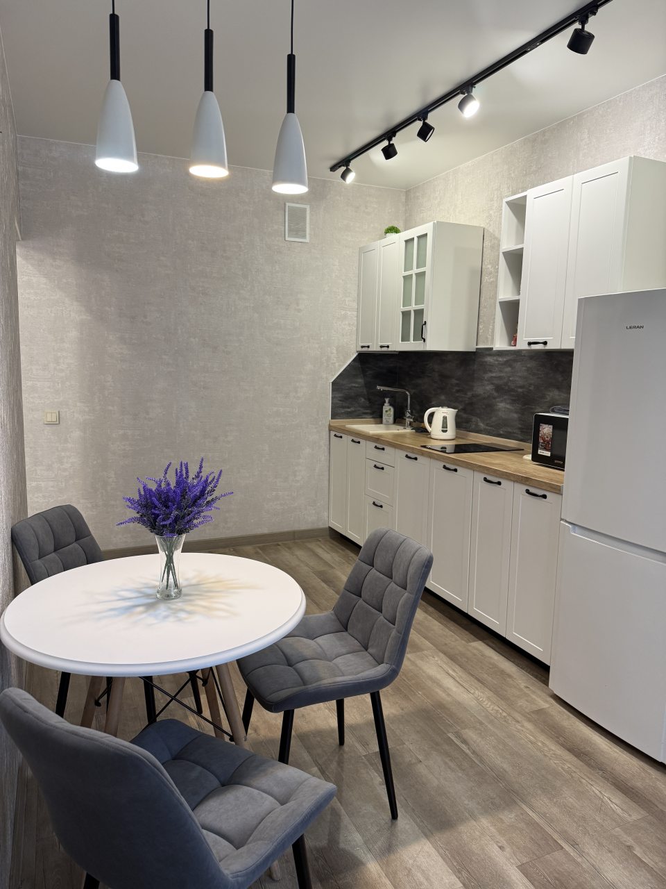 Далековато от центра, а в остальном все замечательно. Понравился интерьер в квартире и цена за двоих. Места достаточно, хороший район. В самом доме очень много разных кафе и магазинов. Остановка недалеко. В квартире чисто.