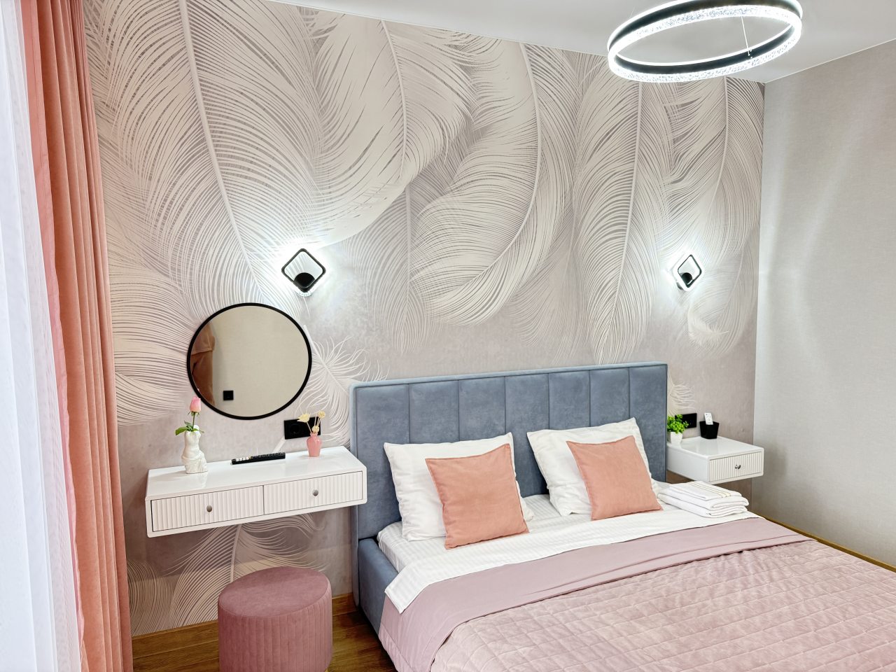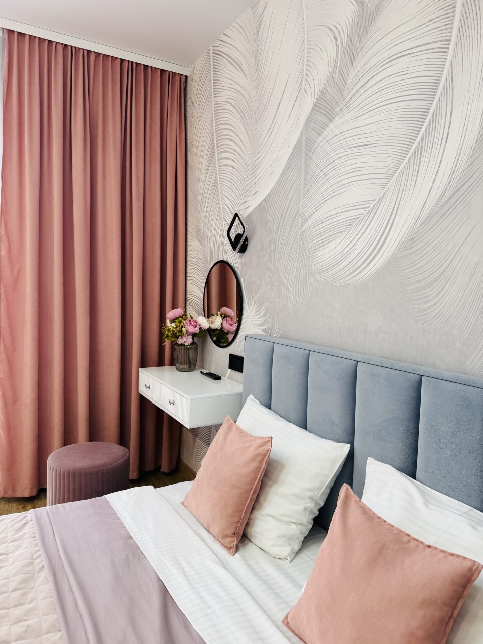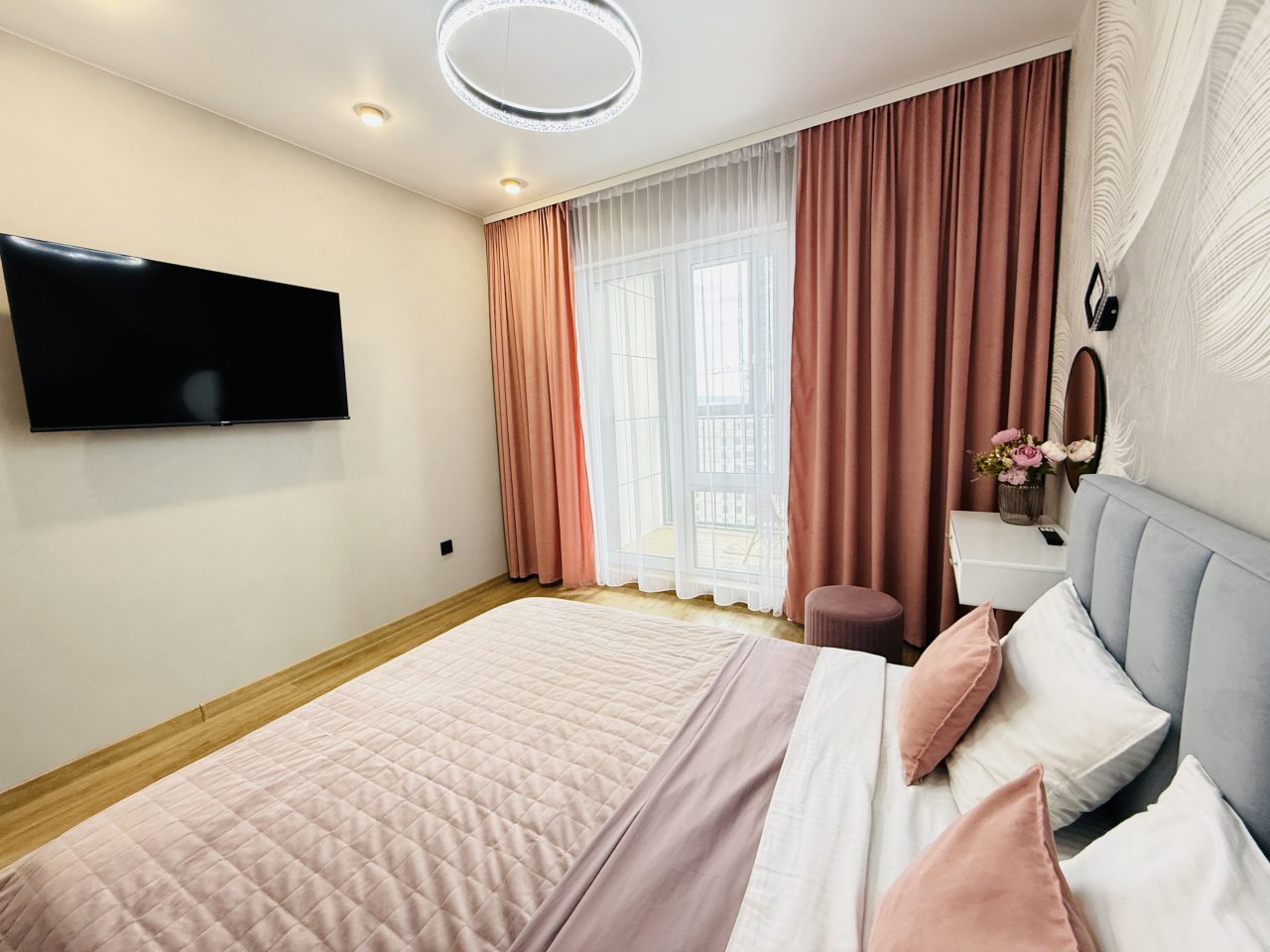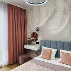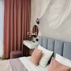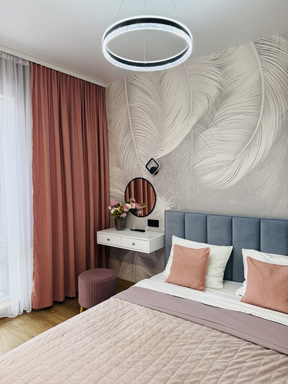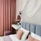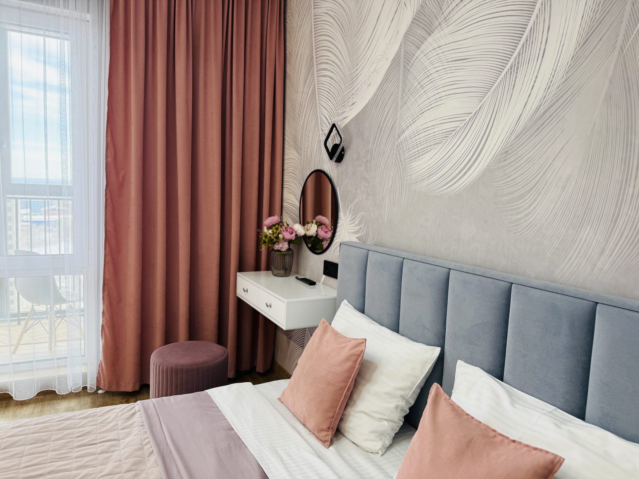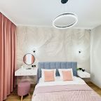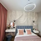 В Иркутске мы брали апартаменты на несколько дней. Красивый здесь интерьер, интересно оформлена спальная зона. Люстра красивая, свет есть в прикроватной зоне. Кровать с матрасом хорошая, с мягким изголовьем. При этом все вычищено, пыли, грязи даже в местах сгибов нет. На кухне предусмотрено все необходимое для приготовления еды. Санузел в таком же хорошем состоянии. Для хранения одежды организована гардеробная.