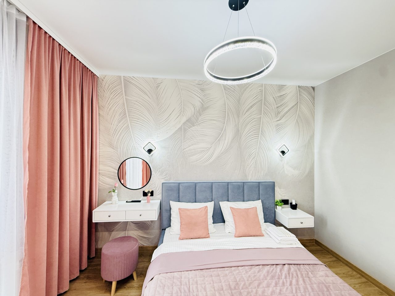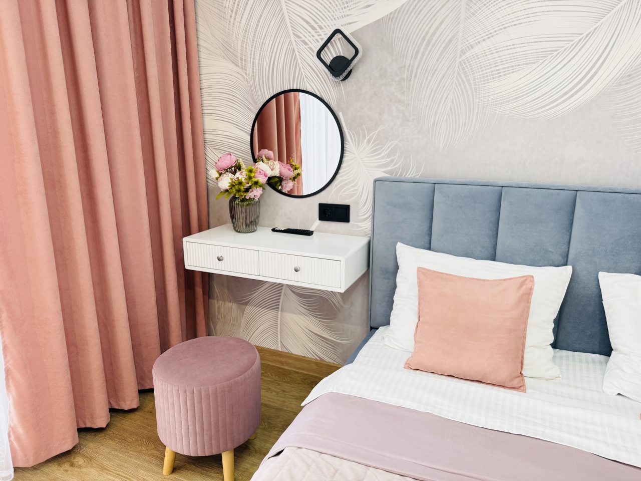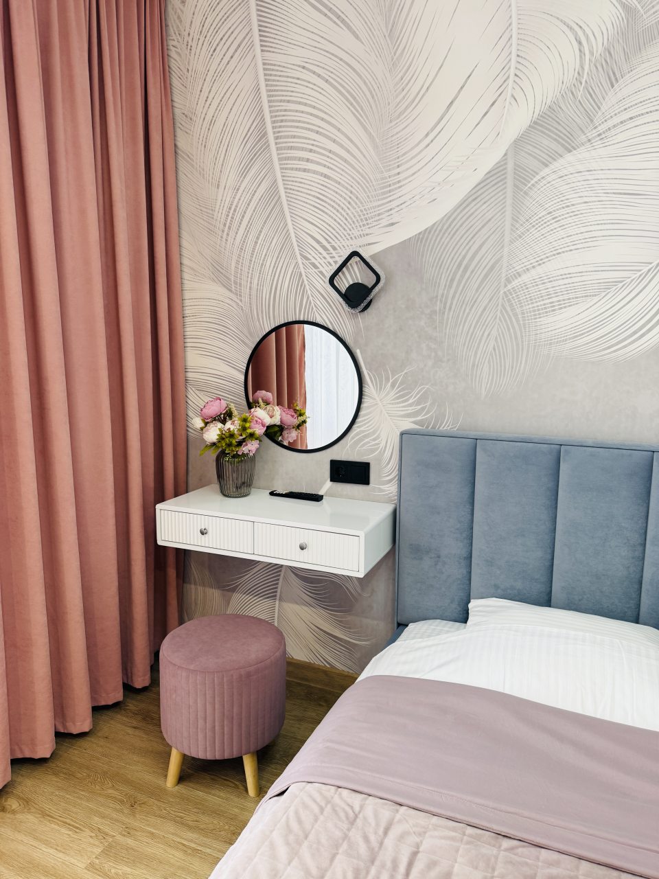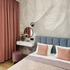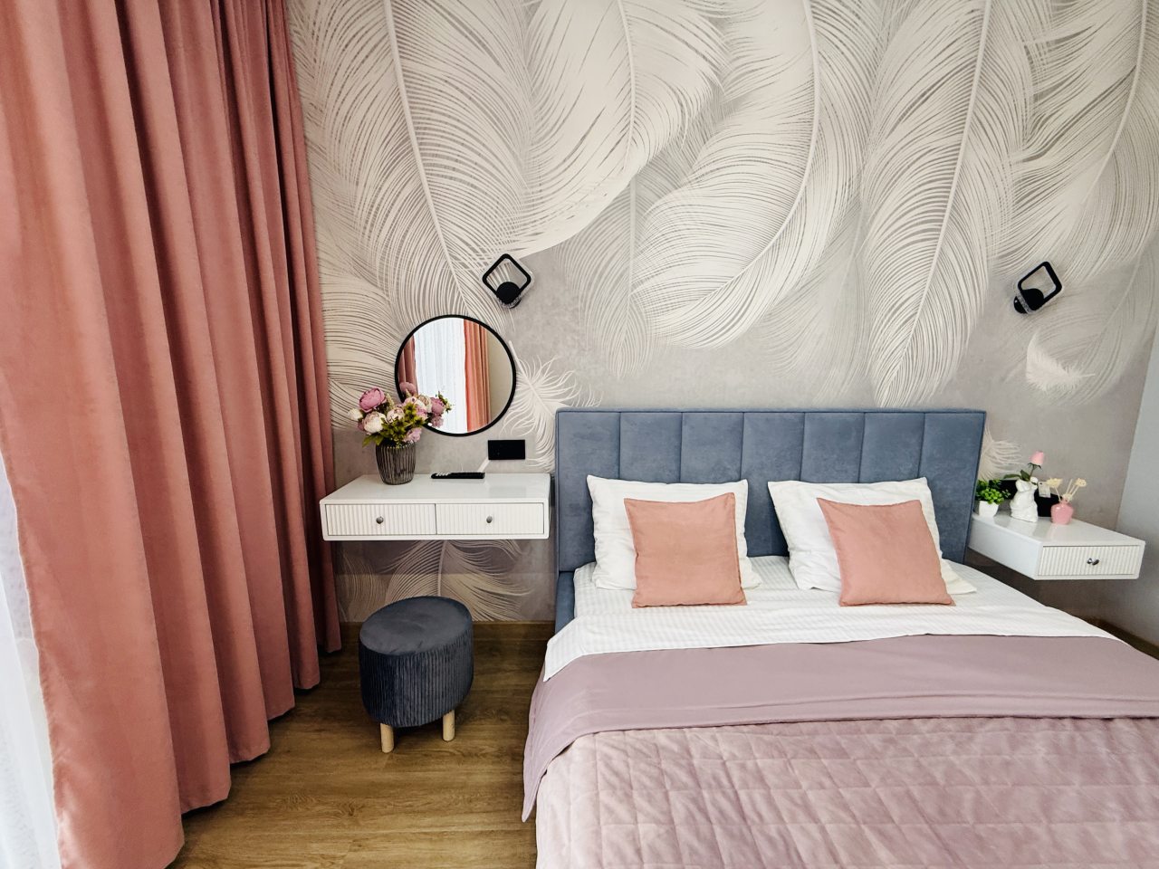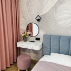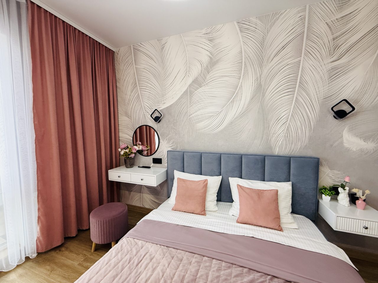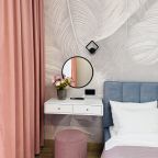 В Иркутске мы брали апартаменты на несколько дней. Красивый здесь интерьер, интересно оформлена спальная зона. Люстра красивая, свет есть в прикроватной зоне. Кровать с матрасом хорошая, с мягким изголовьем. При этом все вычищено, пыли, грязи даже в местах сгибов нет. На кухне предусмотрено все необходимое для приготовления еды. Санузел в таком же хорошем состоянии. Для хранения одежды организована гардеробная.