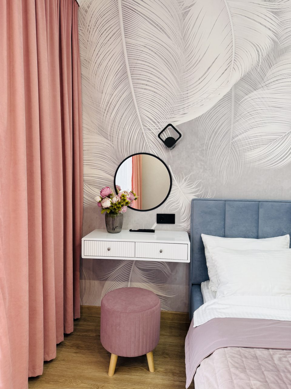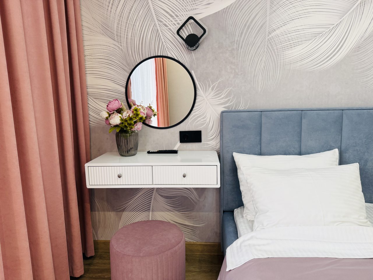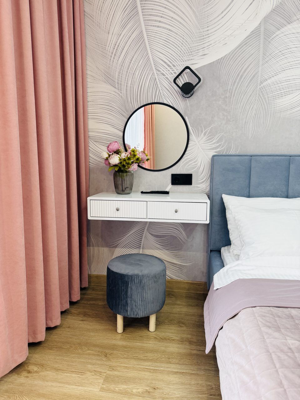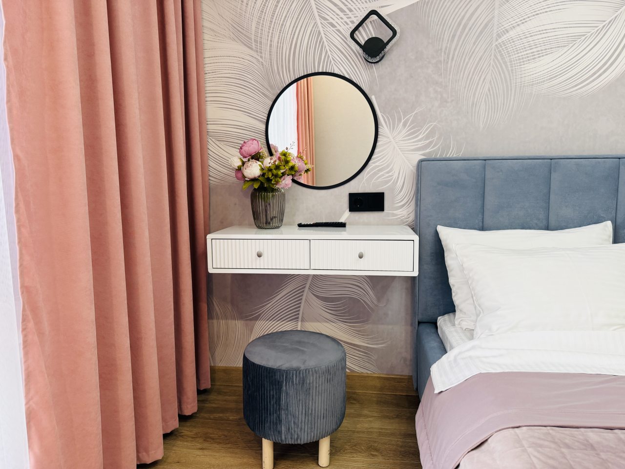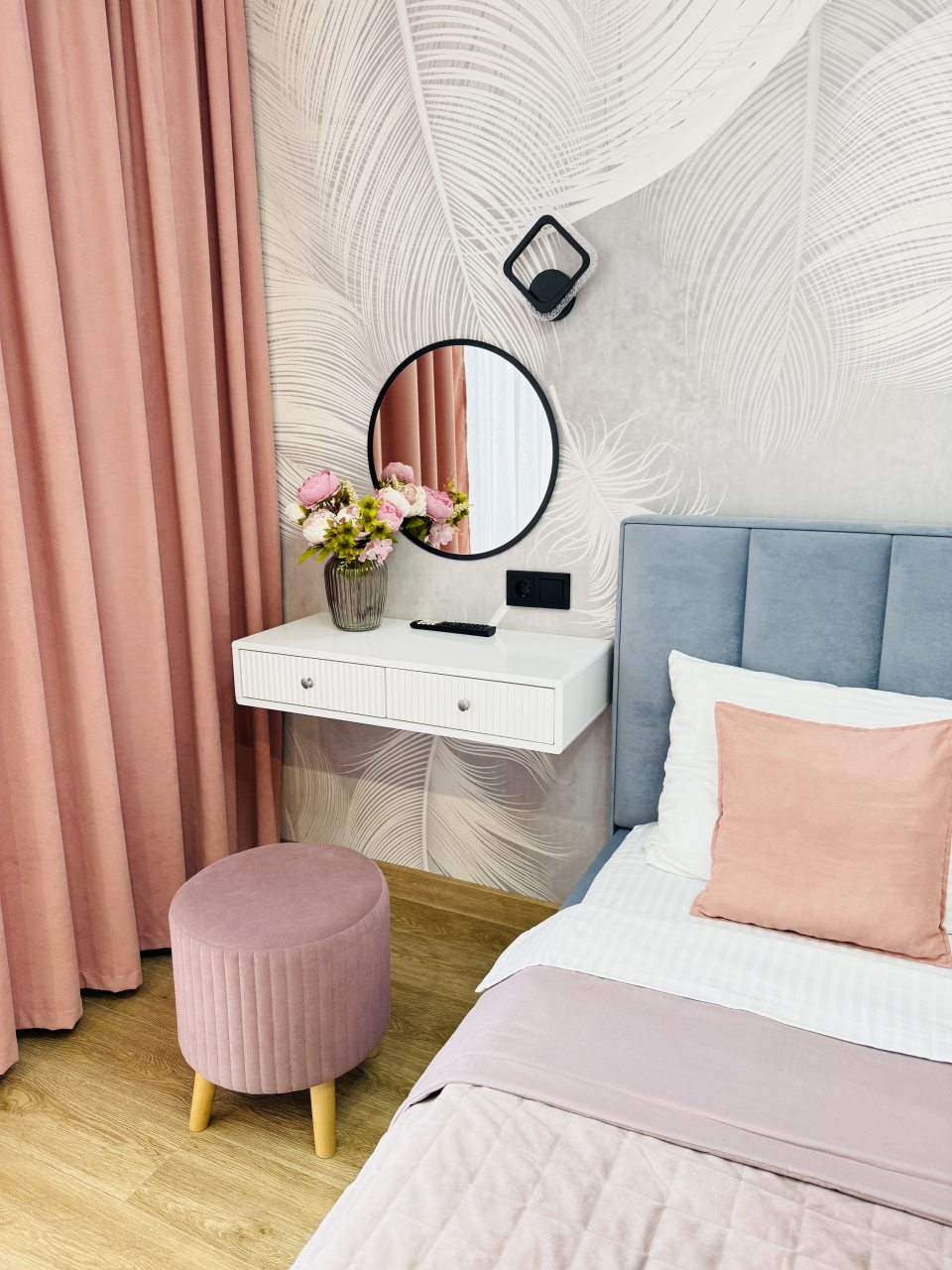 В Иркутске мы брали апартаменты на несколько дней. Красивый здесь интерьер, интересно оформлена спальная зона. Люстра красивая, свет есть в прикроватной зоне. Кровать с матрасом хорошая, с мягким изголовьем. При этом все вычищено, пыли, грязи даже в местах сгибов нет. На кухне предусмотрено все необходимое для приготовления еды. Санузел в таком же хорошем состоянии. Для хранения одежды организована гардеробная.